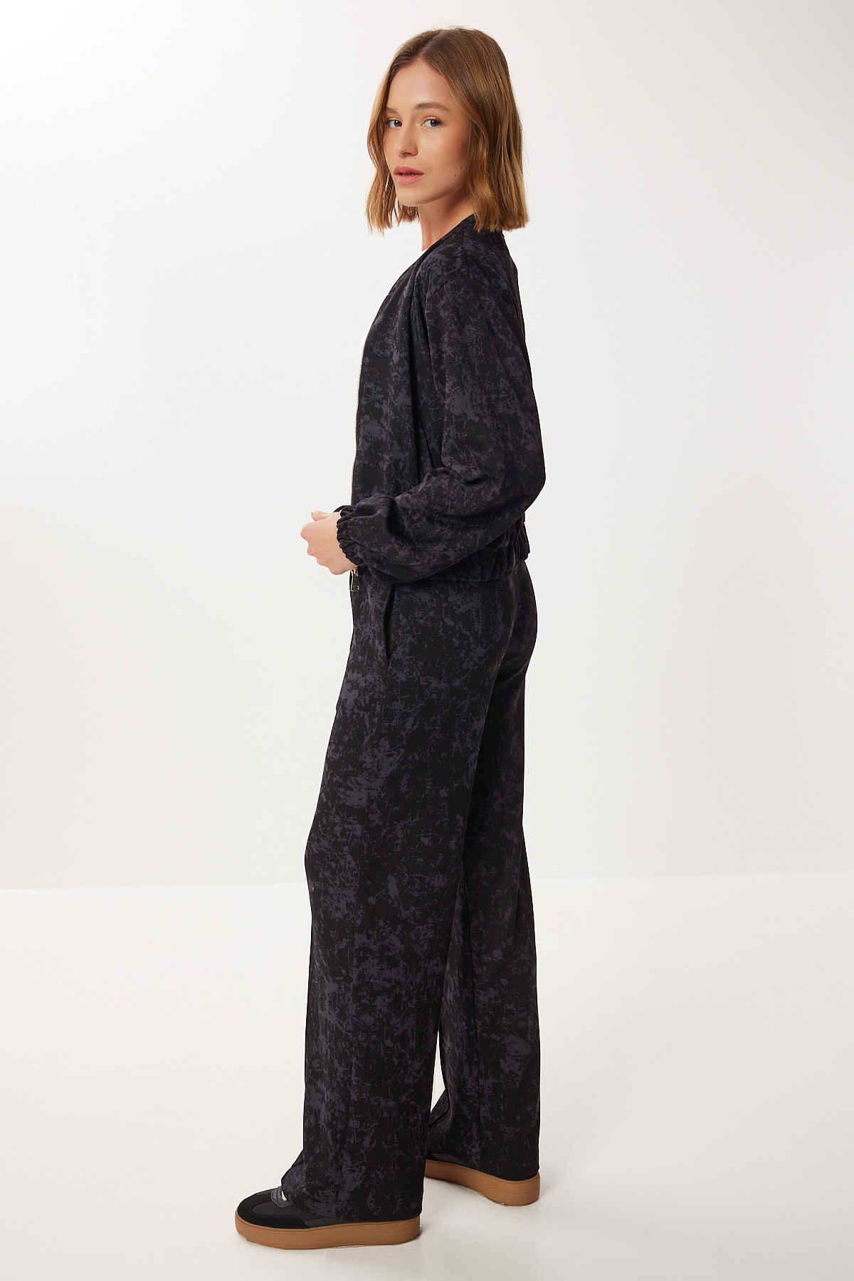 Bisiklet yaka, fermuar kapamalı, cepli, bomber sweatshirt ve elastik bel, yan cepli, nervürlü pantolondan oluşan desenli takımİçerik: %100 PolyesterÜrün Boyu: 51 cm Kol Boyu: 58 cm Pantolon Boyu: 106 cm 30° makinede yıkanabilir.