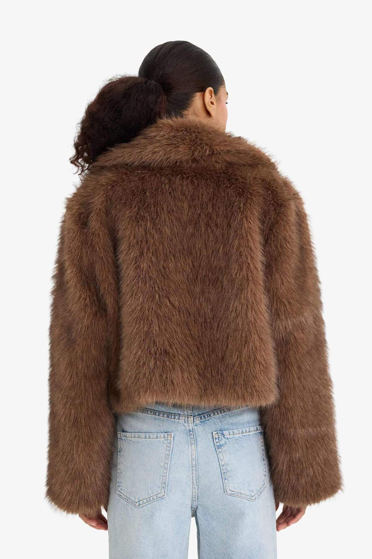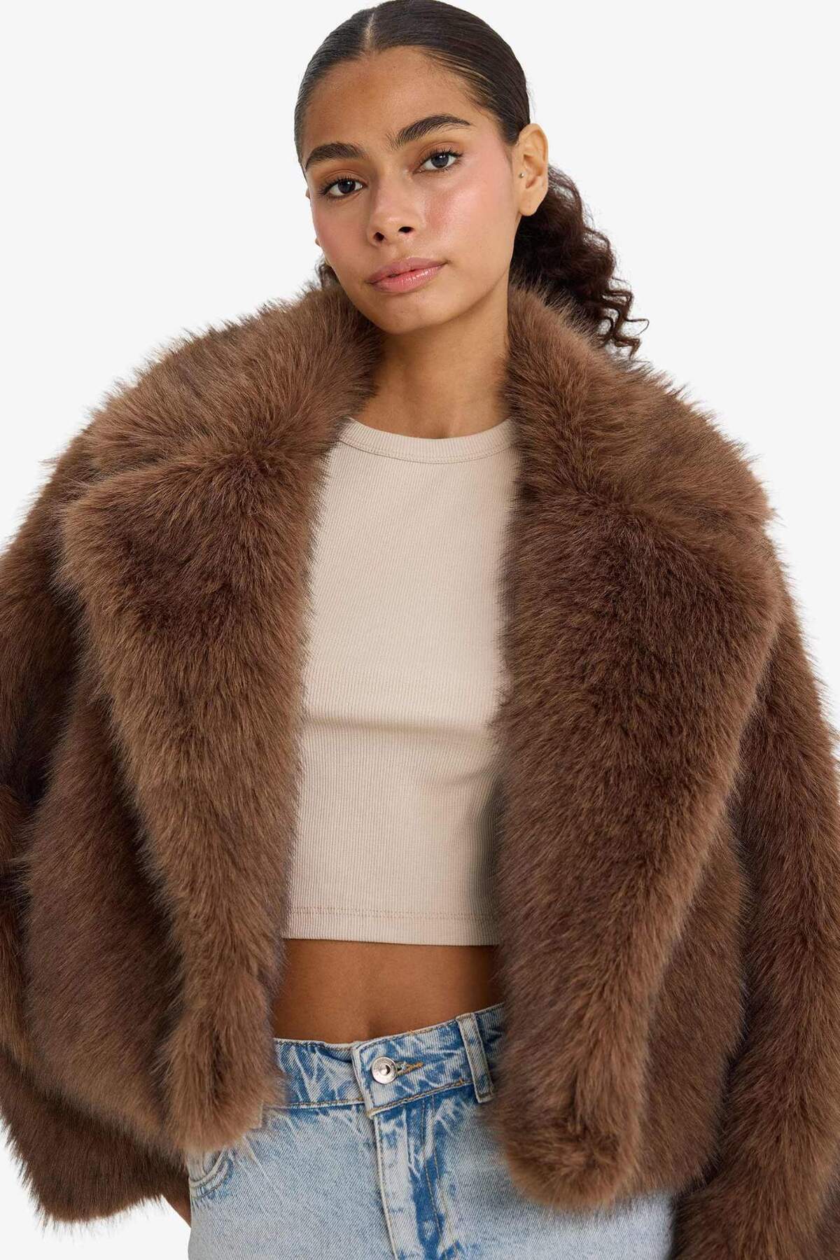 Regular Fit Düğmeli Kısa Suni Kürk, yumuşak dokusu ve kısa kesimiyle hem sıcak hem şık bir kullanım sunar.