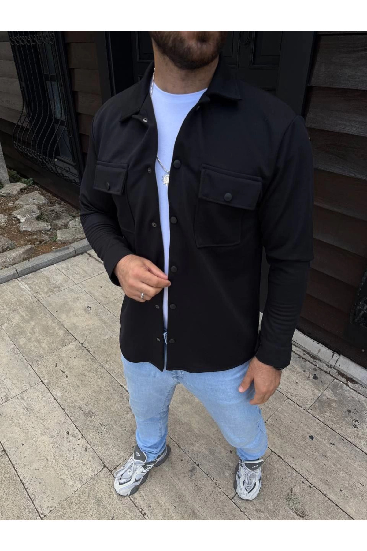 Erkek Diagonal Kumaş Cepli Çıtçıtlı uzun Kollu, Gömlek Oversize Rahat Kalıp Günlük Şık Stil - Siyah