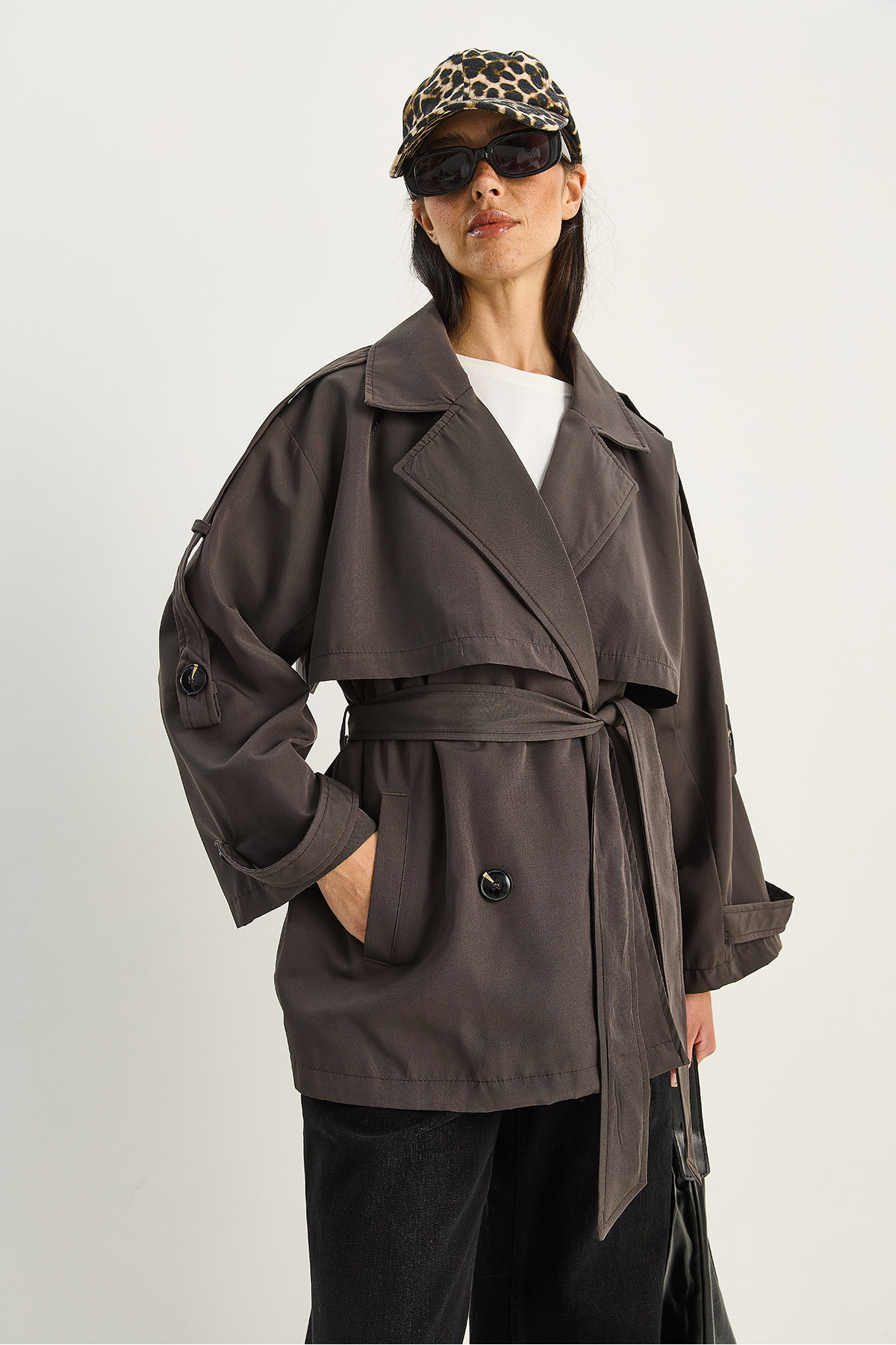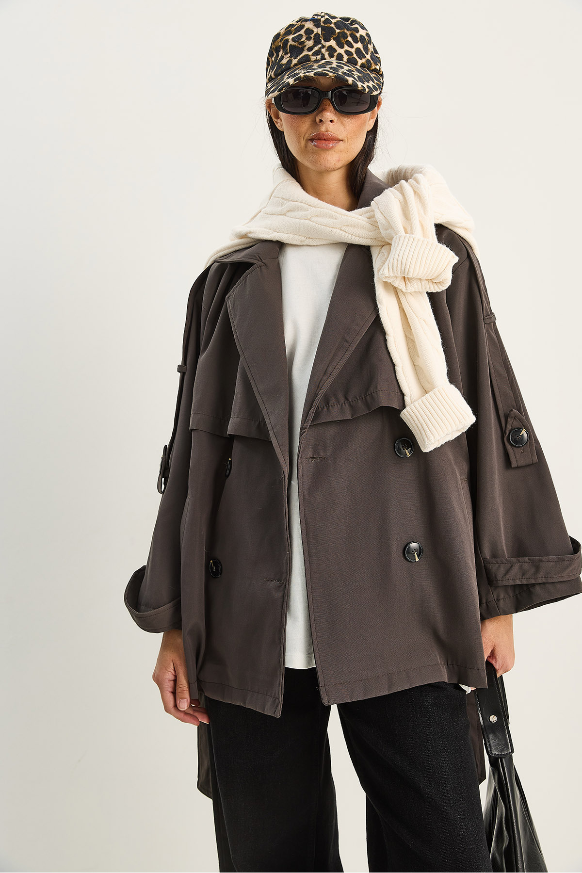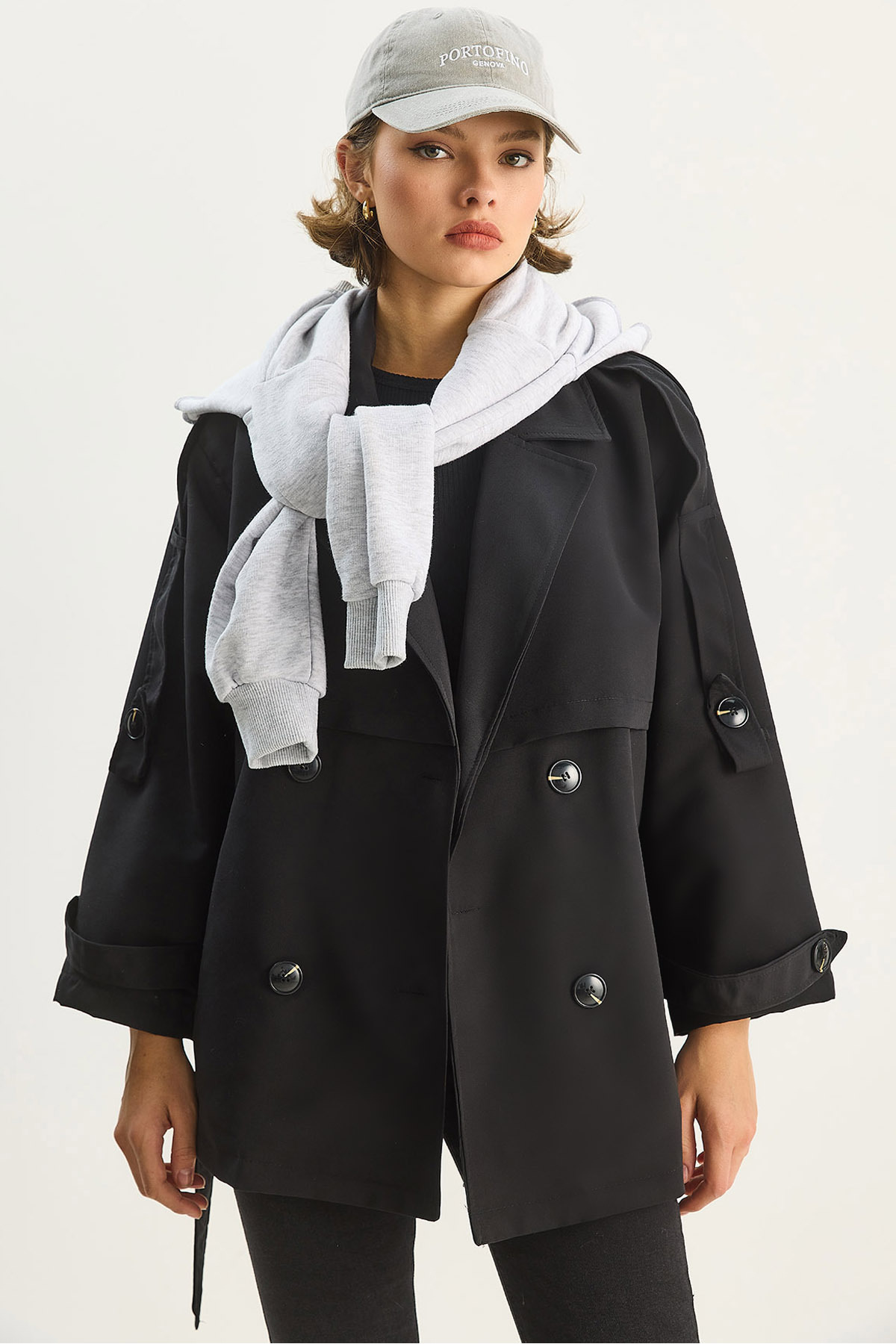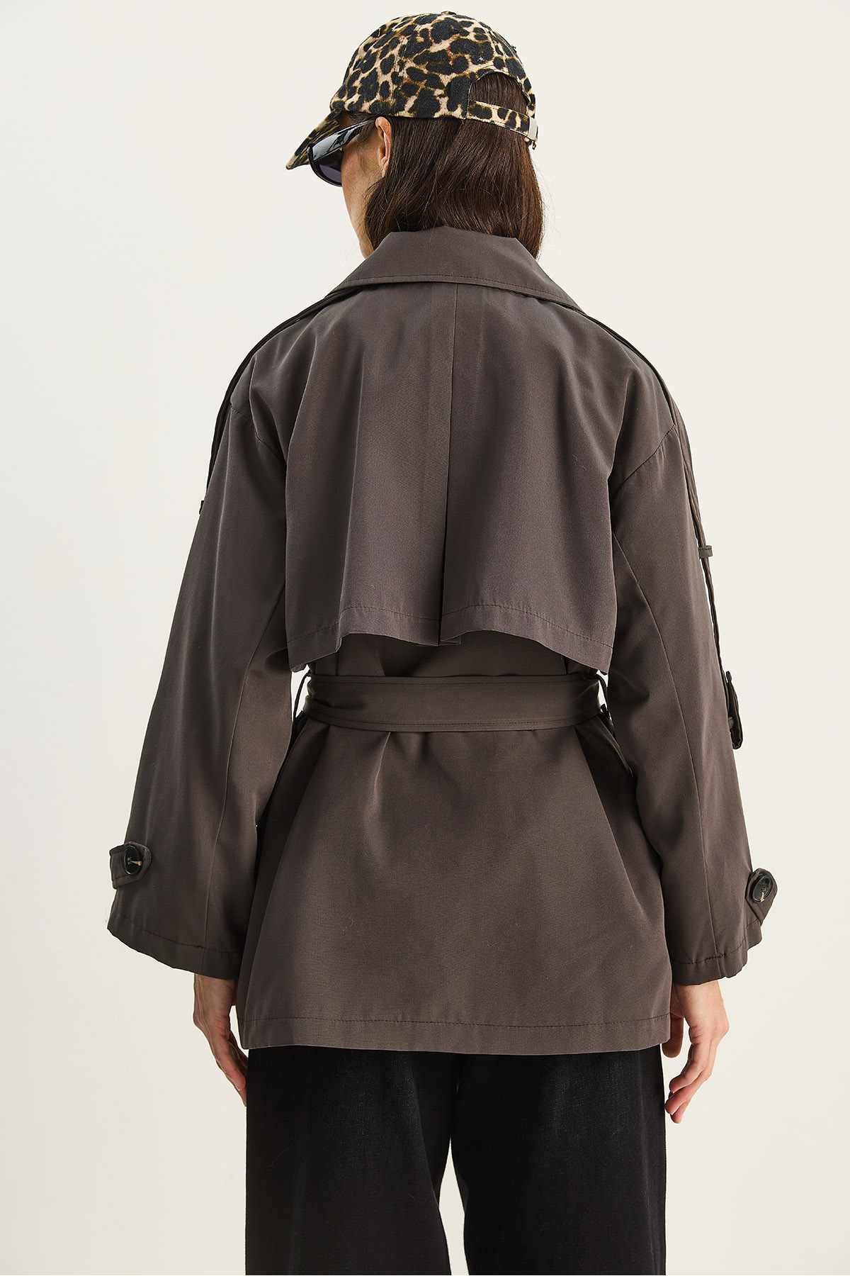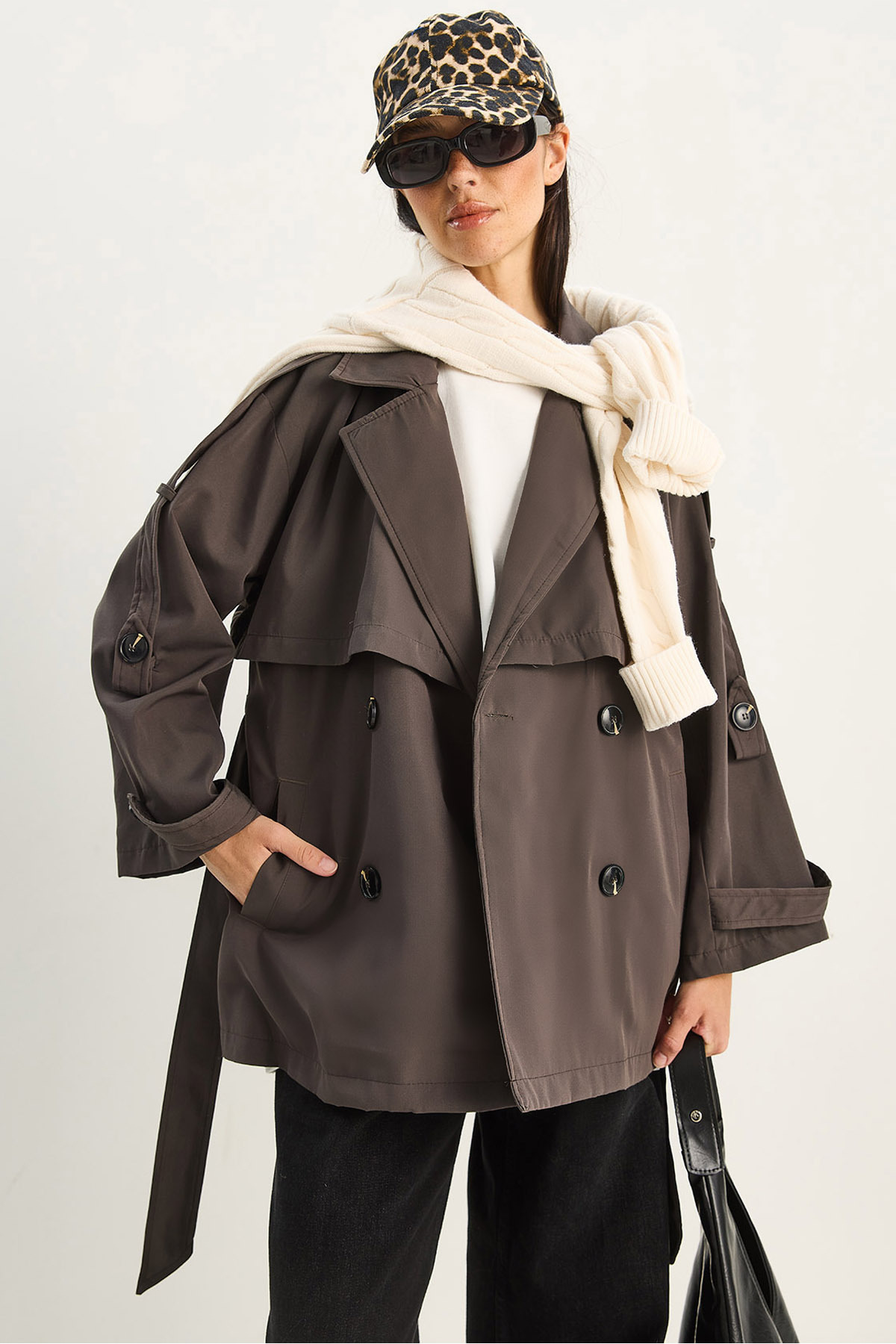 Klasik şıklığı modern kesimle buluşturan bu astarlı kısa trenchcoat, her sezon stilinizi tamamlayacak zamansız bir parça.