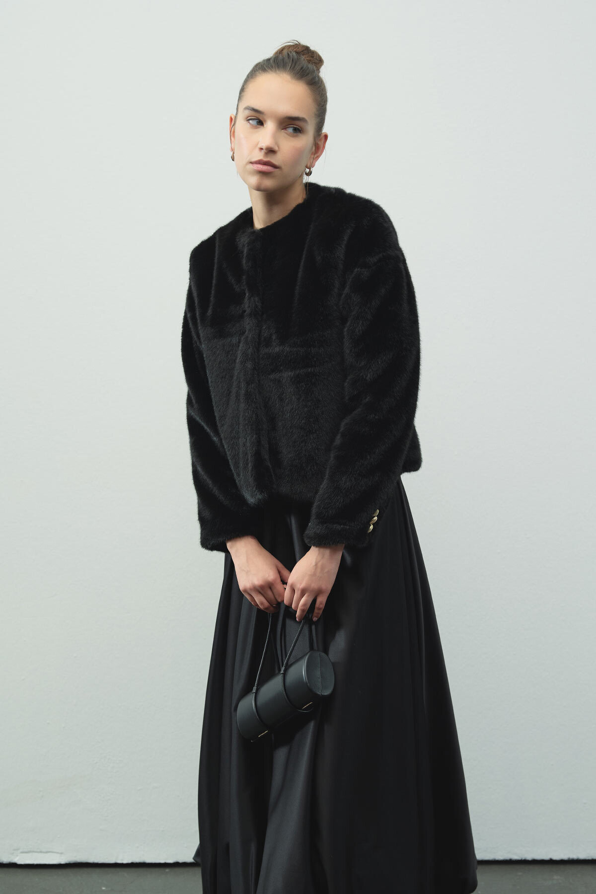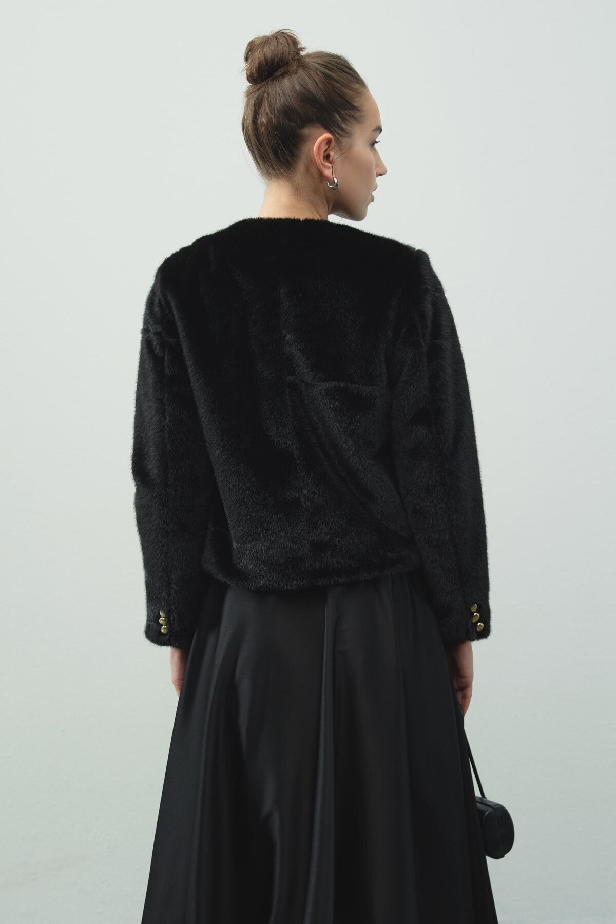 Bisiklet yaka, düğme kapamalı, kolları süs düğmeli, normal kalıp, astarlı kısa düğmeli pelüş ceket.