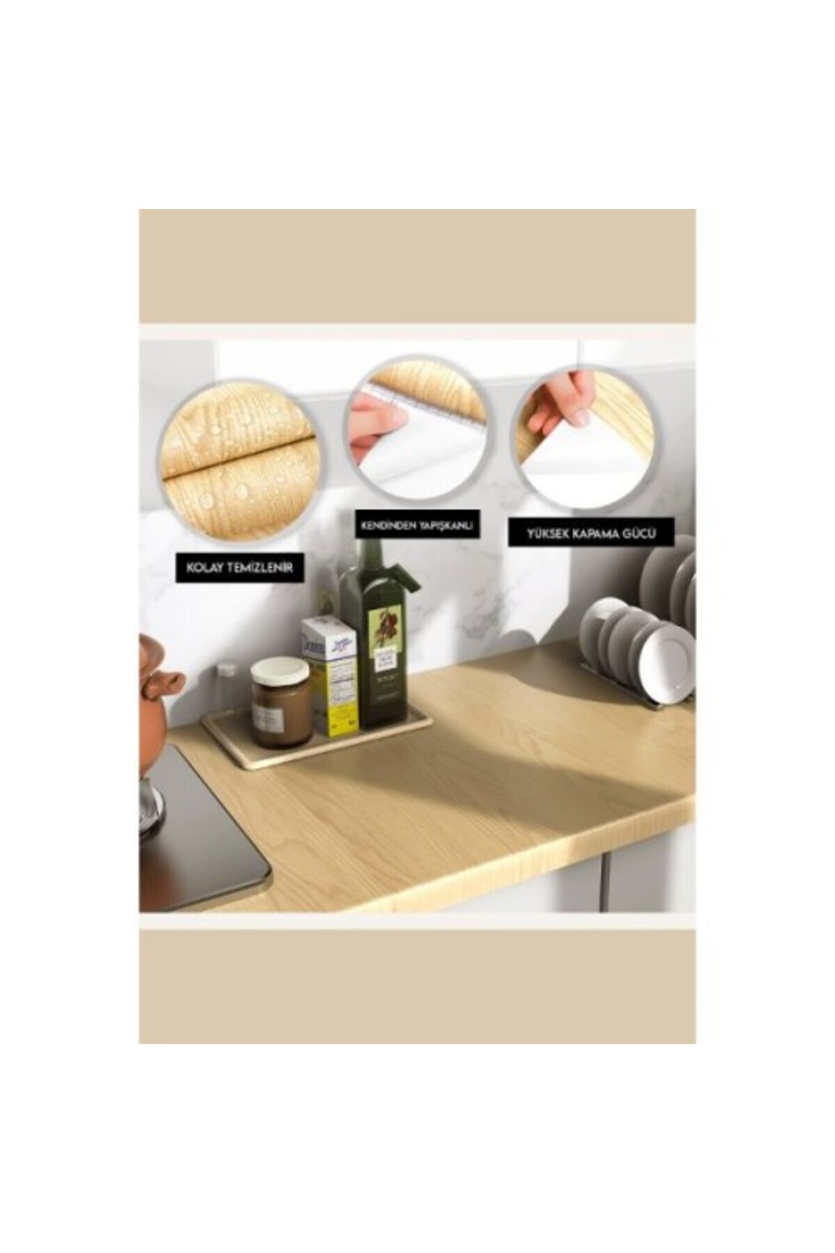 AHŞAP GÖRÜNÜMLÜ KENDİNDEN YAPIŞKANLI KAPLAMA FOLYOSU 5 METRE Ürün Özellikleri Mutfak, banyo dolapları, tezgah, mobilya gibi alanlarda kaplama yapılabilir.