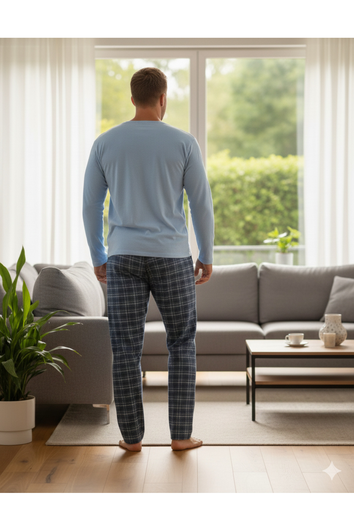 -MAVİ renk seçeneğiyle şıklığı ve rahatlığı bir arada sunan erkek uzun kol pijama takımı, evdeki konforunuzu artırır.