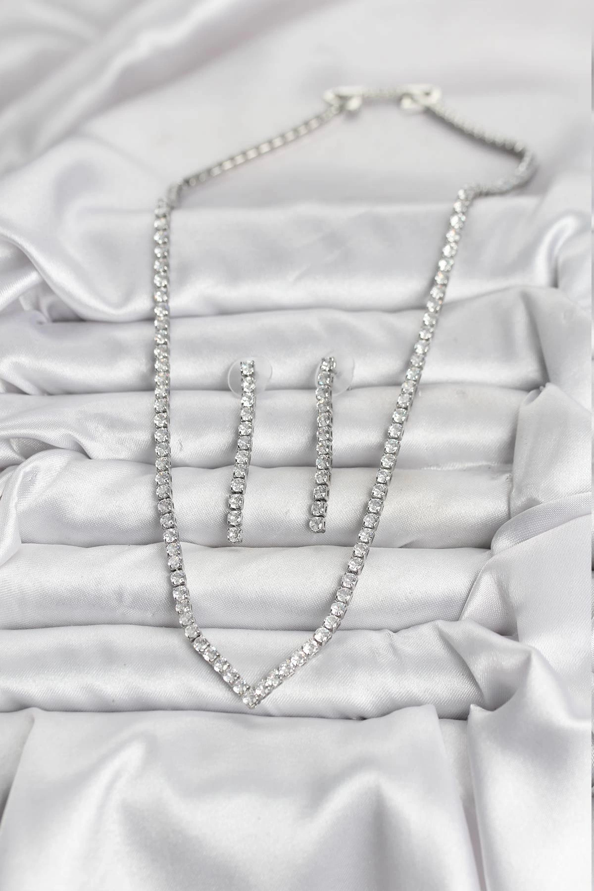 BFS Gümüş Renk Zirkon Taşlı Kadın Kolye Küpe Seti