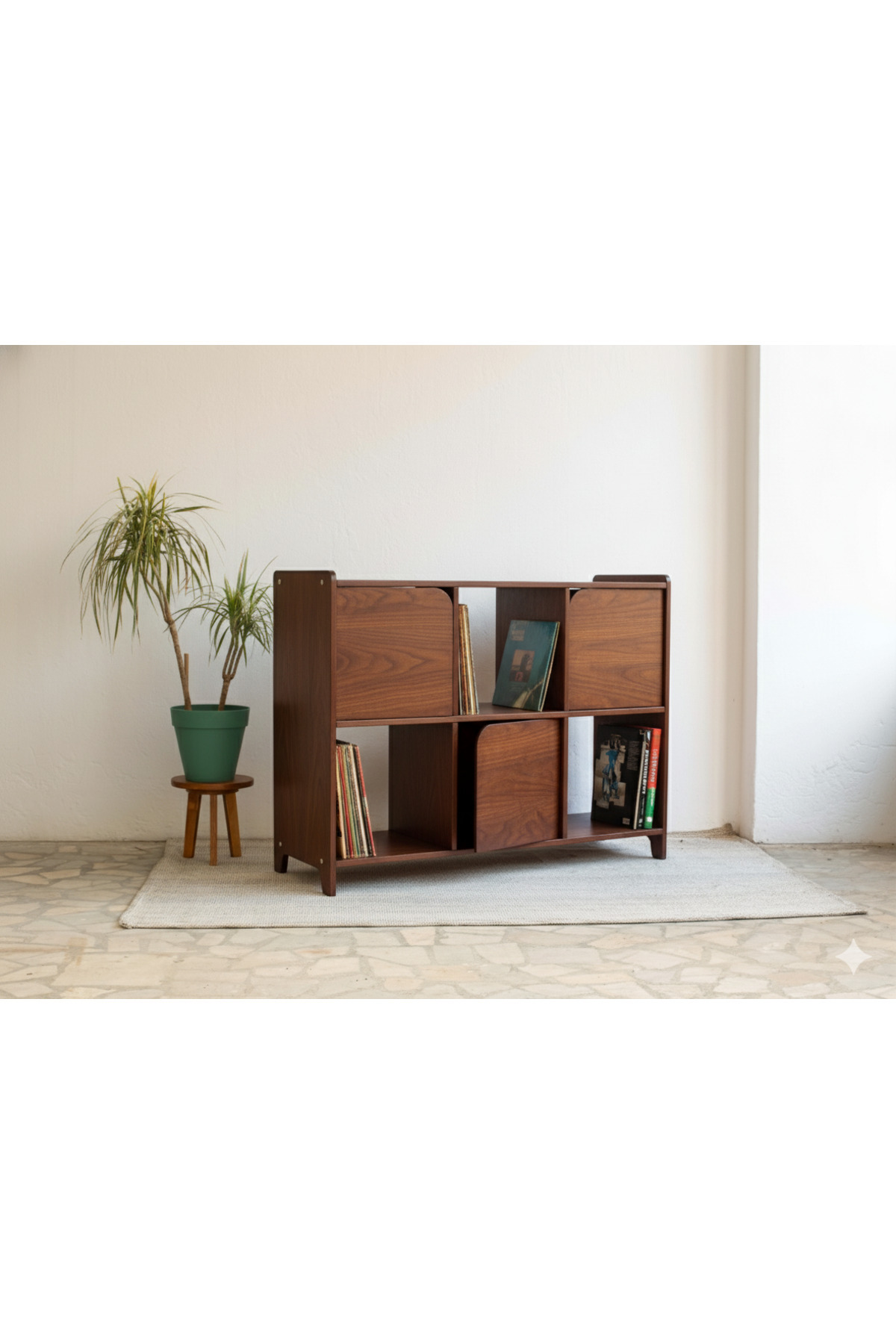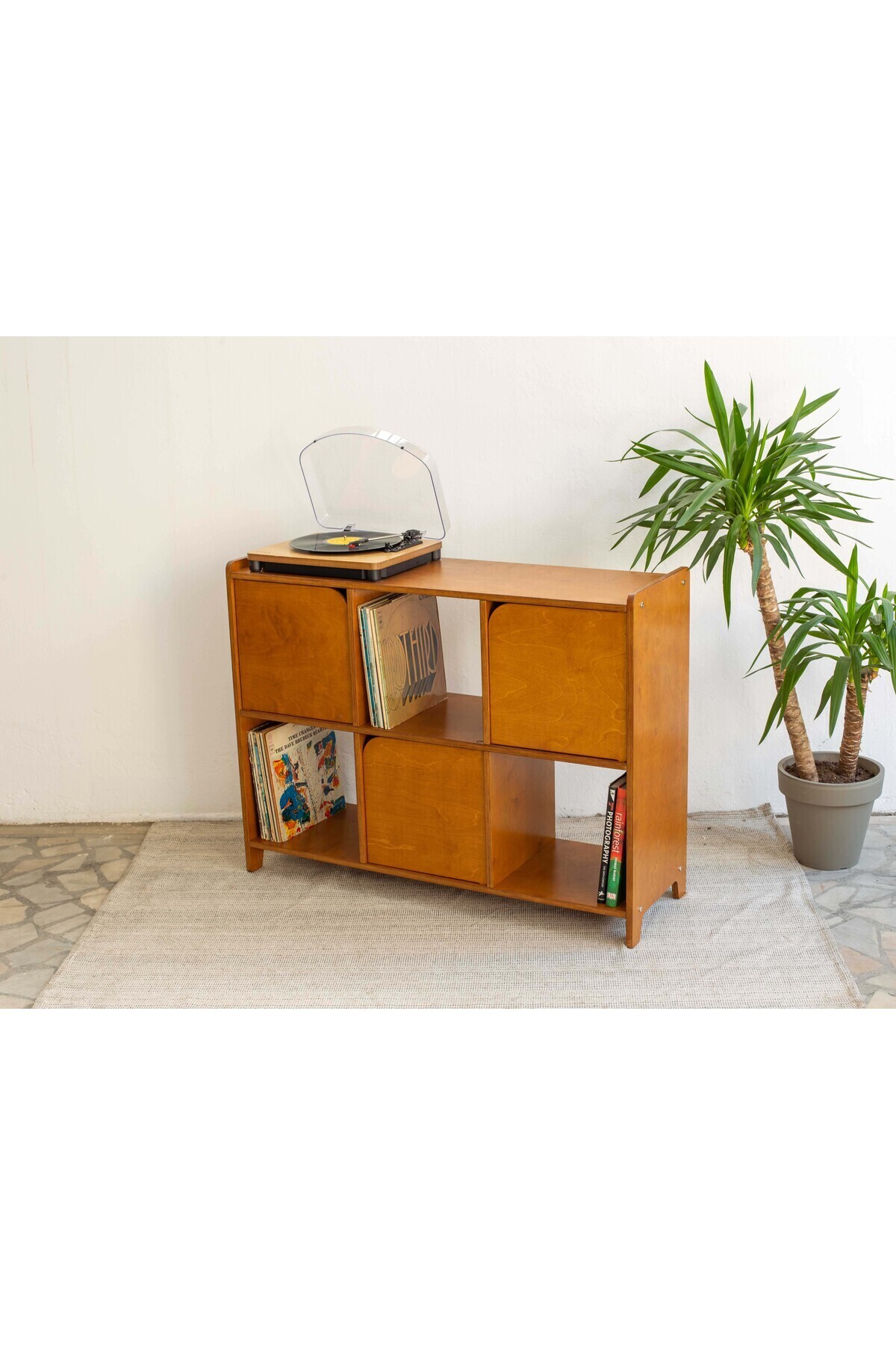6 Bölmeli Ahşap Plak ve Pikap Dolabı Ceviz Büfe Plaklık Konsol Bal