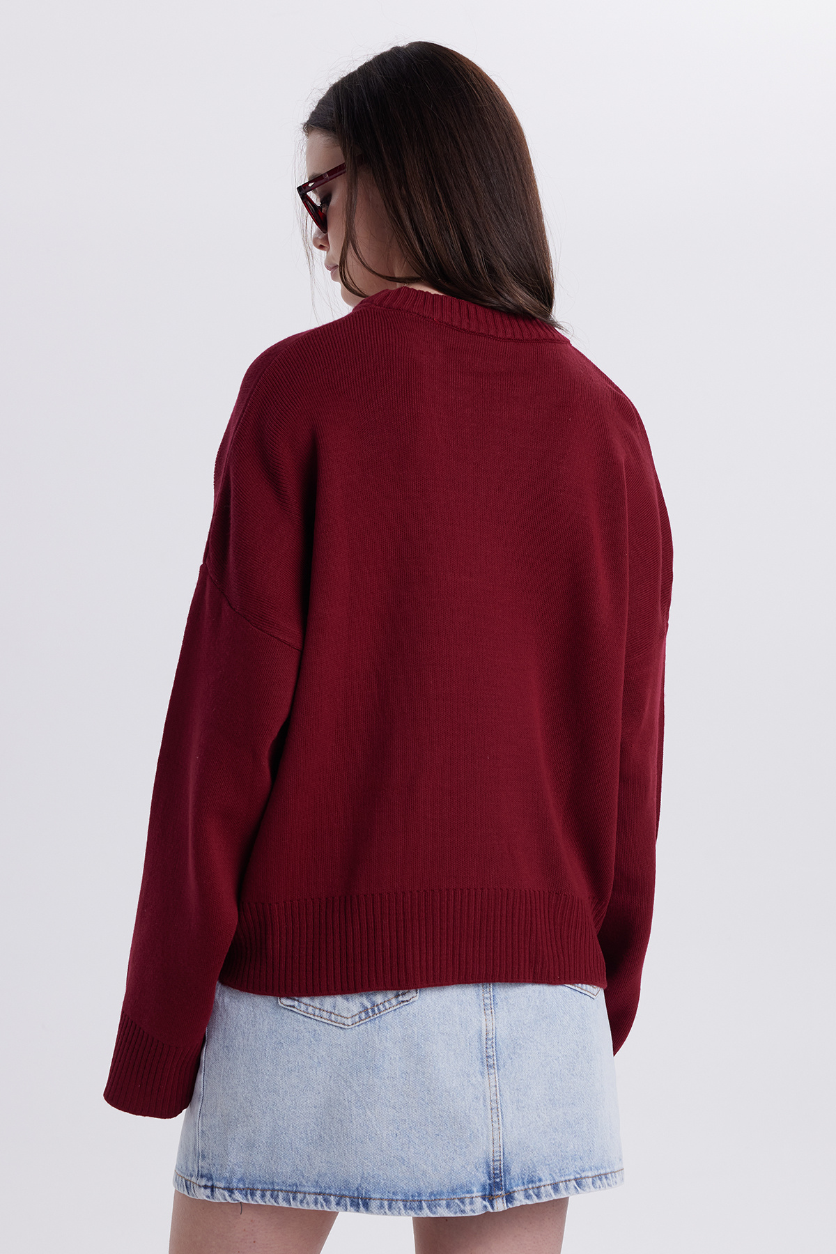 Kadın Oversize Geniş Kesim Bisiklet Yaka Bordo Kazak