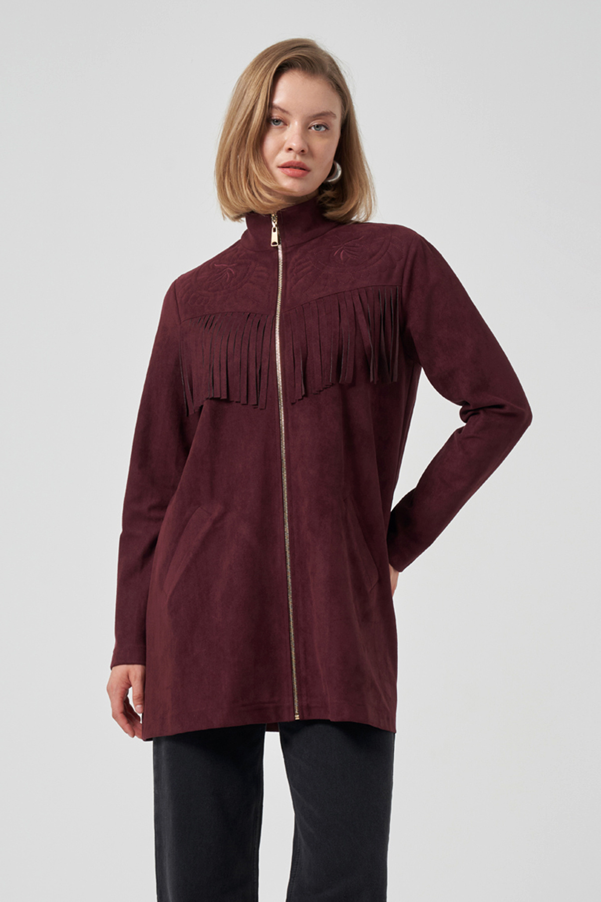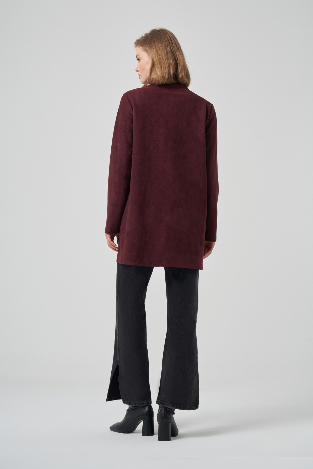 - Mürdüm rengiyle dikkat çeken bu süet ceket, bordo tonlarıyla zengin bir görünüm sunar.
