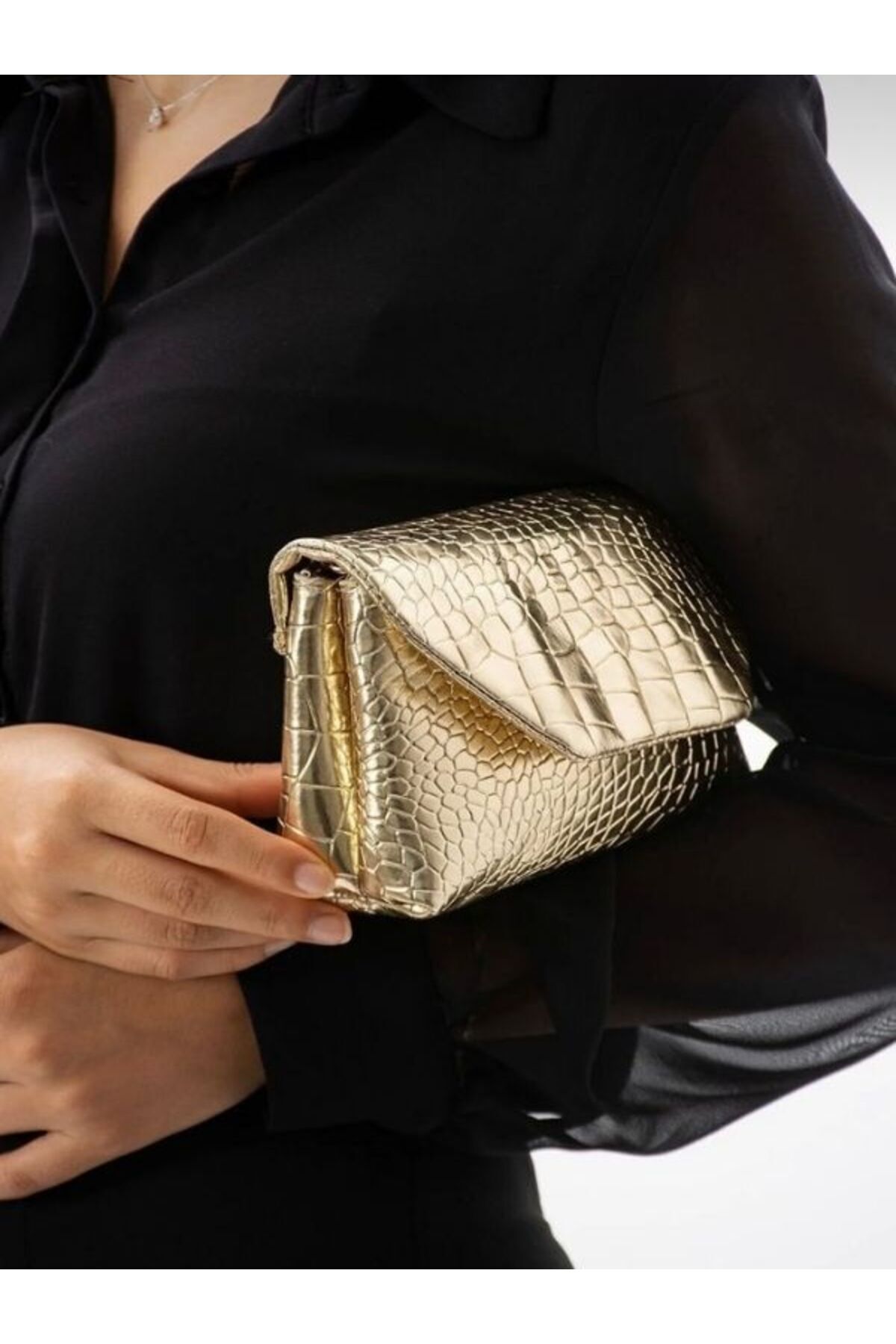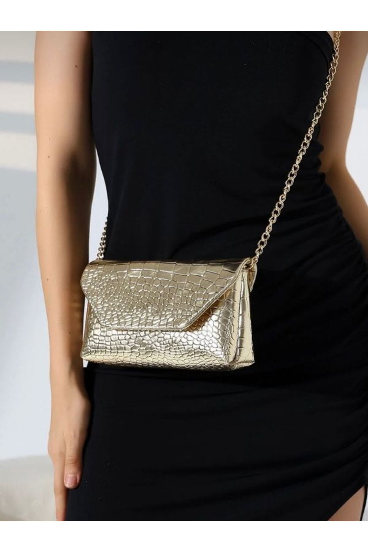Gold Kadın Zincirli Kroko Luna Clutch Çapraz Kol ve Omuz Çantası 1006-1