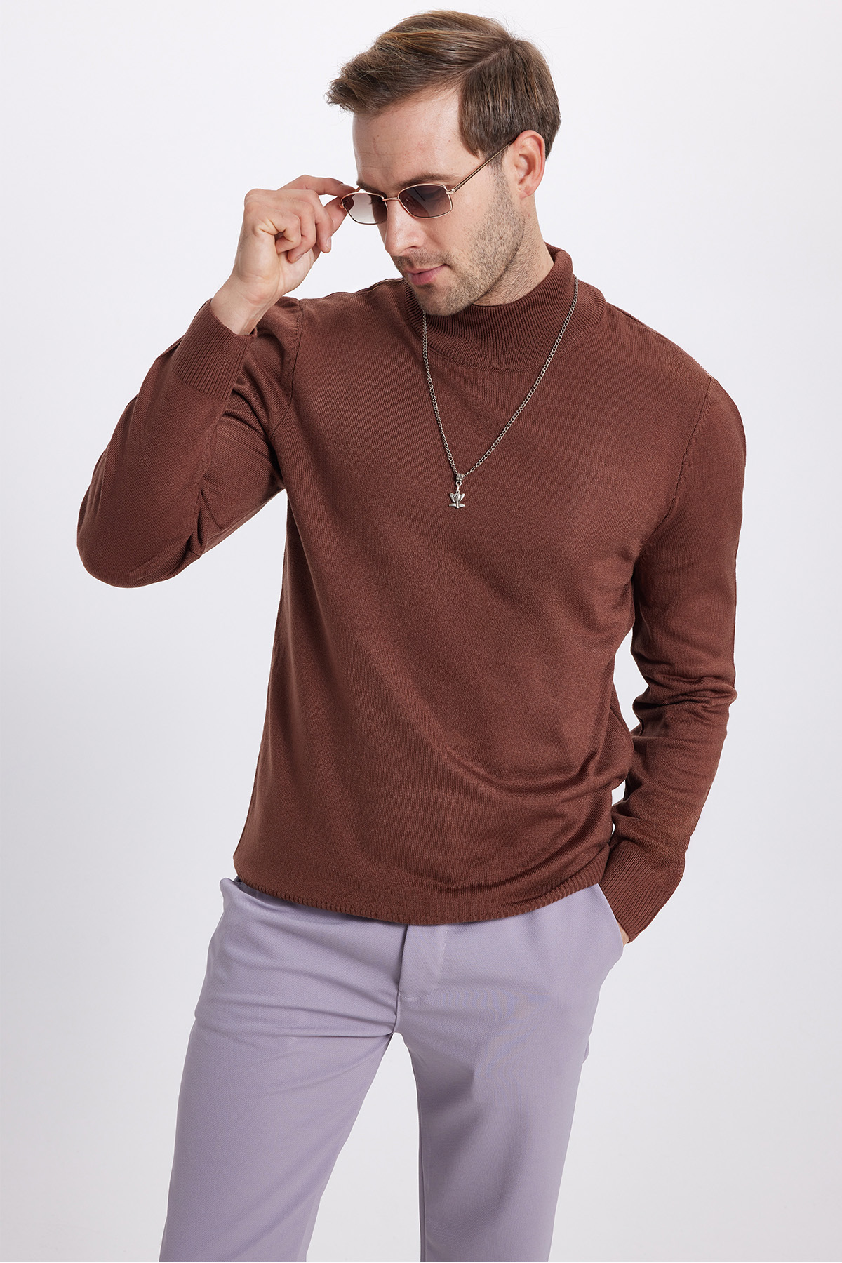 Erkek Slim Fit Dar Kesim Yumuşak Dokulu Tüylenmeyen Kahverengi Yarım Balıkçı Yaka Triko Kazak