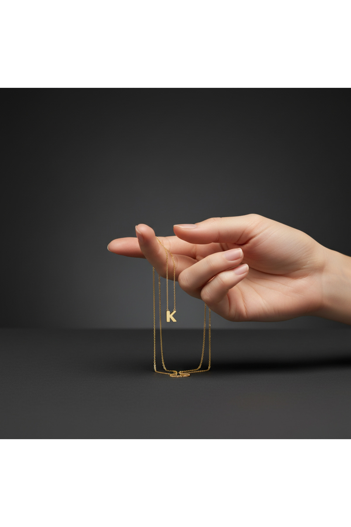 Bu güzel altın kolye, "K" harfi şeklinde tasarlanmıştır.
