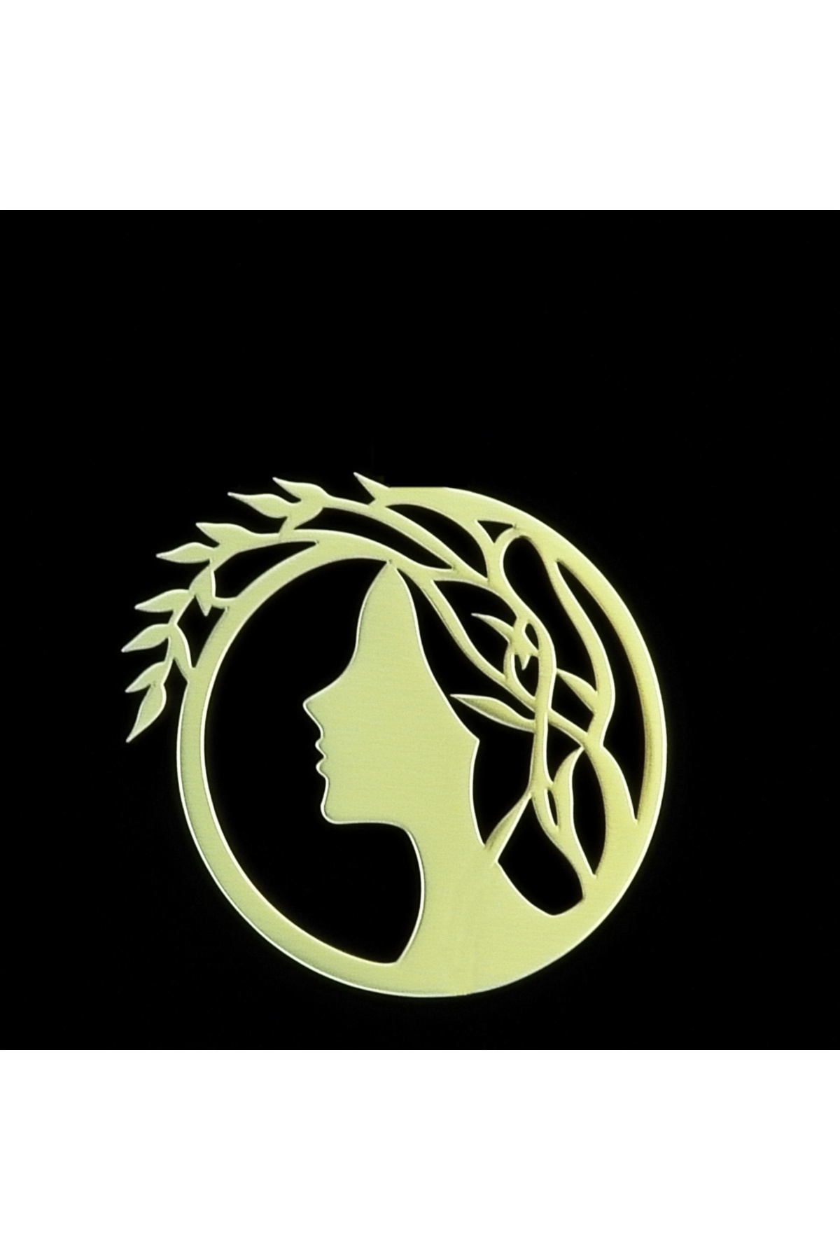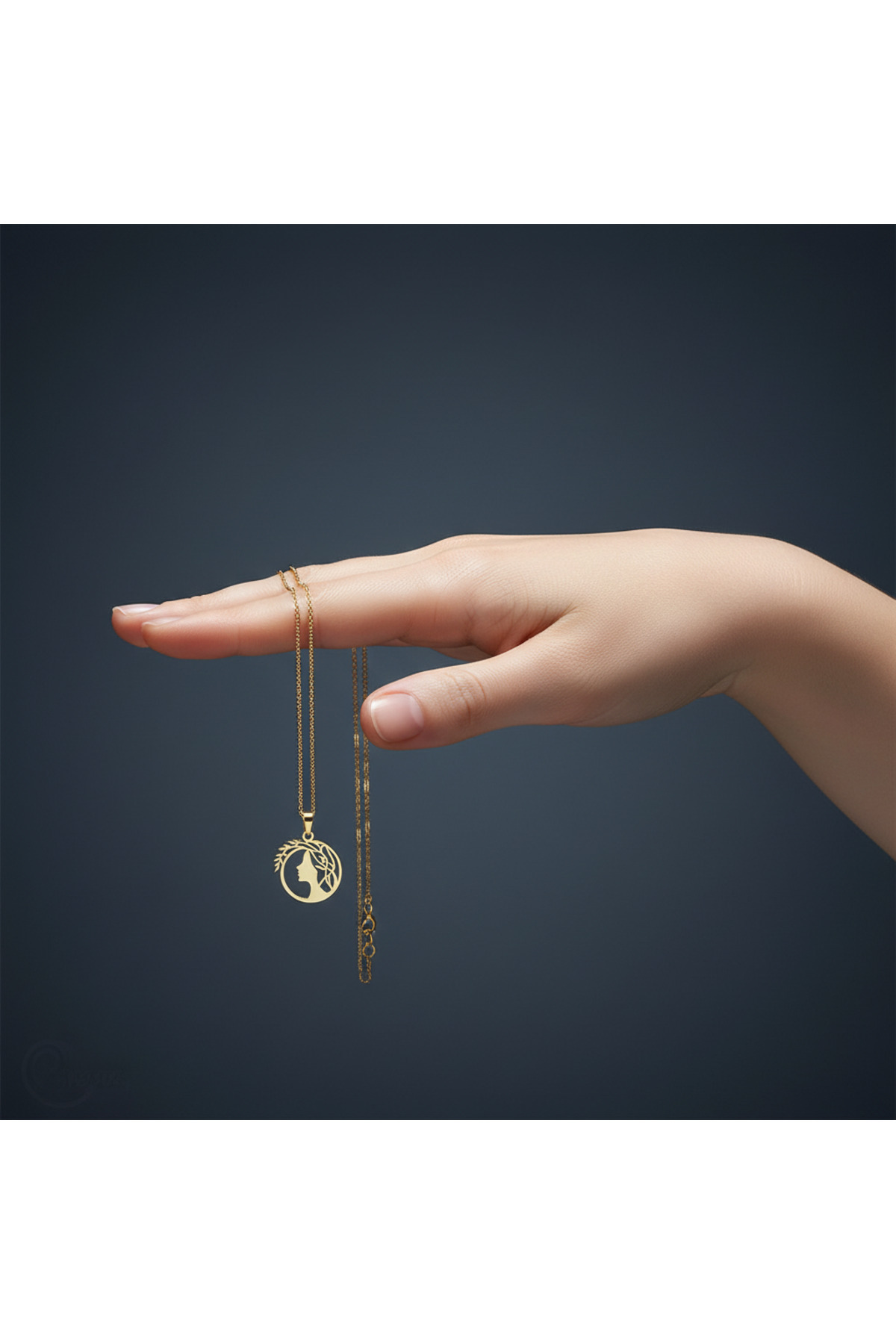 Bu altın kolye, uzun ve dalgalı saçlarıyla bir kadın silüeti şeklinde tasarlanmış güzel ve karmaşık bir görünüme sahip.