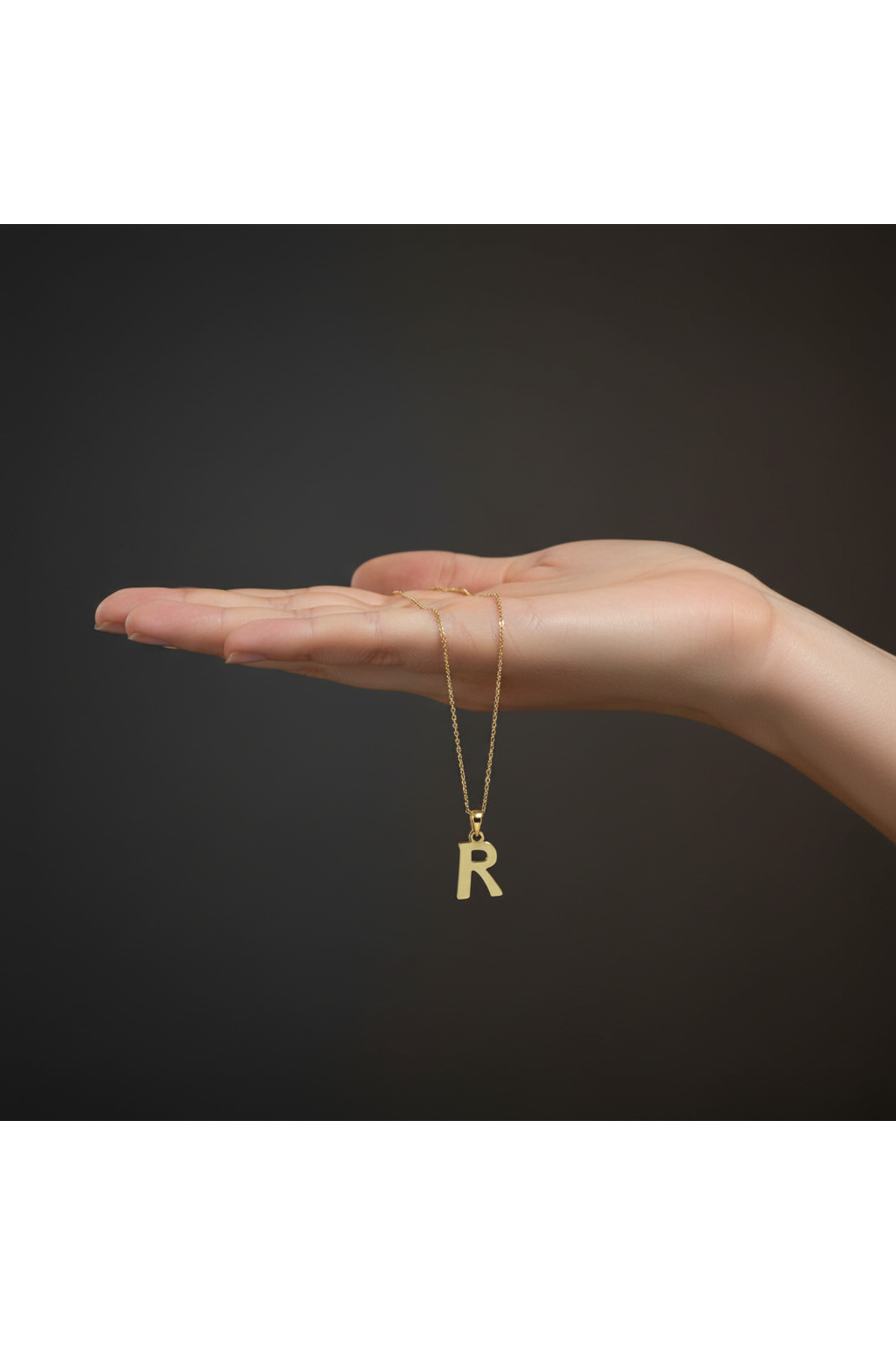 Bu güzel altın kolye, "R" harfi şeklinde tasarlanmıştır.
