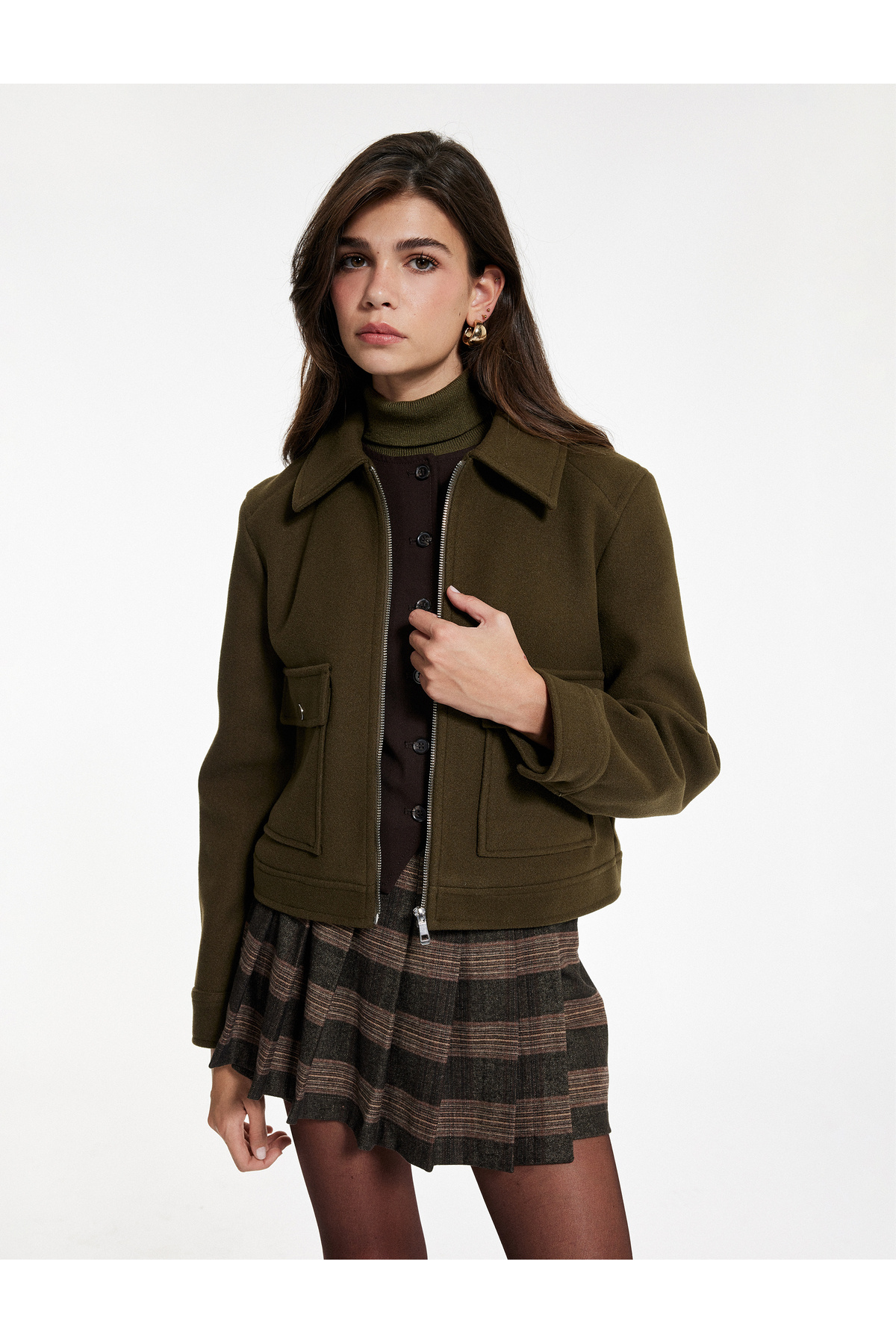 Uzun Kollu Fermuar Detaylı Cepli Crop Kaşe Ceket