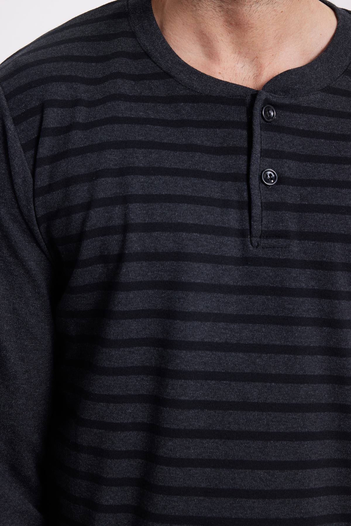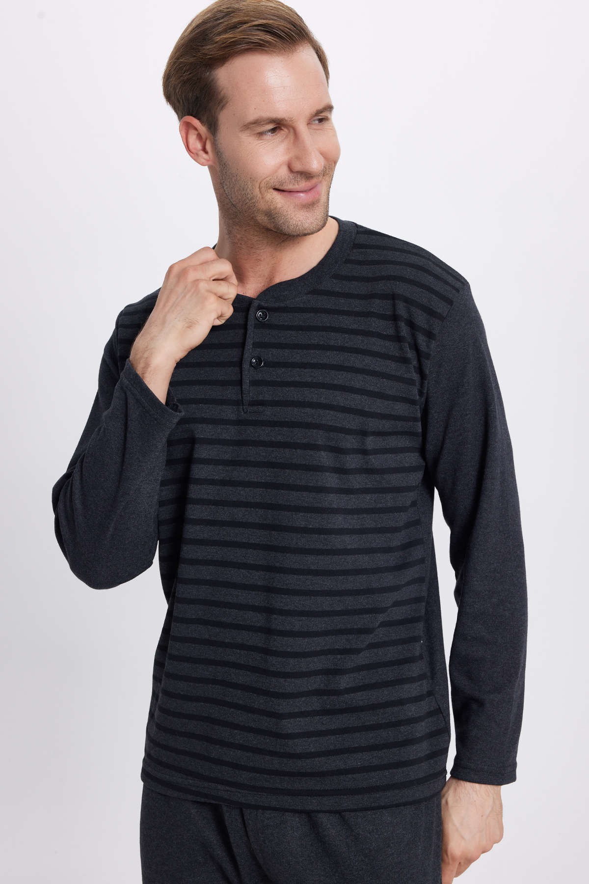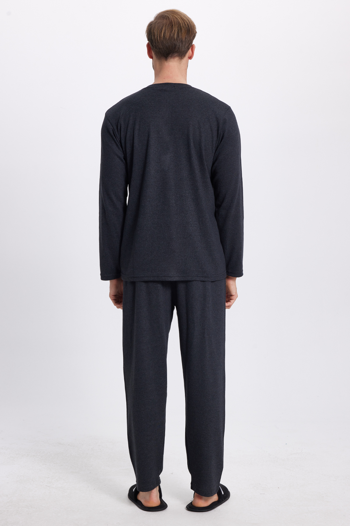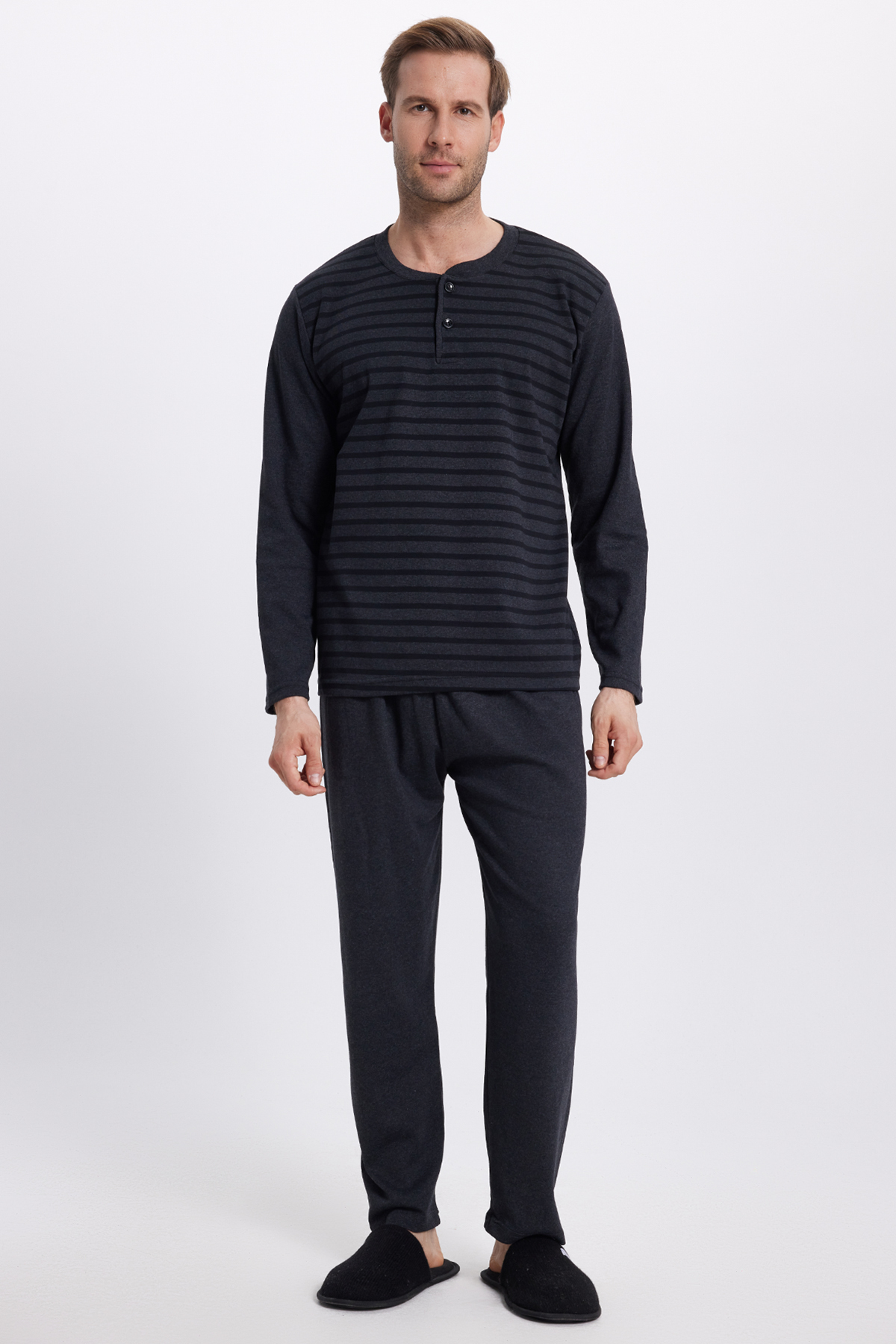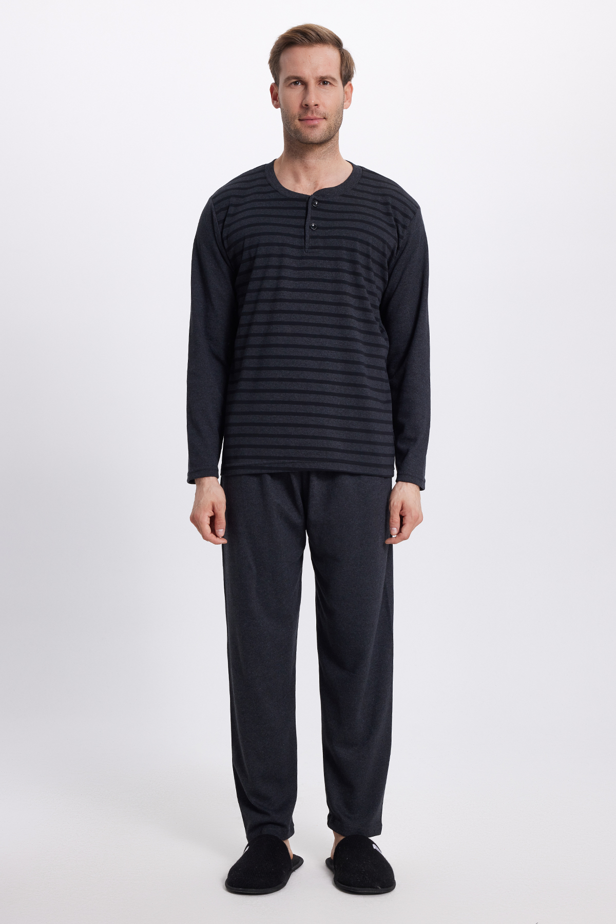 Erkek Regular Fit Pamuklu Düğmeli Yaka Beli Lastikli Desenli Siyah Pijama Takımı
