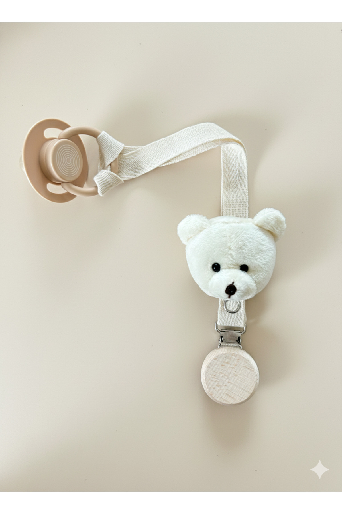 Bebek Emzik Askısı / Emzik Askılığı - Ayıcık Desenli, Krem Renk Sevimli Ayıcık ve Ahşap Klipsli