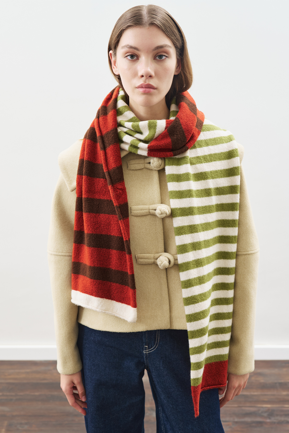 Çizgili uzun atkı,trikoAna Kumaş:Yalnızca elde soğuk suyla yıkayınızÇamaşır suyu / beyazlatıcı kullanılmazDüşük sıcaklıkta ütüleyinizKuru temizleme yapılmazKurutucu kullanılmaz.