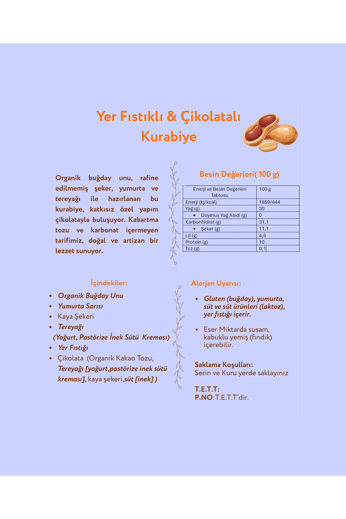 Gluten (buğday), yumurta, süt ve süt ürünleri (laktoz), susam, yer fıstığı ve fındık içerir. Eser miktarda diğer kabuklu yemişleri içerebilir.