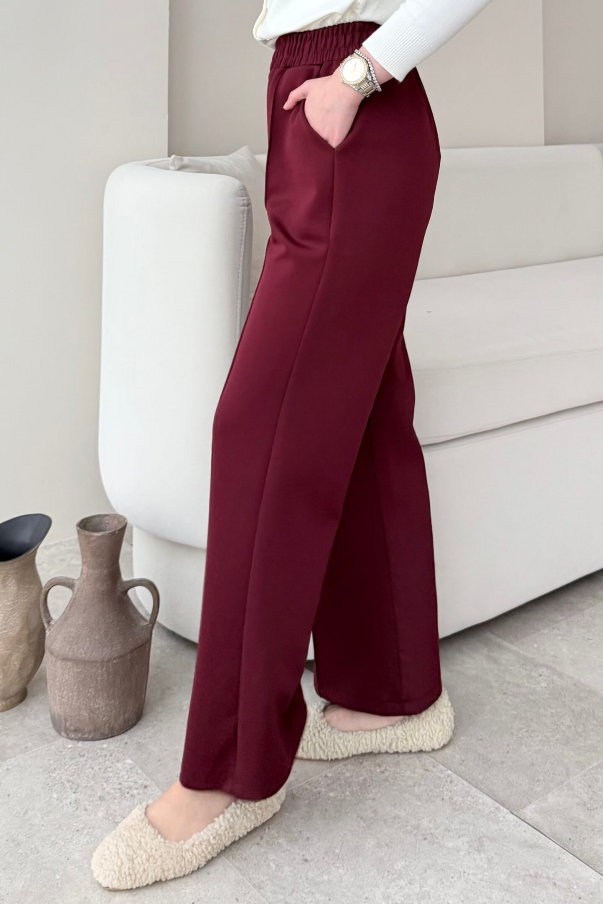Kadın Çimalı Beli Lastikli Cepli Scuba Kumaş Tesettür Pantolon- Bordo
