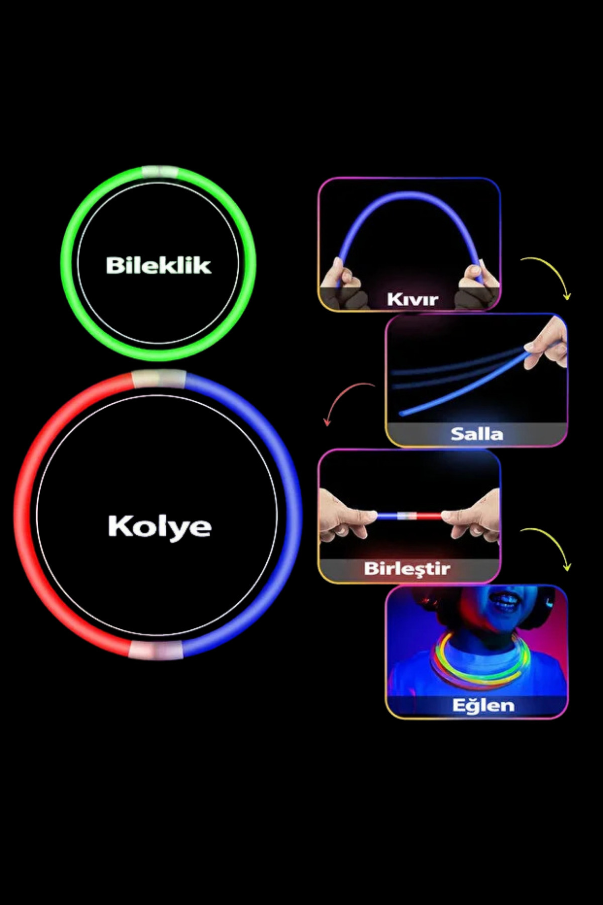 - İçindeki Renkler: MOR, TURUNCU, SARI, MAVİ, KIRMIZI, YEŞİL - Fosforlu Neon Parti Çubukları yeni jenerasyon ürün olup parlaklığı maksimum olduğu gibi parlaklık verdiği zaman ölçüsü de oldukça uzundur.