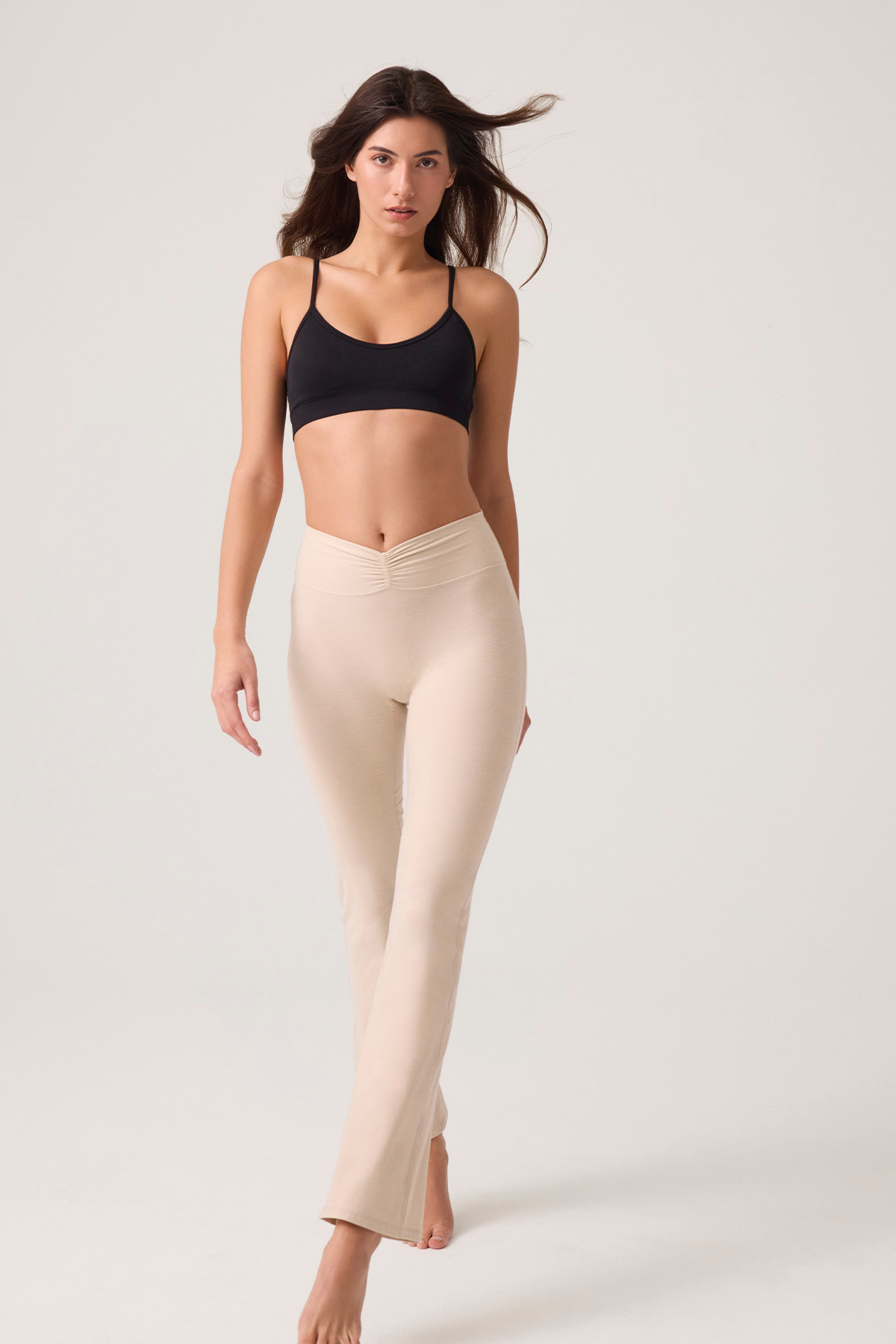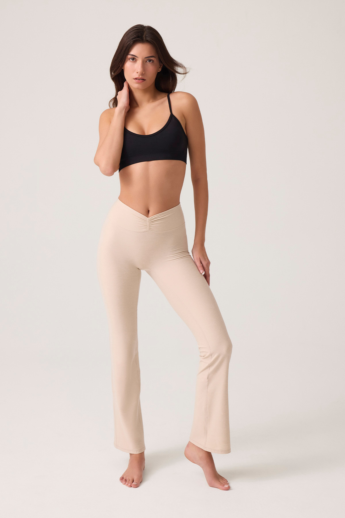 Bel detaylı, İspanyol paça pantolon.