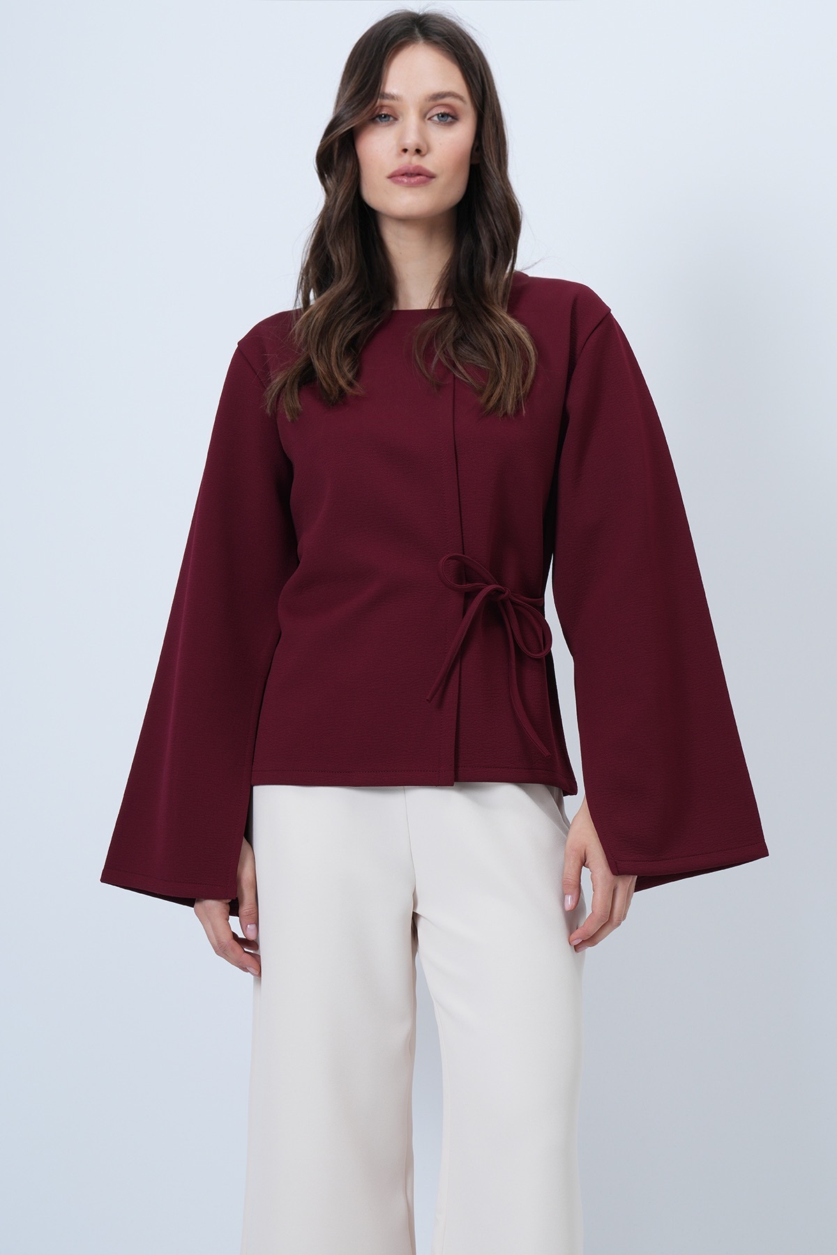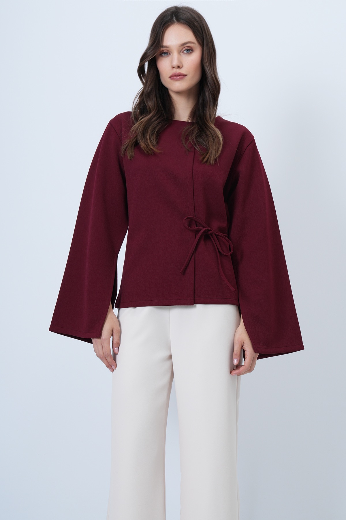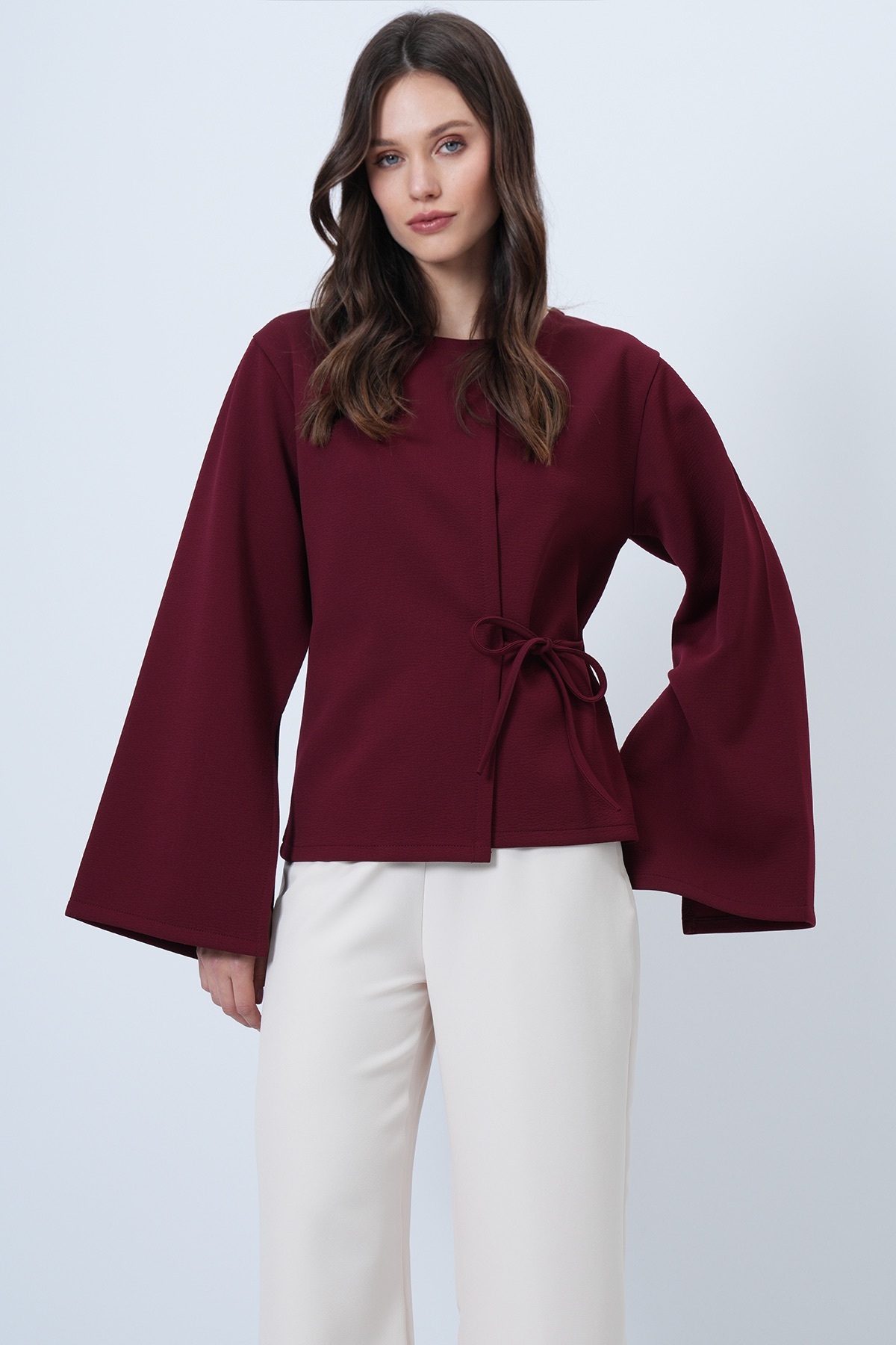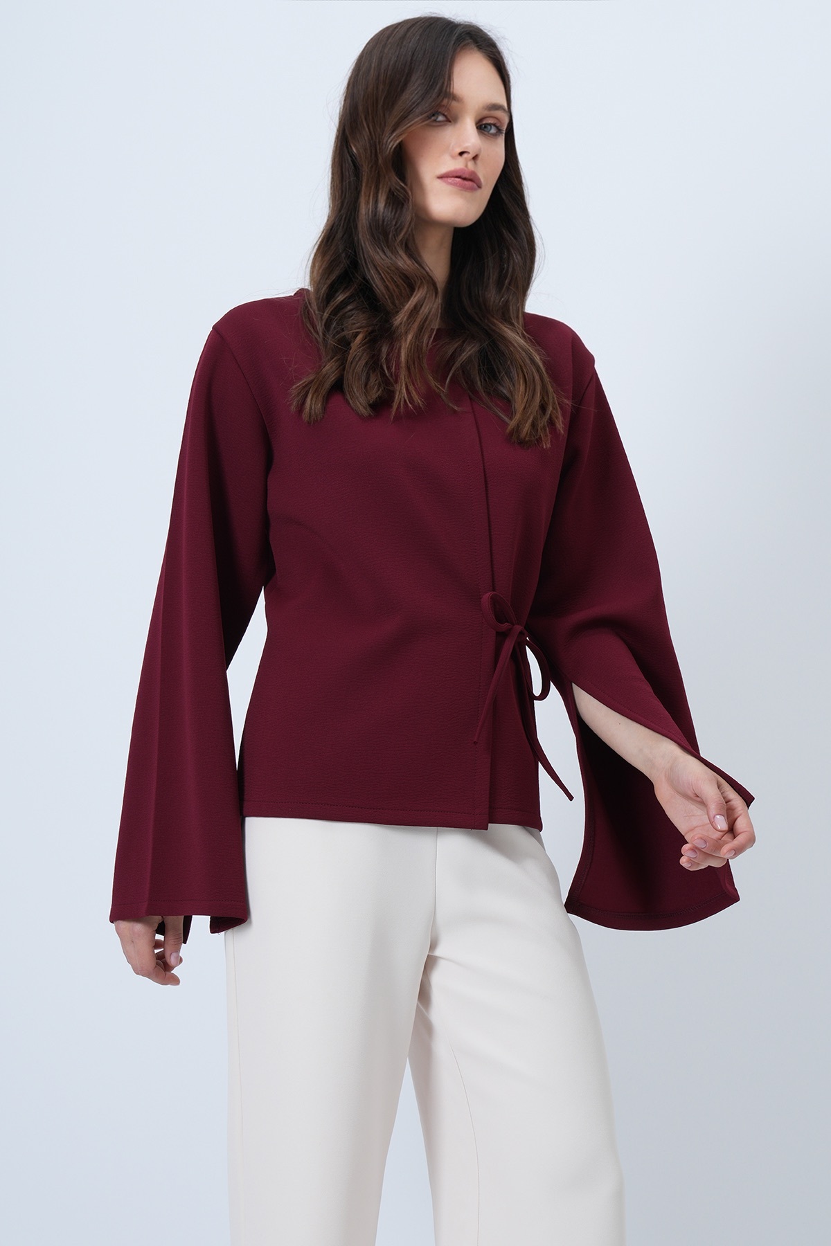 Kadın Bordo Kruvaze Bağlama Detaylı Yırtmaç Kol Bluz ALC-X14687
