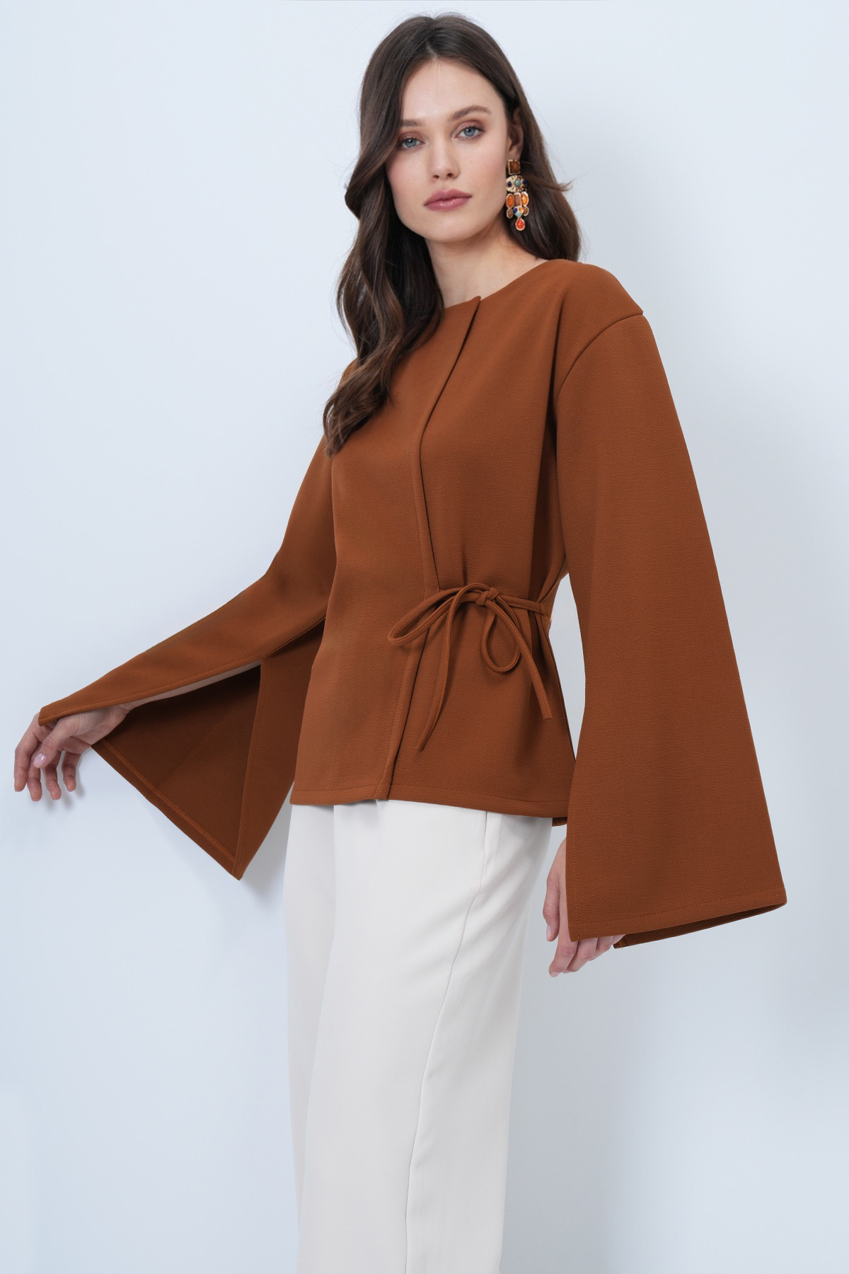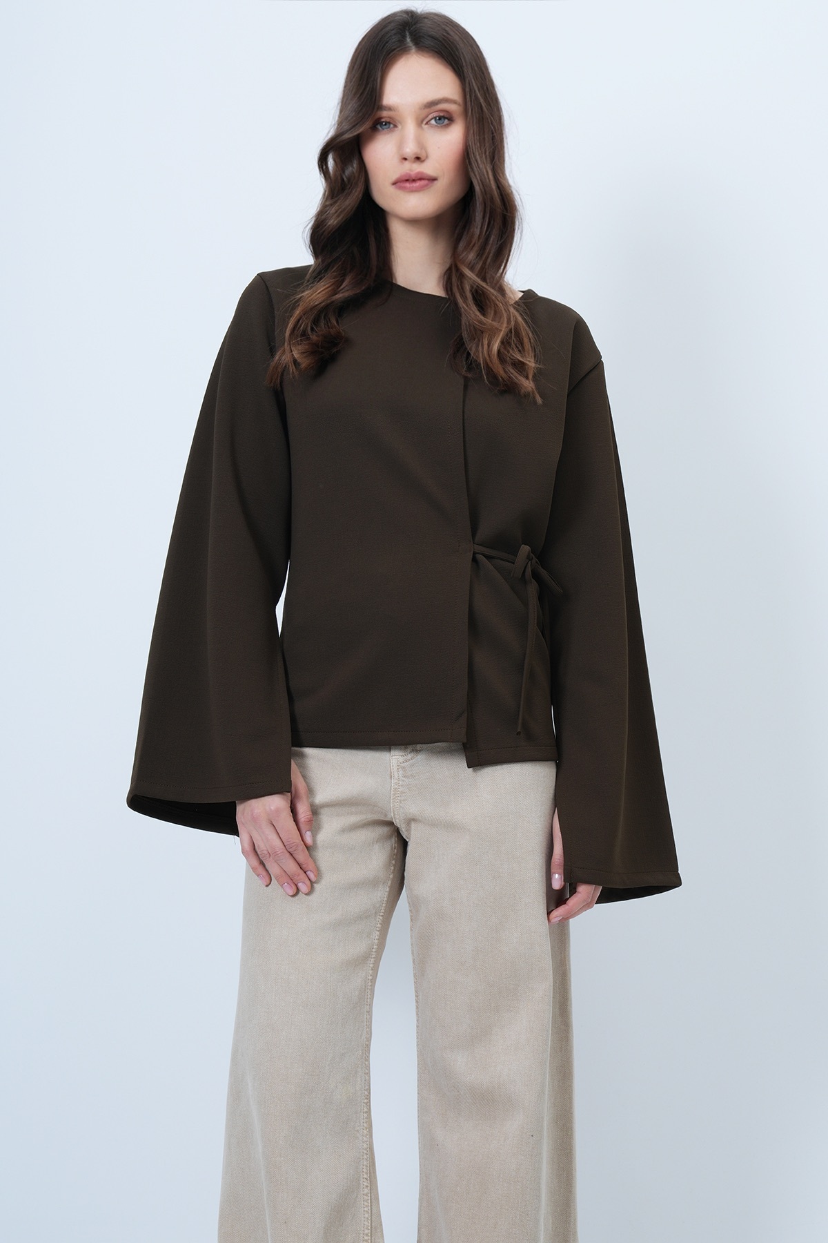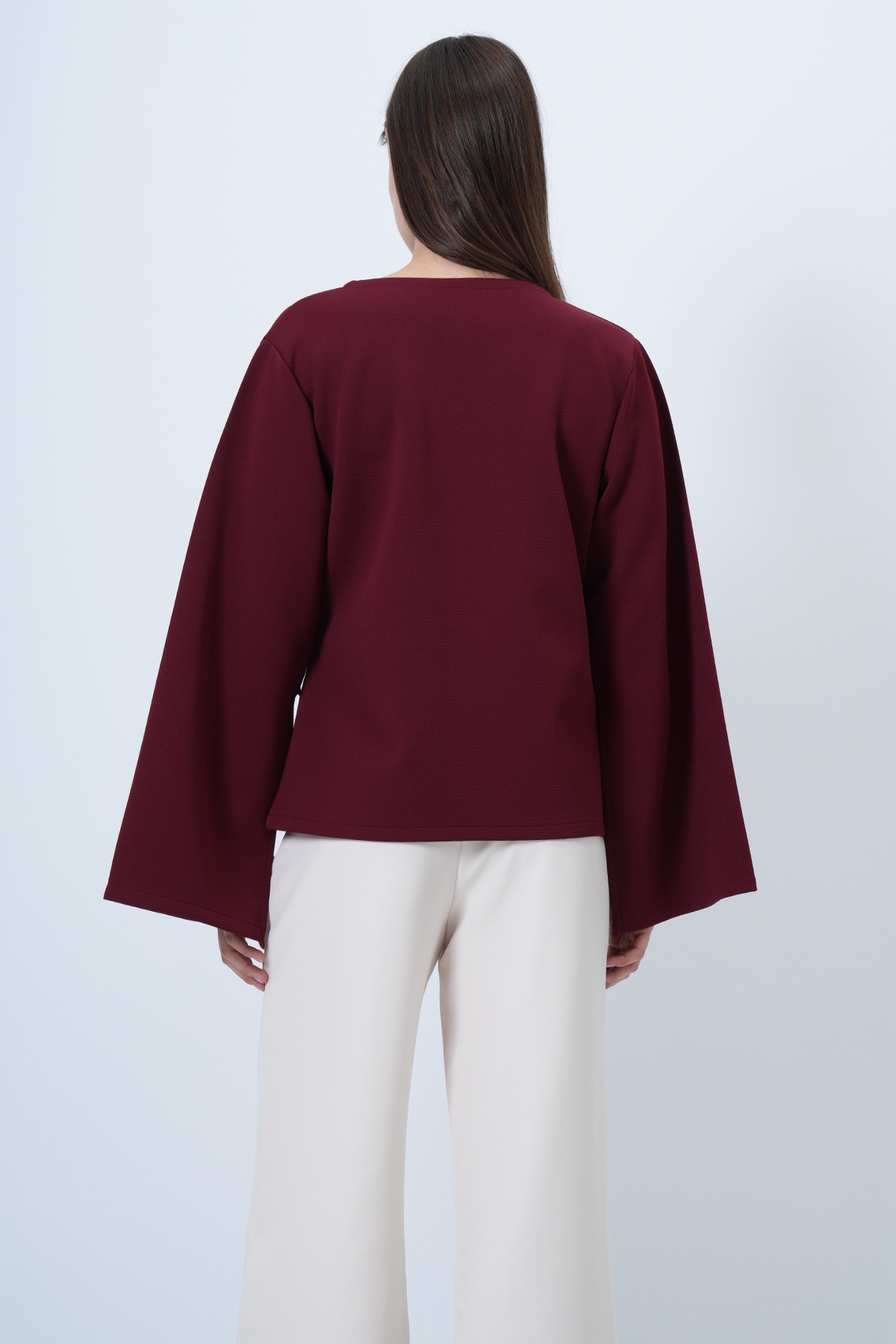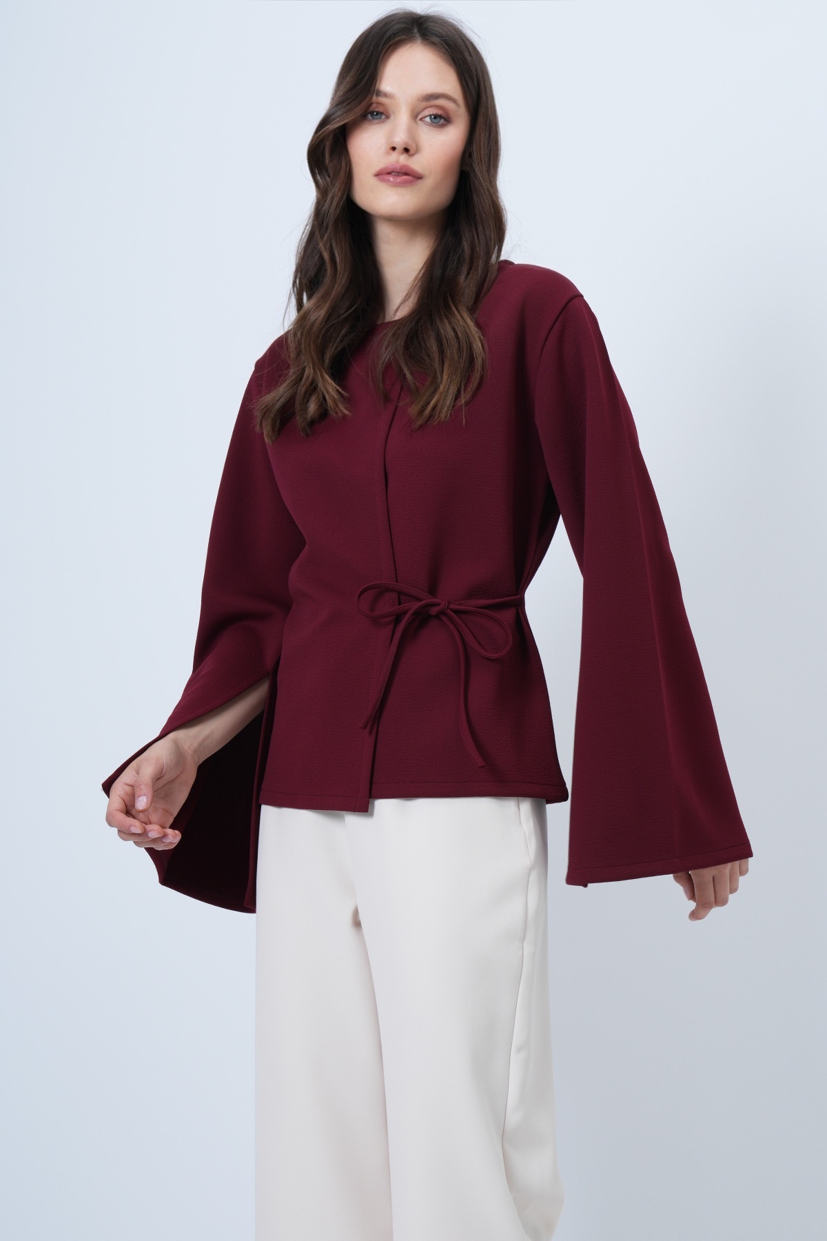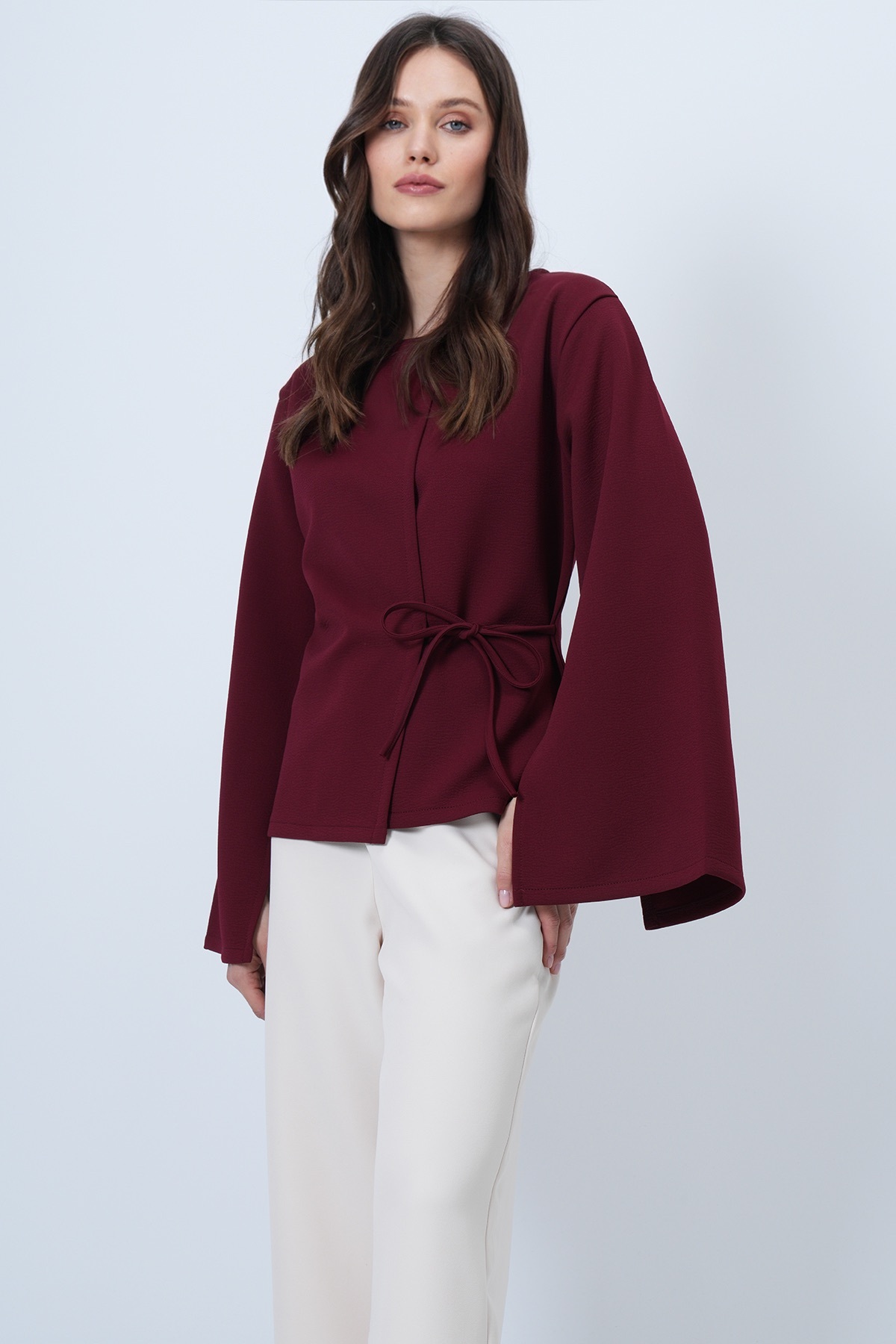 Kadın Bordo Kruvaze Bağlama Detaylı Yırtmaç Kol Bluz ALC-X14687
