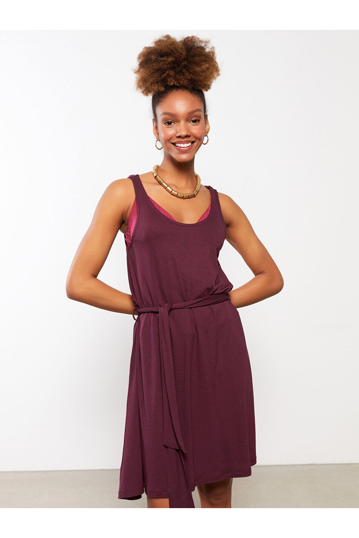 U yakalı ve kolsuz kadın plaj elbisesi, belden bağlamalı kuşak detaylıdır.