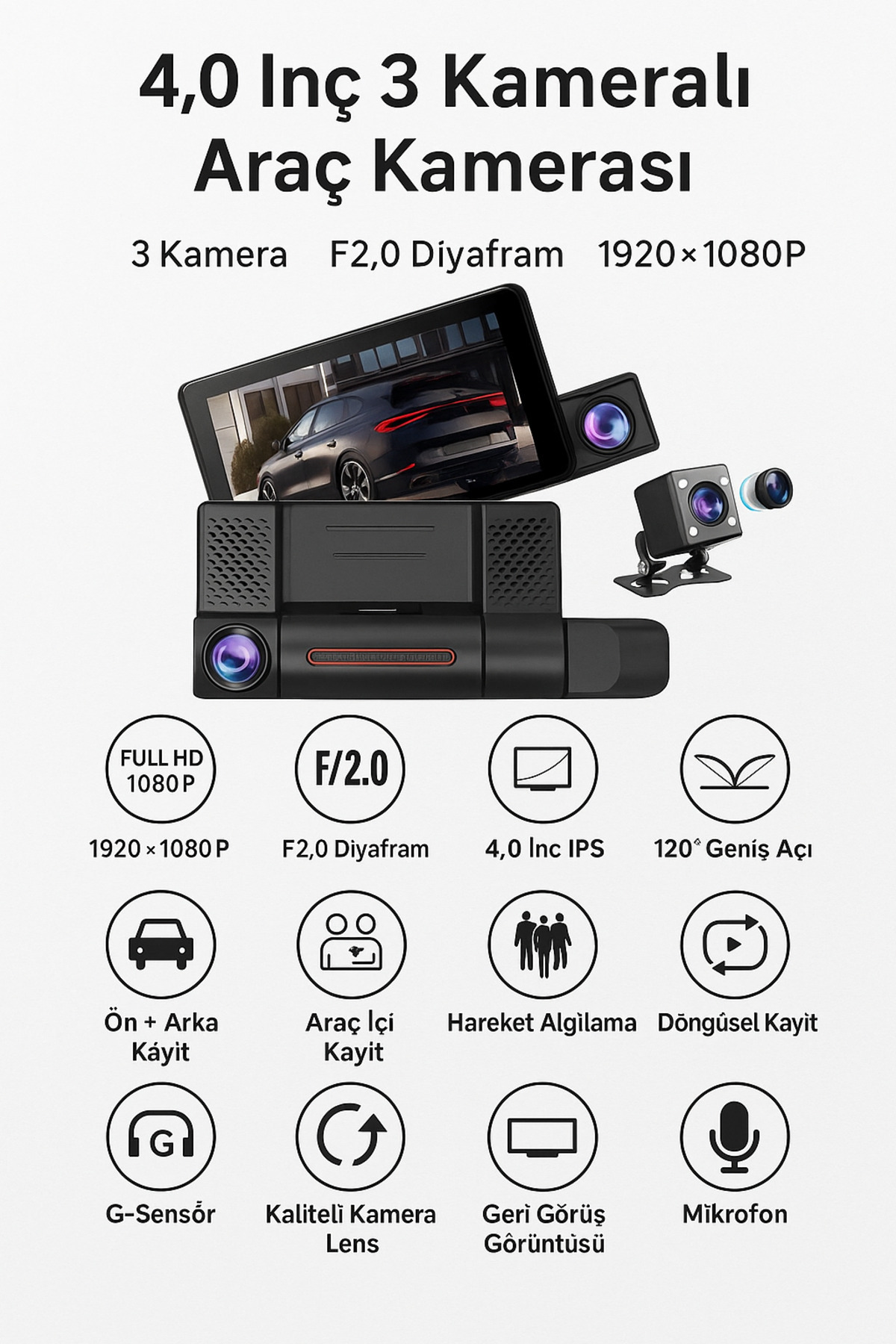 3 Yönlü Araç Kamerası | 1080P Full HD | Gece Görüş | Geri Görüş | 24 Saat Park İzleme | G-Sensör |