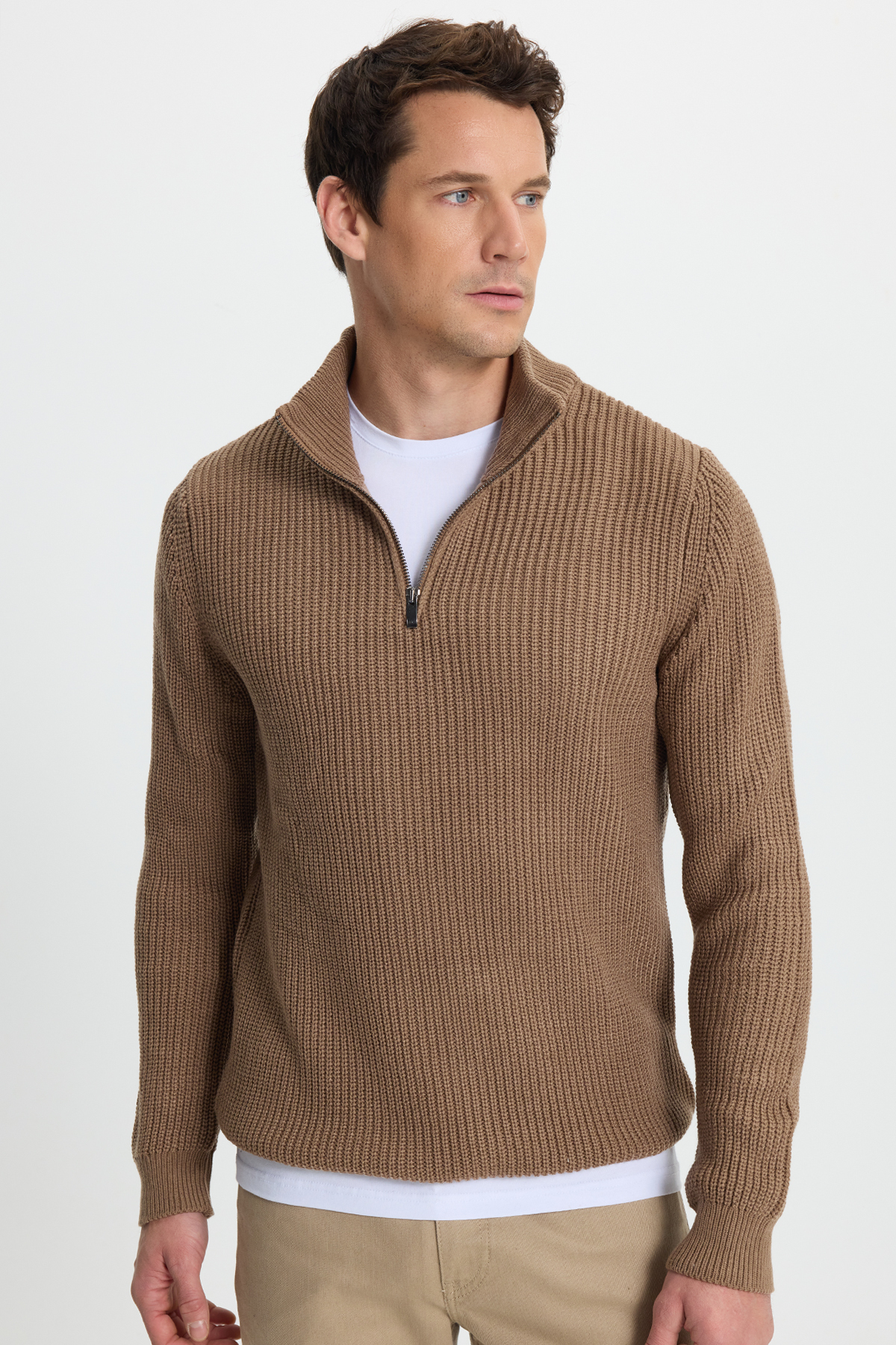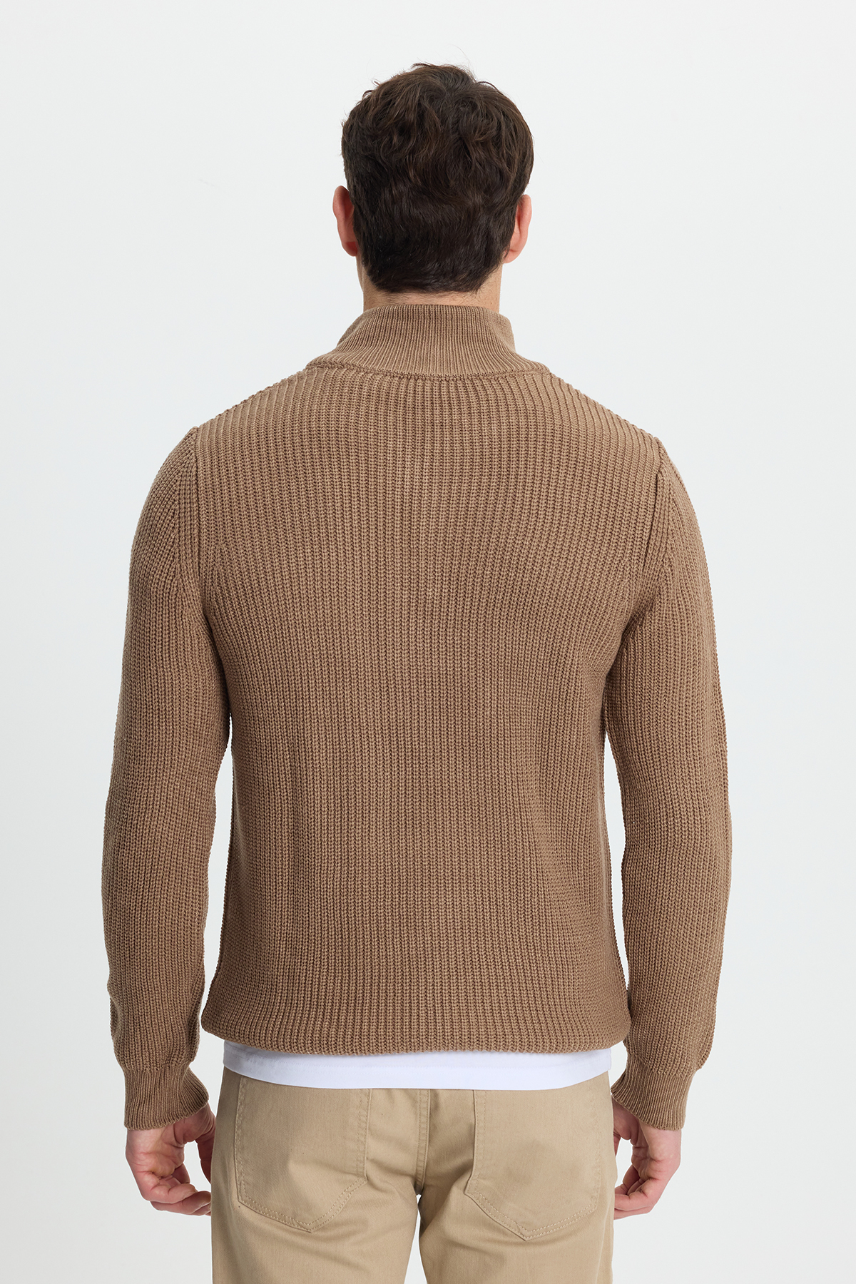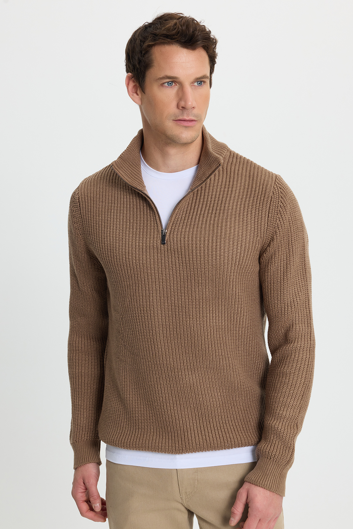 Erkek Slim Fit Dar Kesim Fermuarlı Koyu Vizon Dik Yaka Triko Kazak