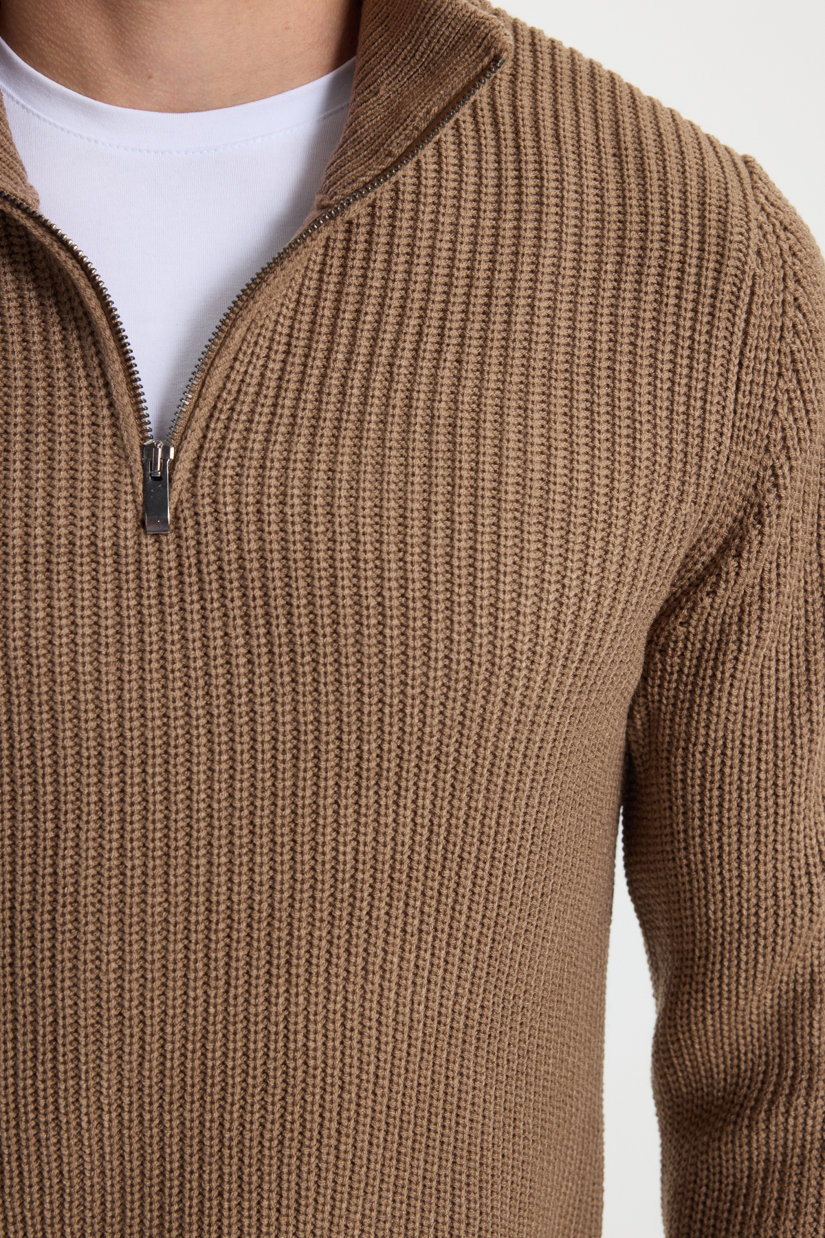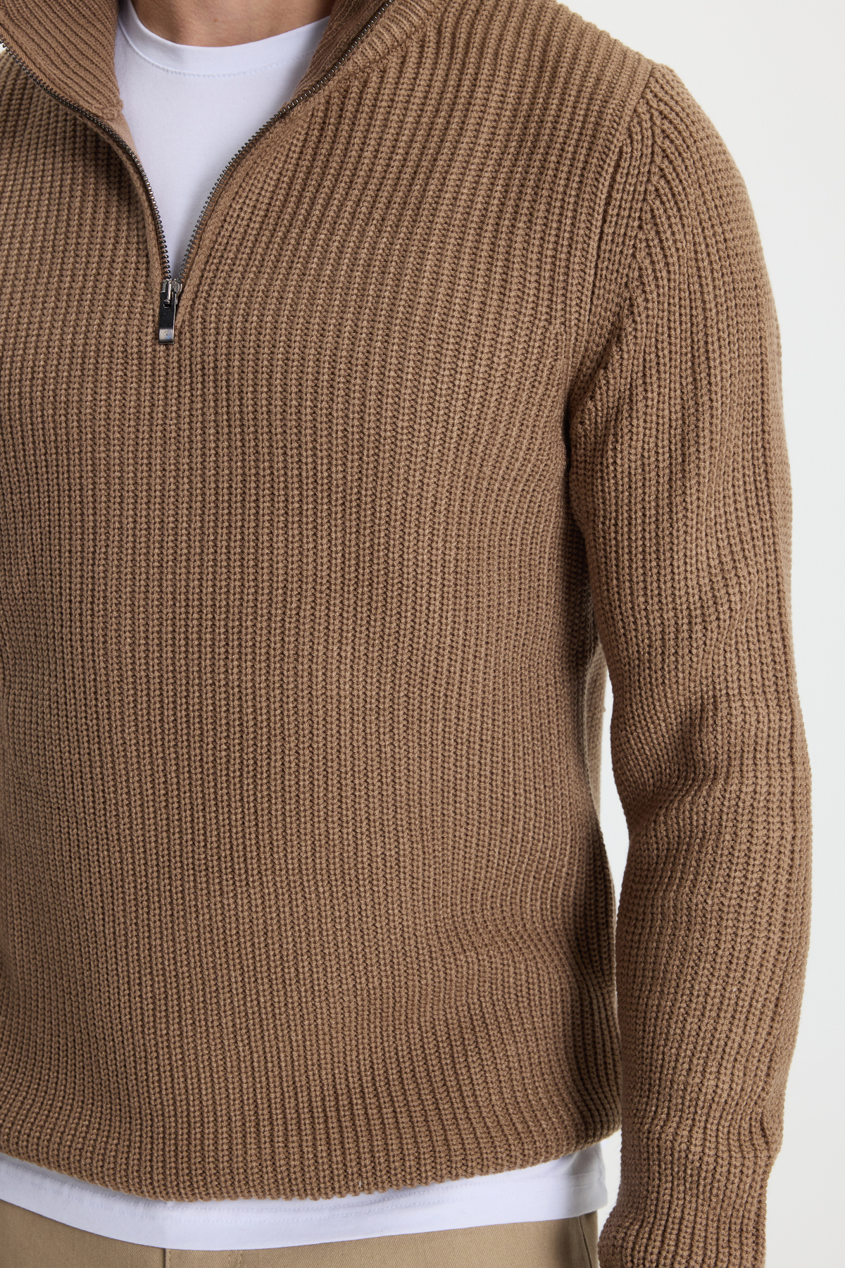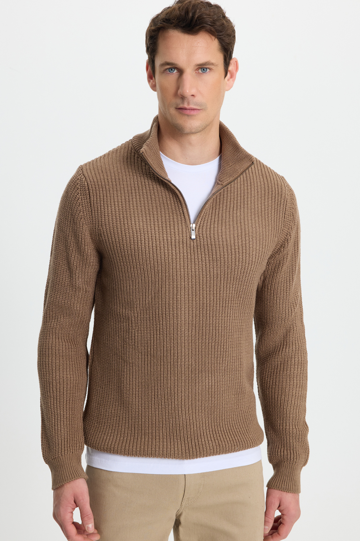 Erkek Slim Fit Dar Kesim Fermuarlı Koyu Vizon Dik Yaka Triko Kazak