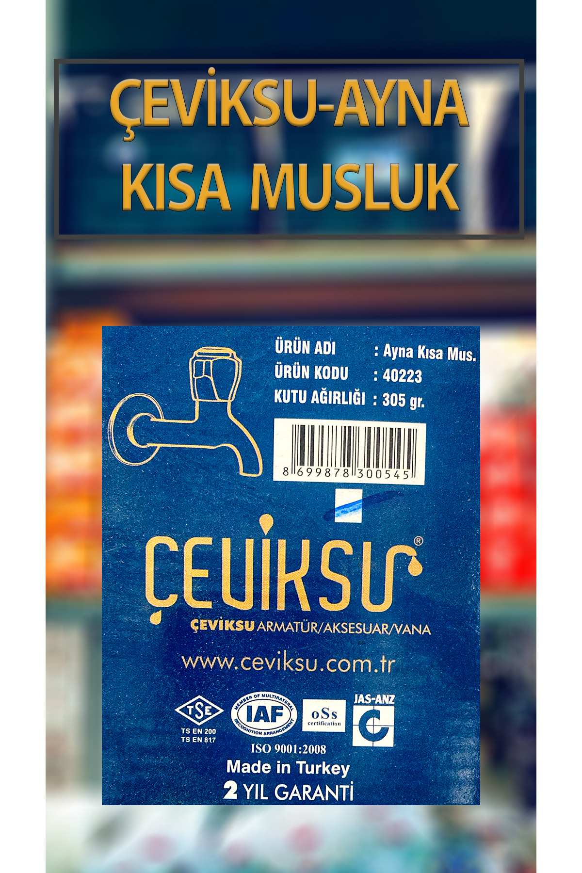 Teknik Bilgiler: Marka: Çevik Ürün Tipi: Kısa su musluğu Malzeme: Pirinç gövde, krom (ayna) kaplama Yüzey: Parlak ayna görünüm Bağlantı Çapı: 1/2" standart bağlantı Kullanım Alanı: Banyo, mutfak, lavabo Açma/Kapama Mekanizması: Tek kolla kolay kontrol Montaj Şekli: Duvar tipi Dayanıklılık: Paslanma ve korozyona karşı dirençli Garanti: 2 yıl