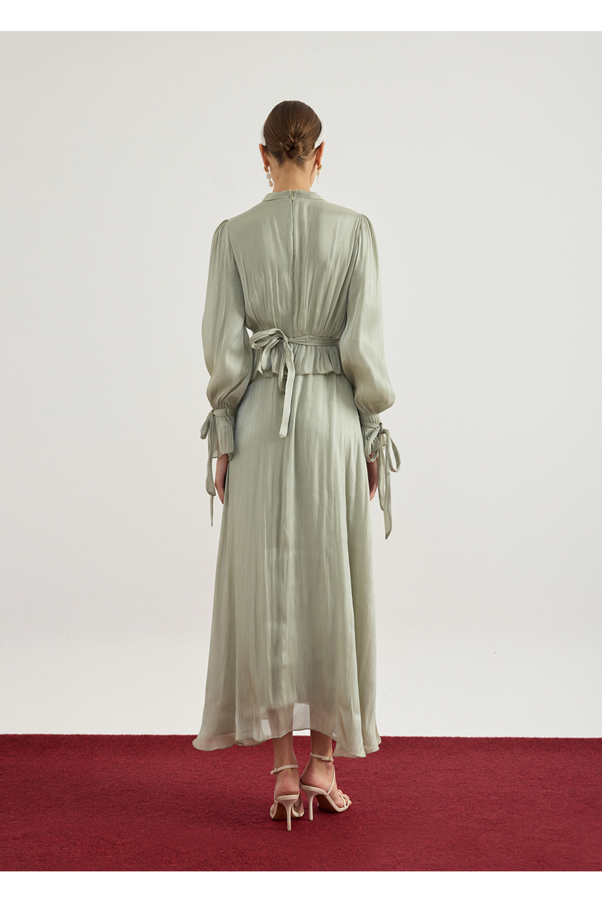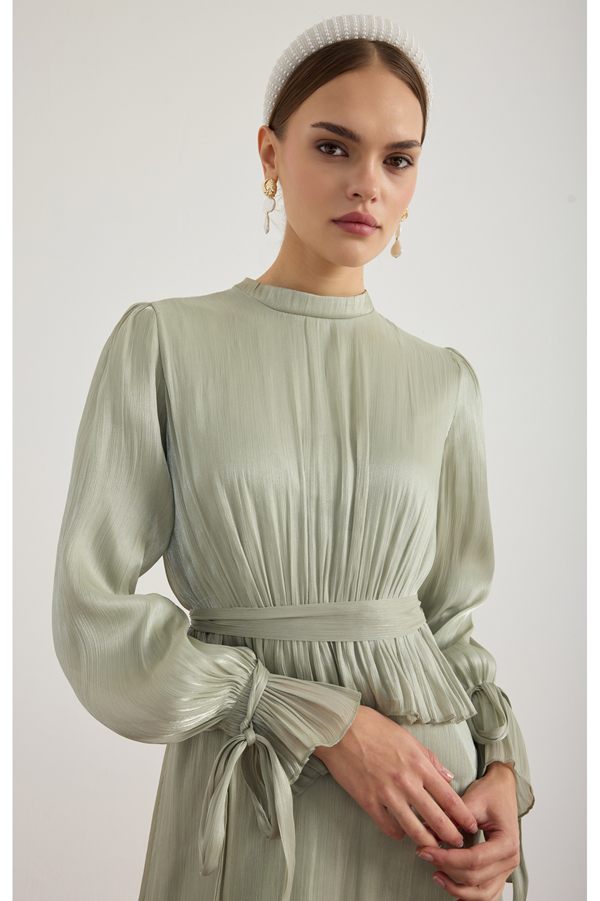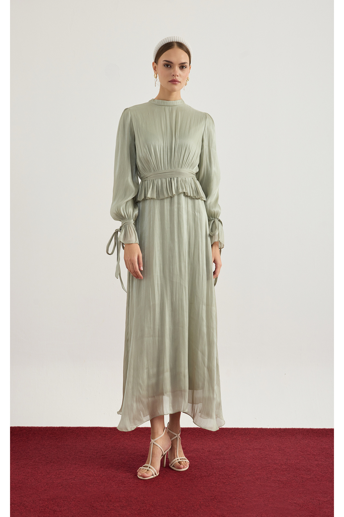 Su Yeşili Büzgü Detaylı Janjan Elbise