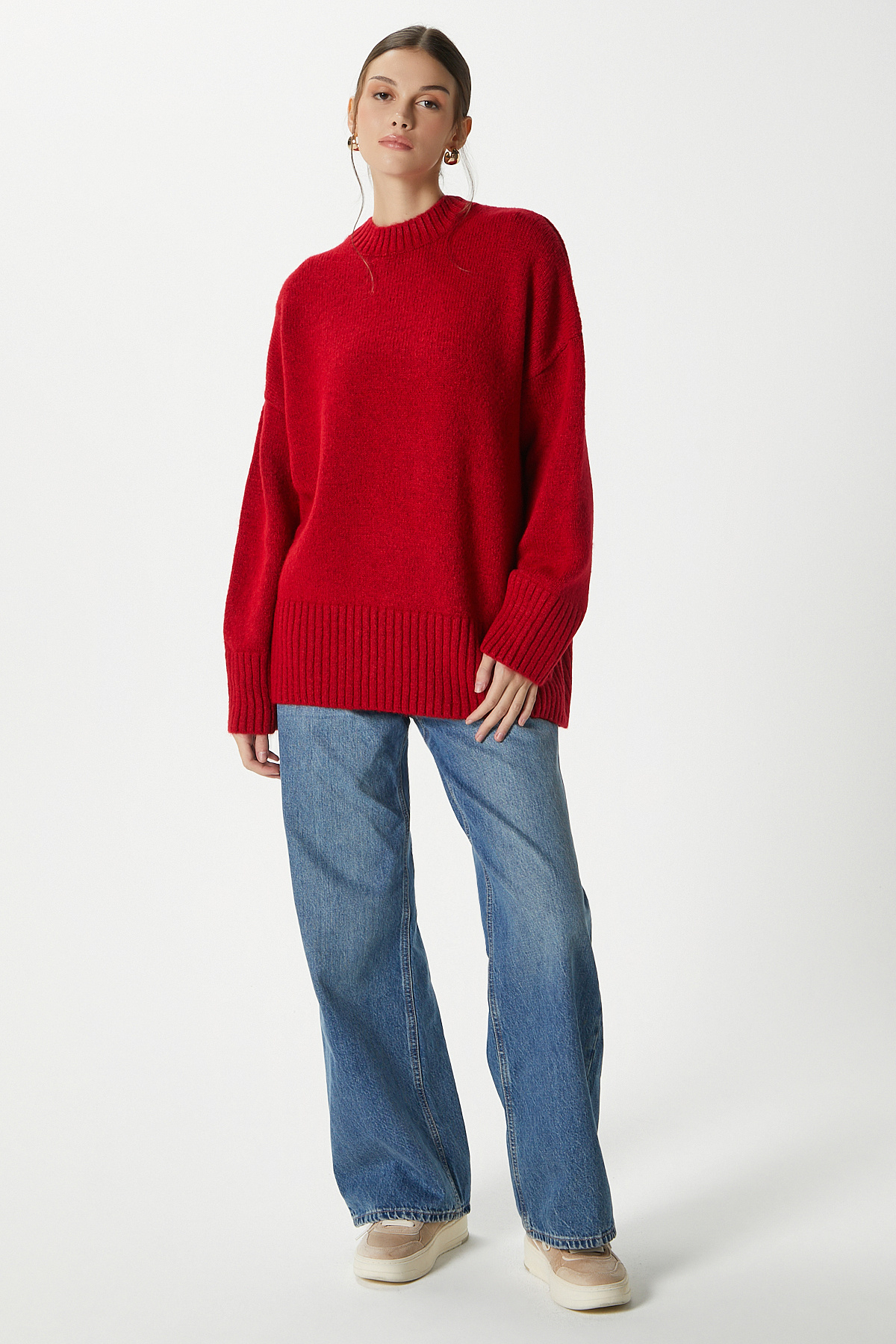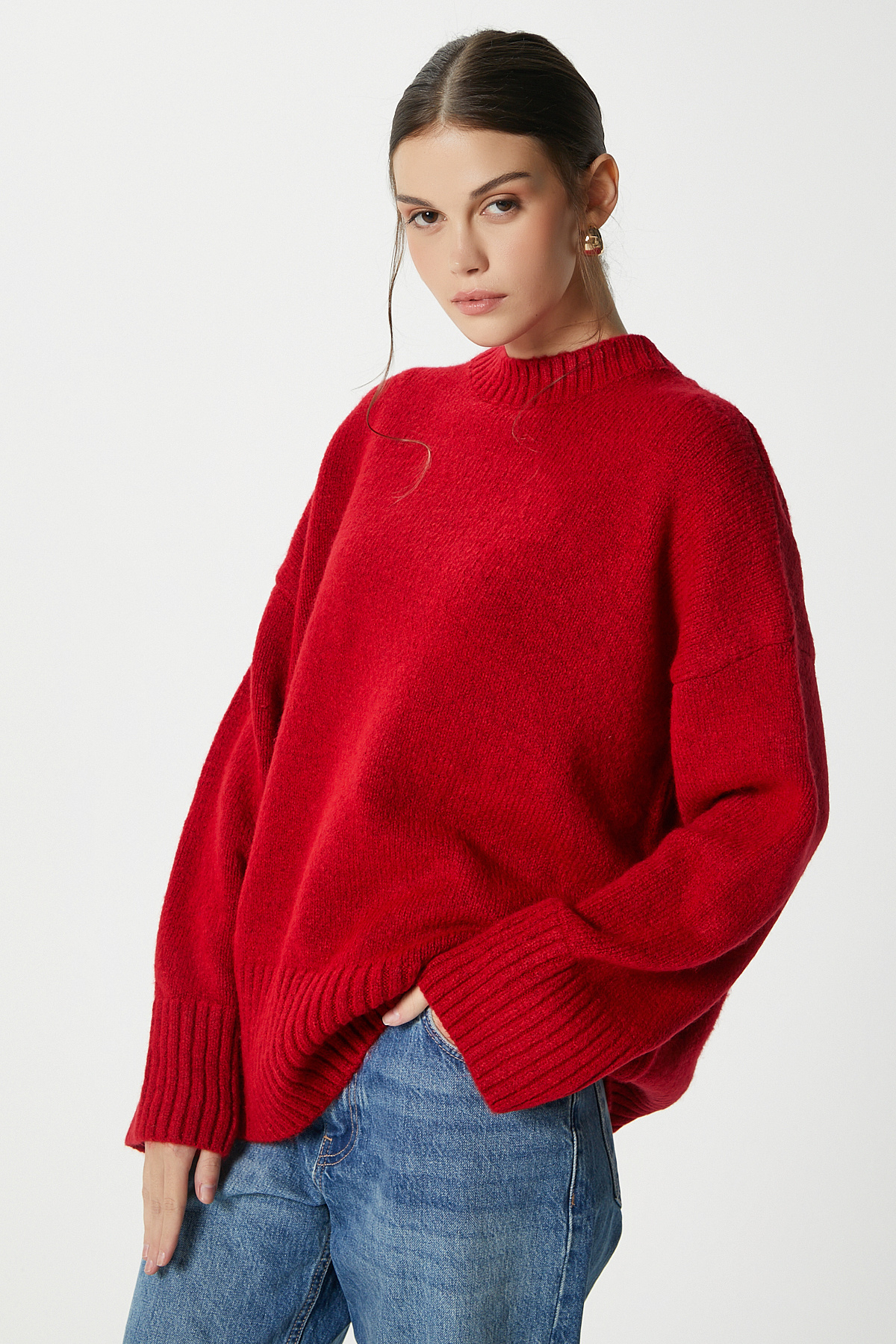 Kadın Homy Yumuşacık Bisiklet Yaka Kırmızı Oversize Triko Kazak: - Rahat kesimi ile günlük kullanım için ideal olan bu kazak, hareket özgürlüğünüzü kısıtlamaz.