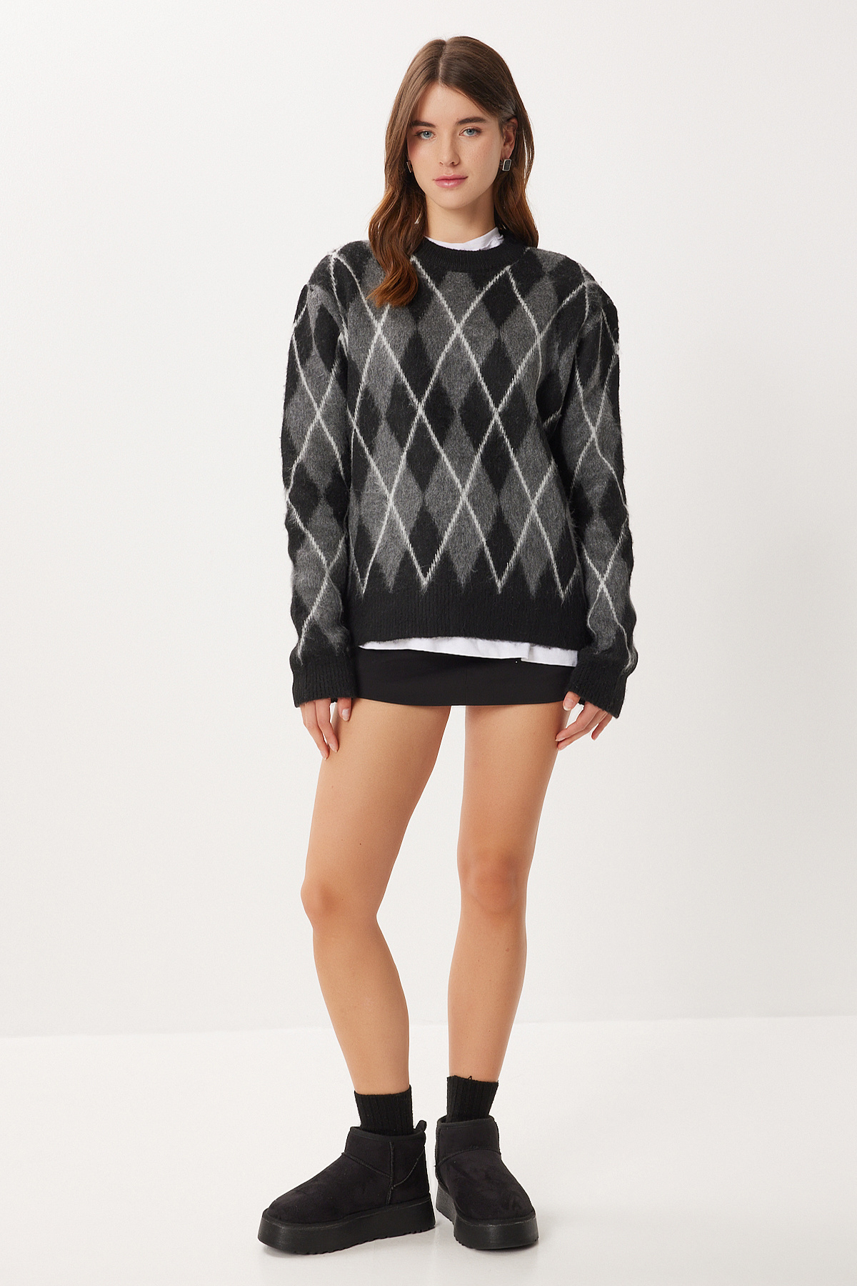 Baklava Desenli Tüylü Efektli Oversize Kazak LFN0129 SİYAH ANTRASİT