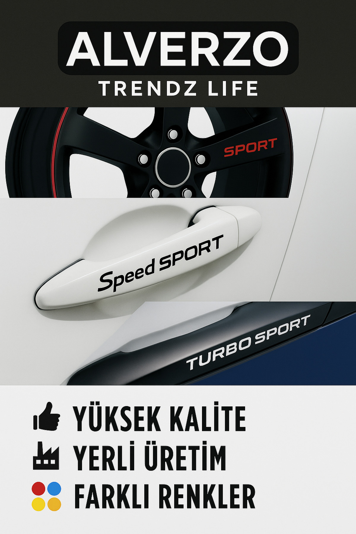 Tüm araç markalarıyla uyumlu kapı kolu ve jant sticker seti, aracınıza sportif ve premium bir görünüm kazandırır.