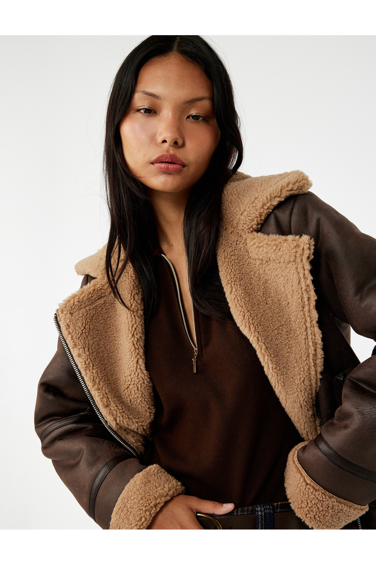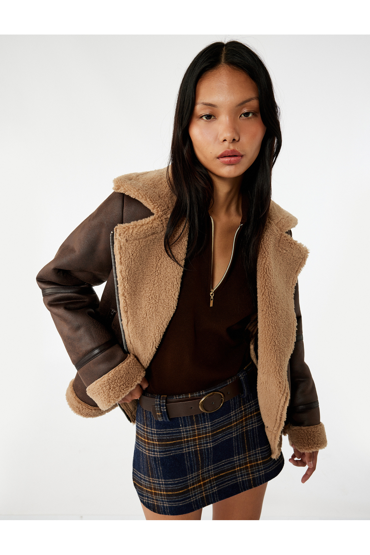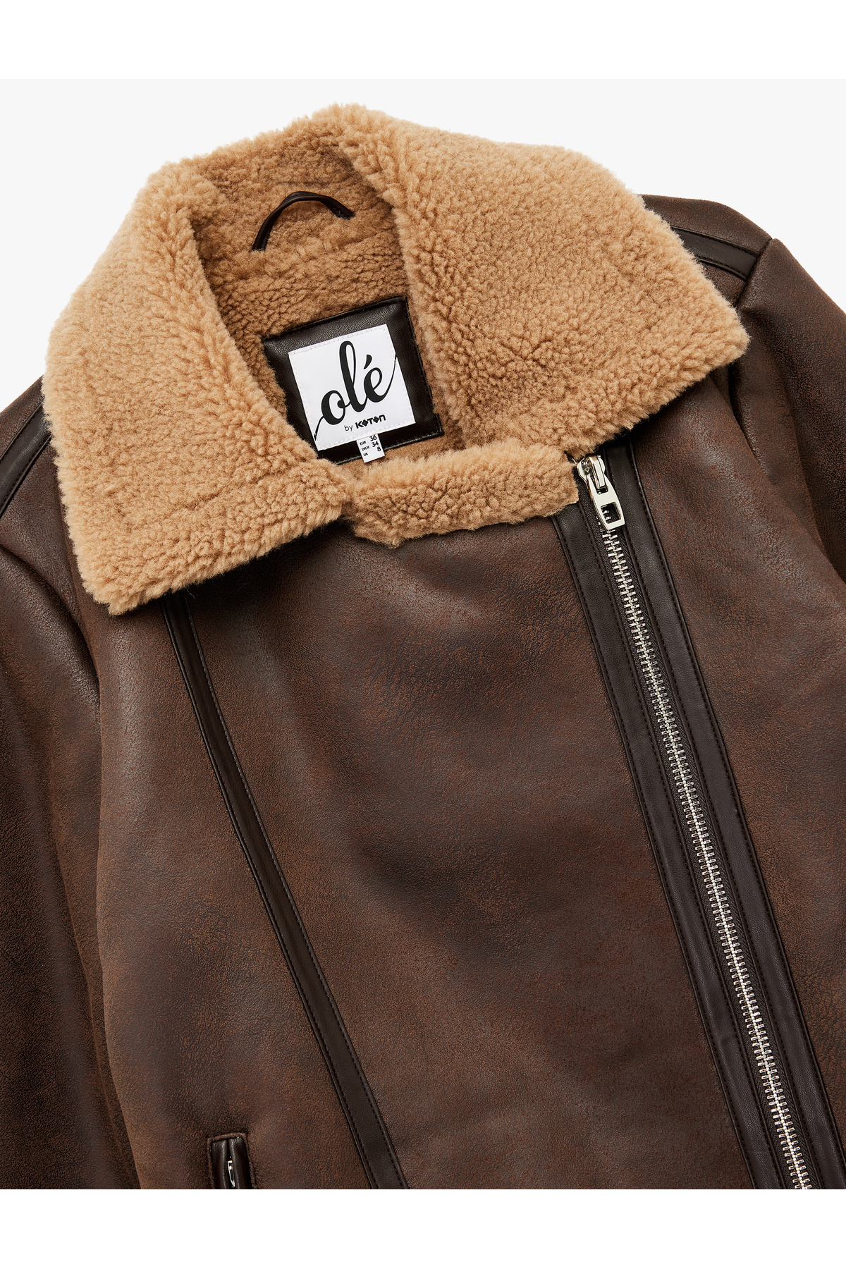 Suni Kürklü Cepli Fermuarlı Deri Görünümlü Biker Ceket