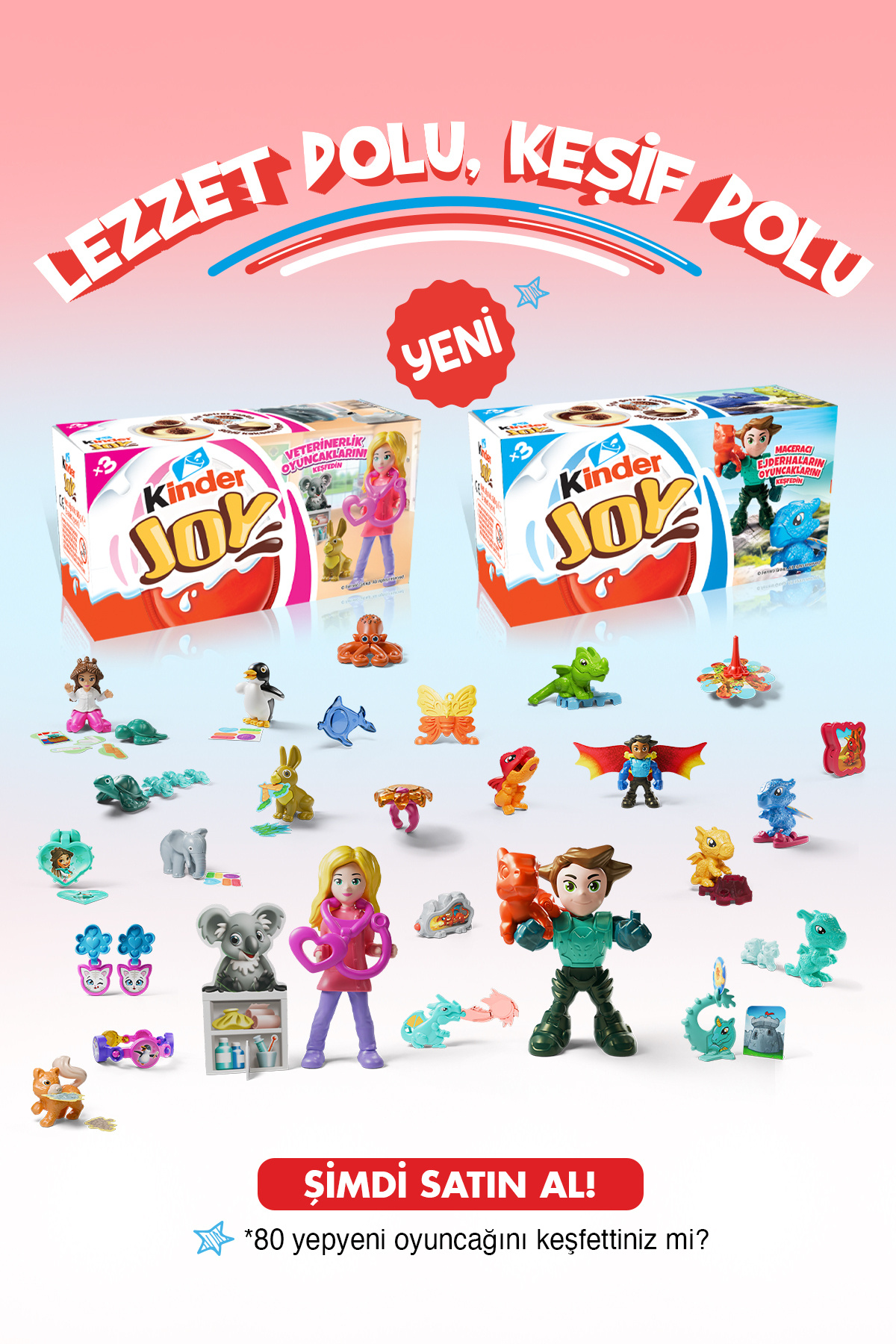 Kinder Joy çikolata nefis sütlü kakaolu krema ve çıtır gofret toplarının eşsiz uyumuyla birlikte, zengin oyuncak çeşitliliğiyle hayal gücünüzü hareket geçiriyor!