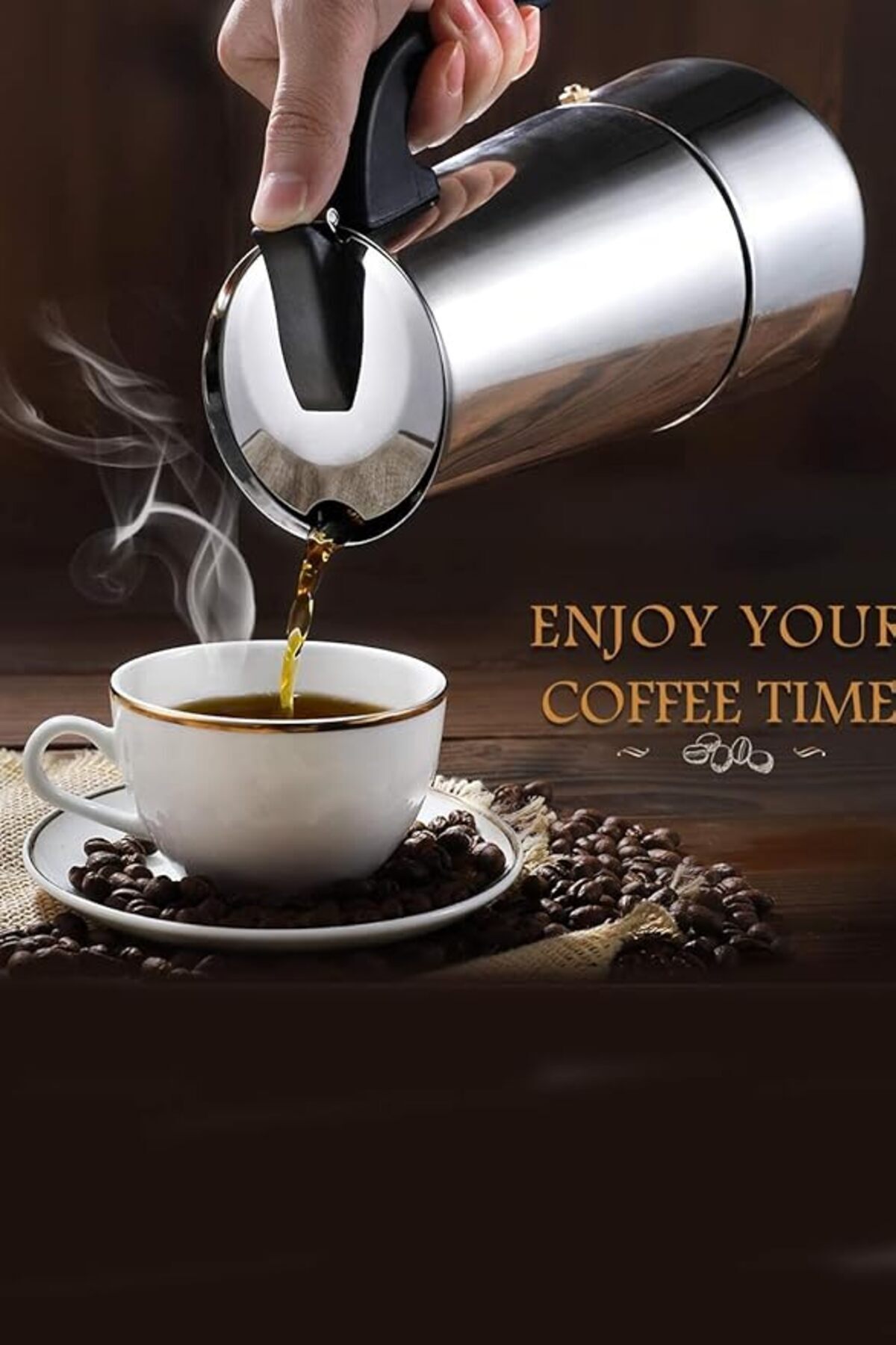 Çelik moka pot, su buharı basıncını kullanarak kahveyi demlemeye yarar.