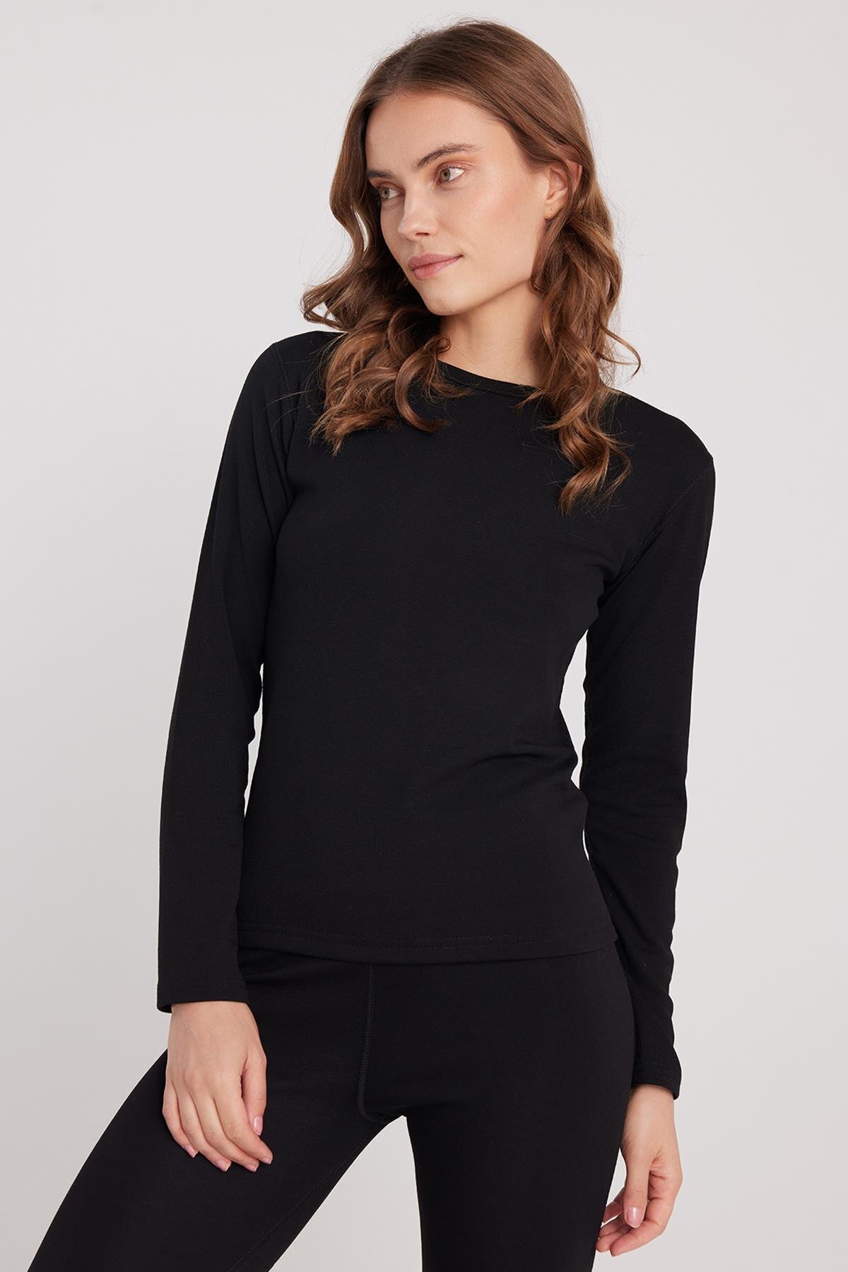 Kadın Slim Fit Dar Kesim Bisiklet Yaka Siyah Termal Alt Üst Takım