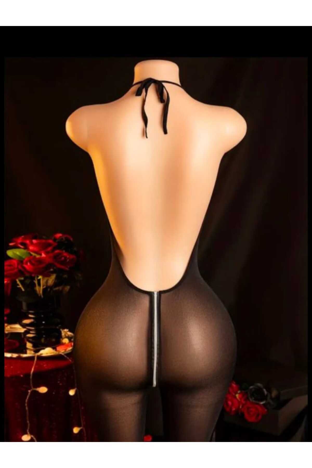 - Şık ve gece ortamları için ideal, düz deseniyle dikkat çeken fermuarlı tulum iç giyim.