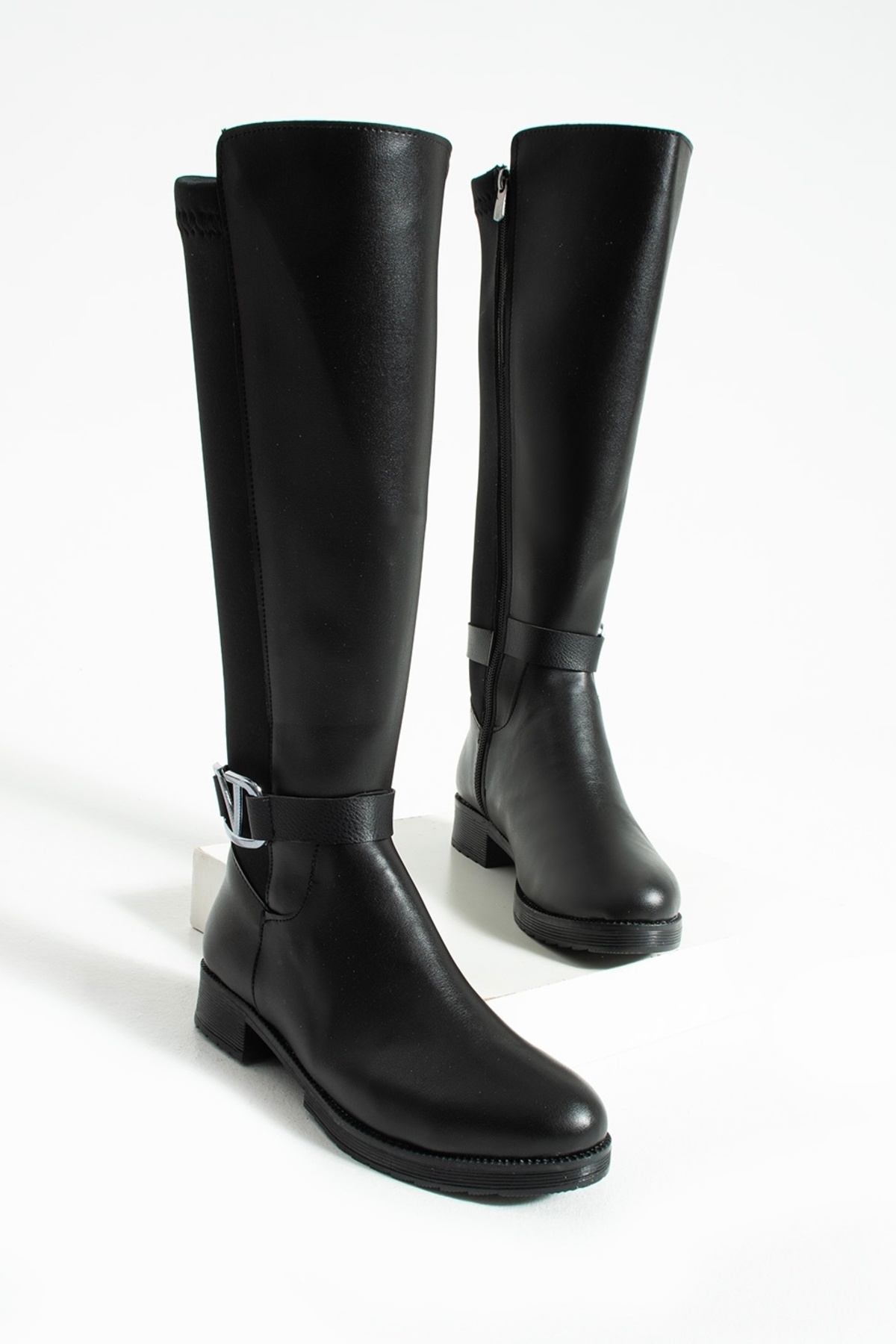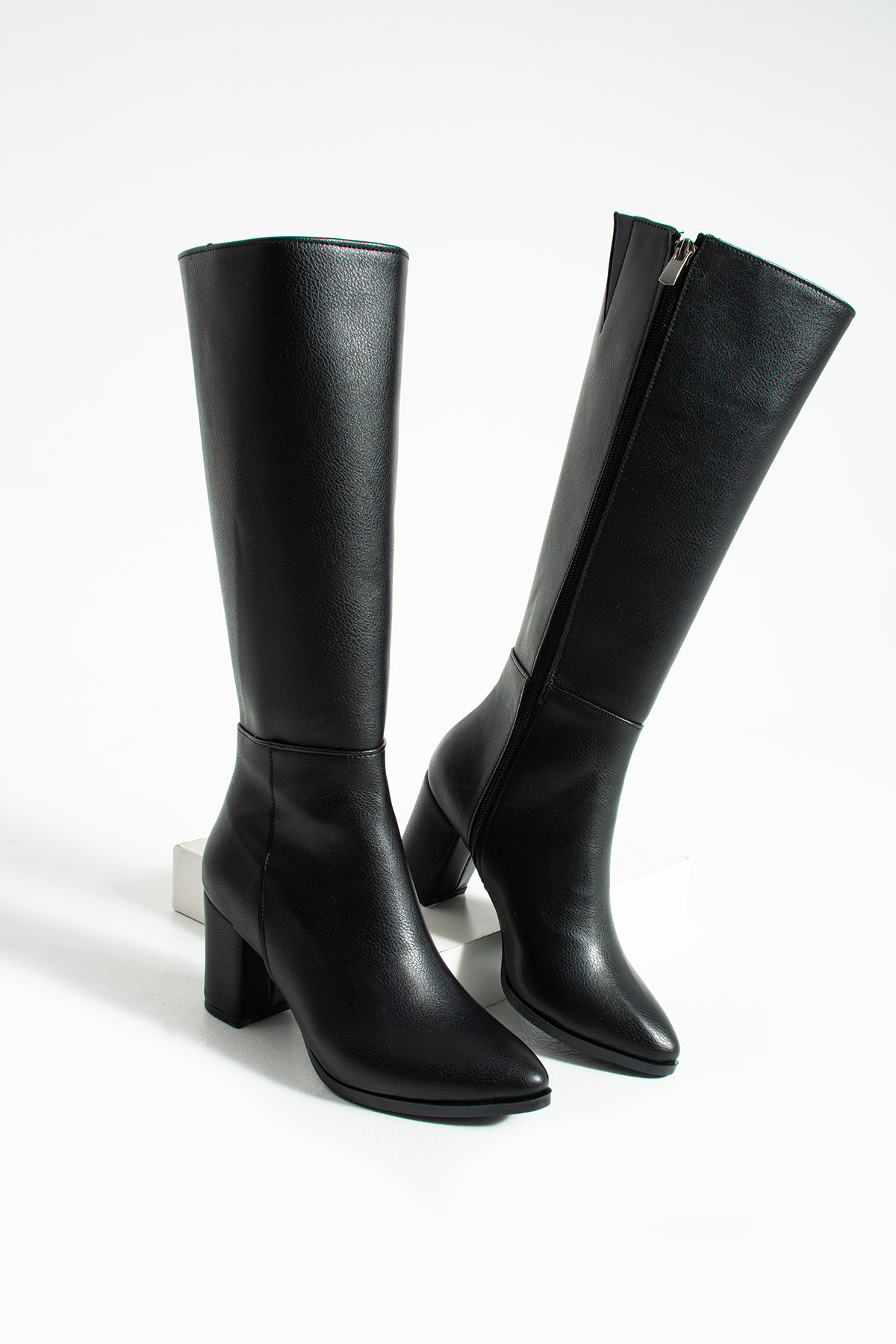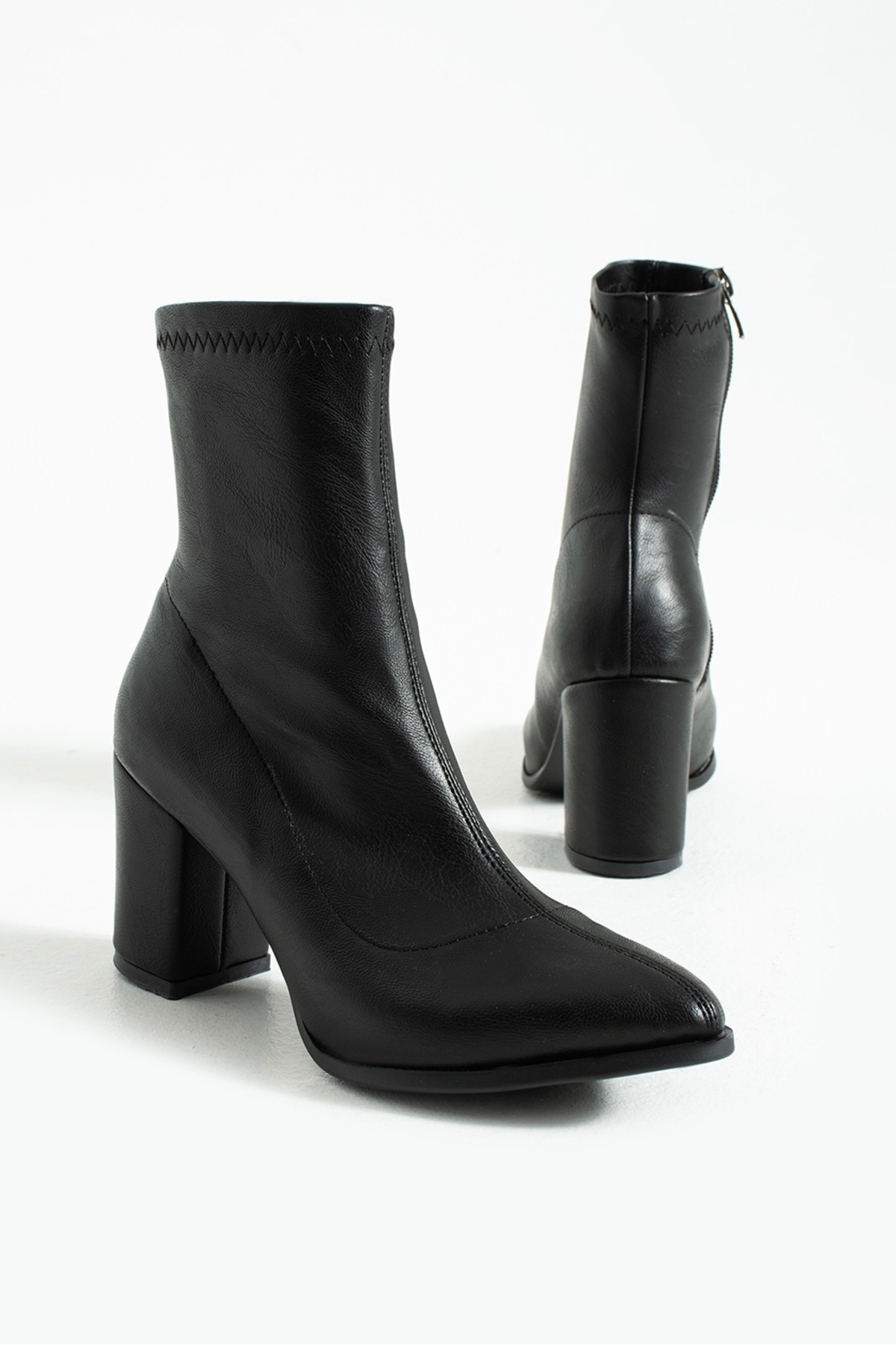 - Günlük kullanım için ideal, rahat ve şık tasarımıyla dikkat çeken kadın siyah deri topuklu bot.