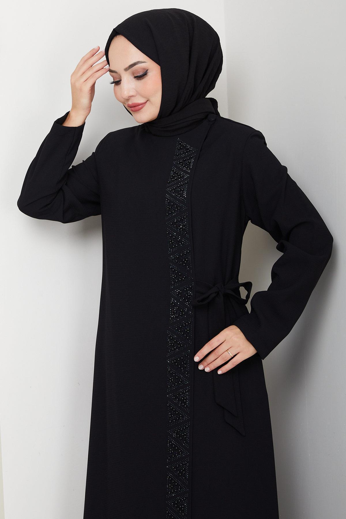 Gizli Fermuarlı Yandan Bağlamalı Boncuklu Ferace Siyah HM2845