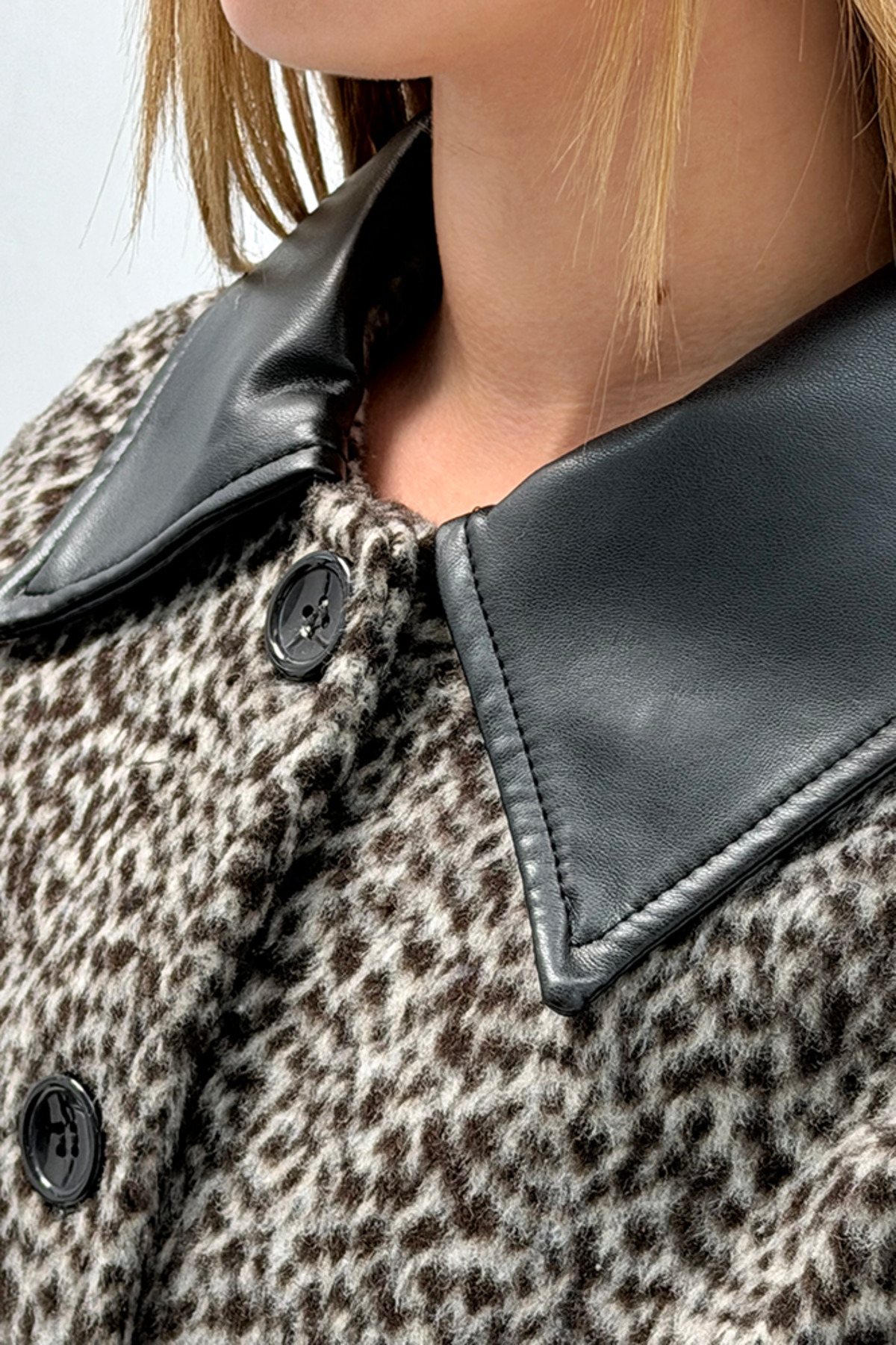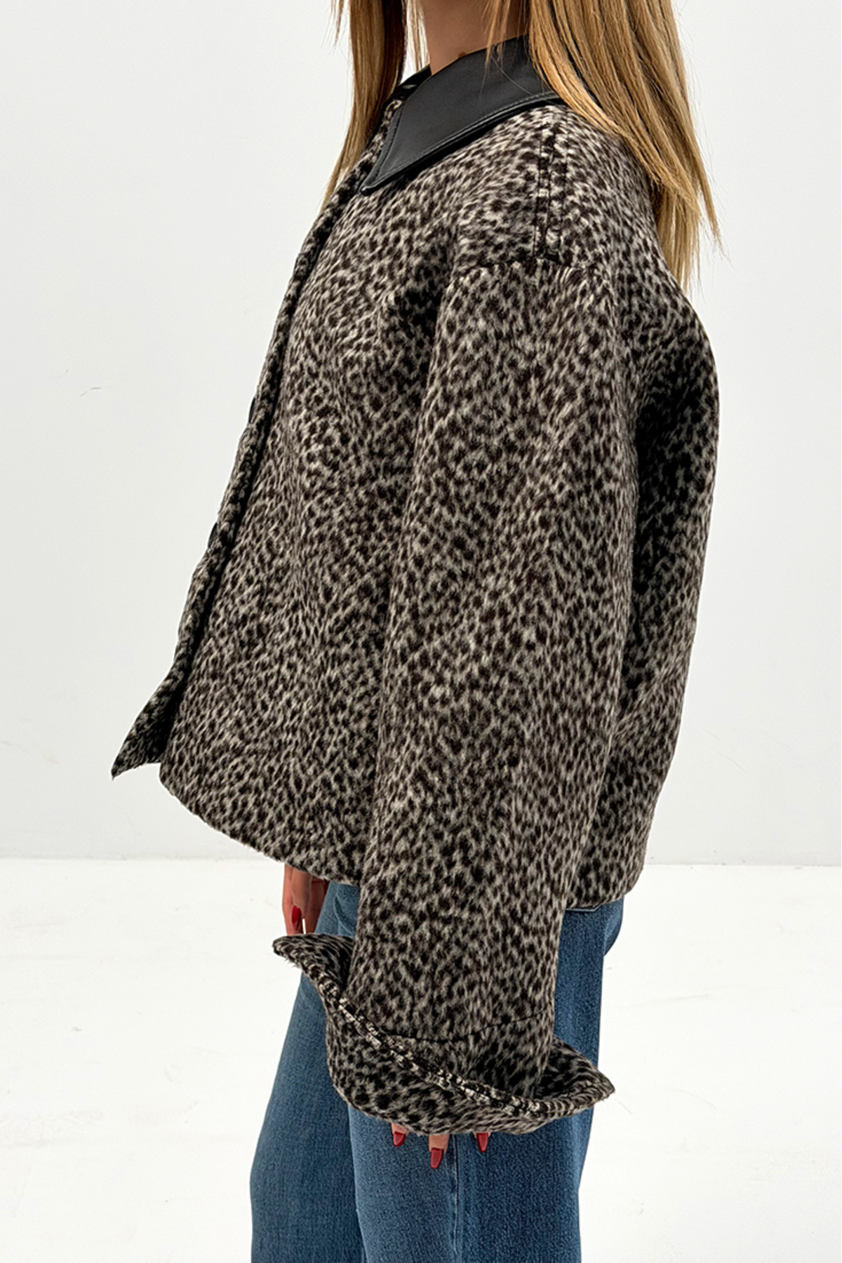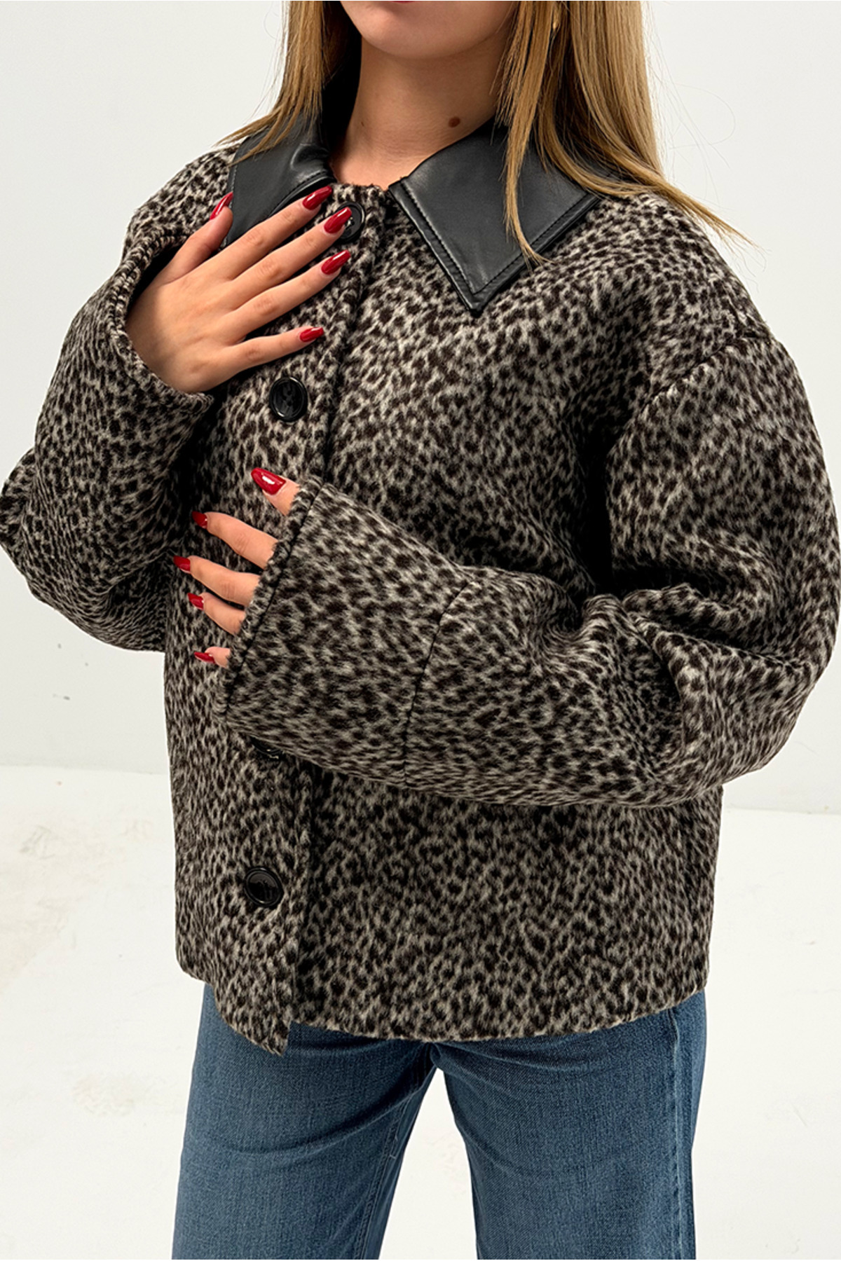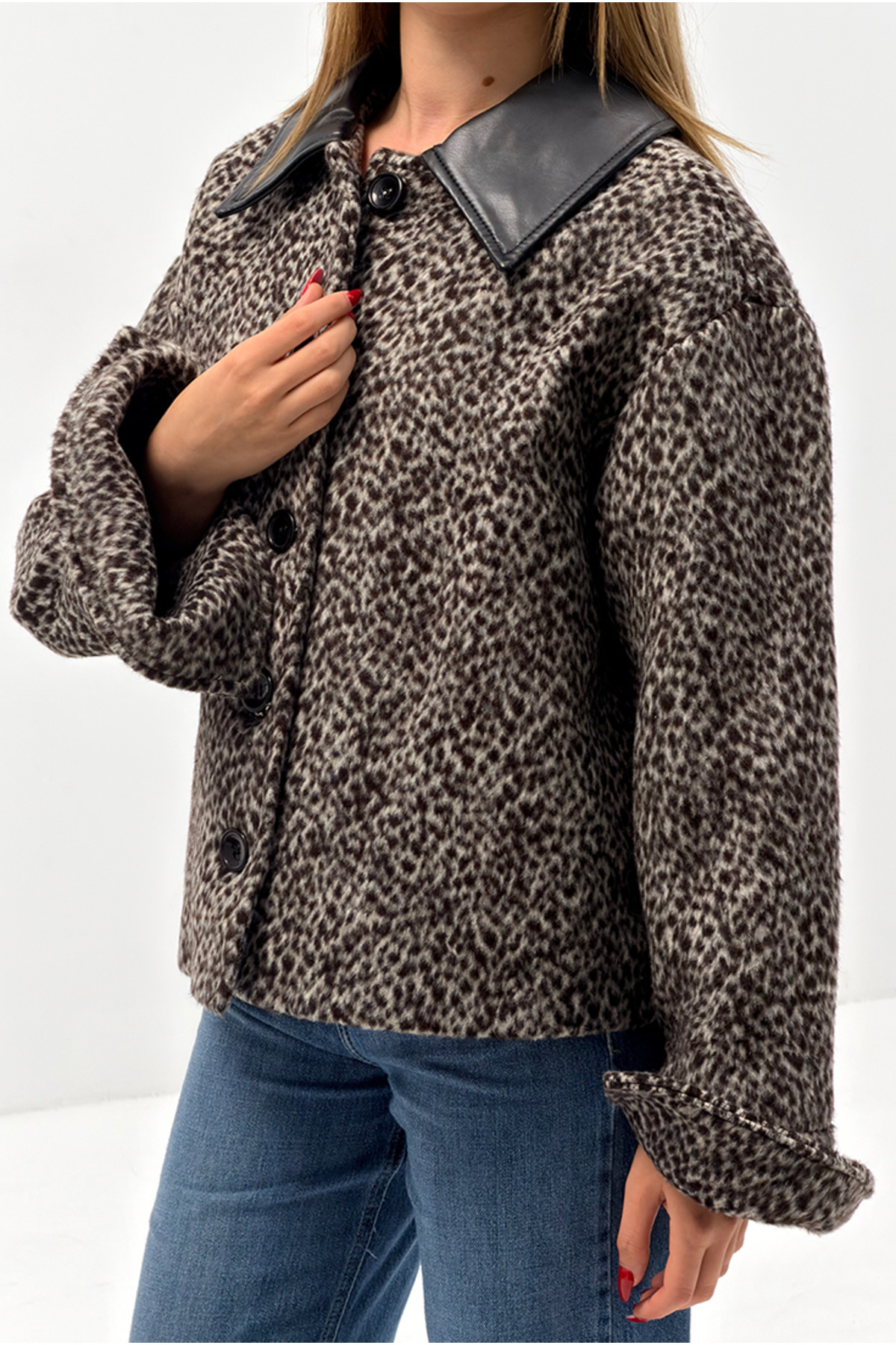 - Şık ve modern bir görünüm için siyah suni deri yaka detaylı desenli ceket, her ortamda dikkat çekici bir stil sunar.