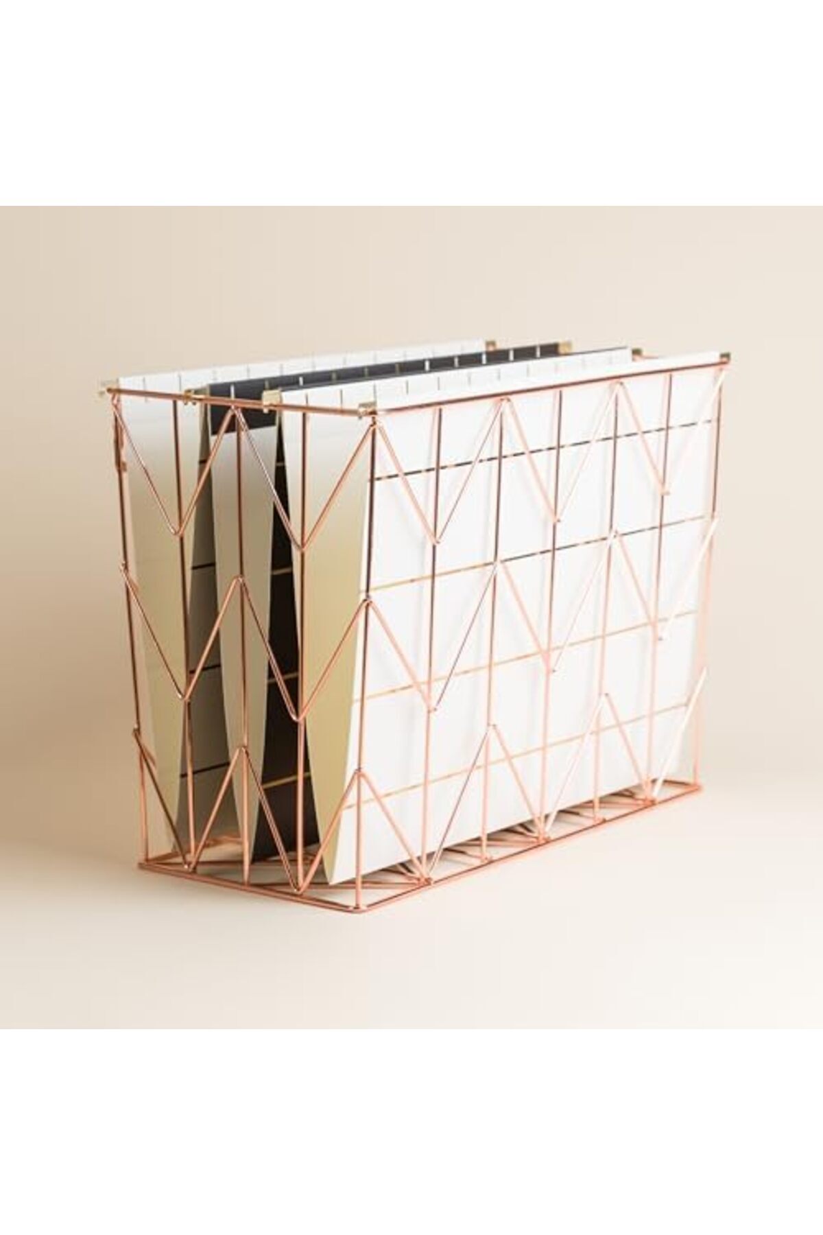 Bakır/pembe rengindeki bu benzersiz, asılabilir tel dosya sepetiyle masanıza veya ofisinize sofistike bir hava ve stil katın.