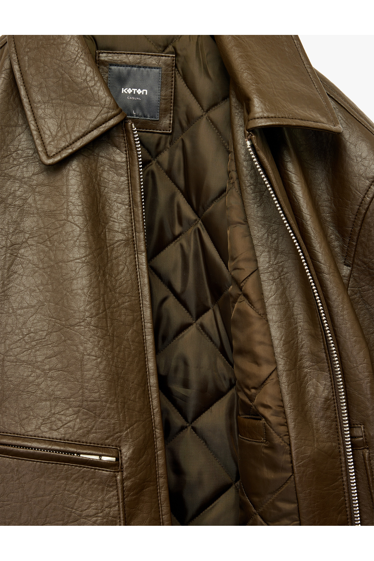 Slim Fit Uzun Kollu Fermuarlı Gömlek Yaka Suni Deri Ceket
