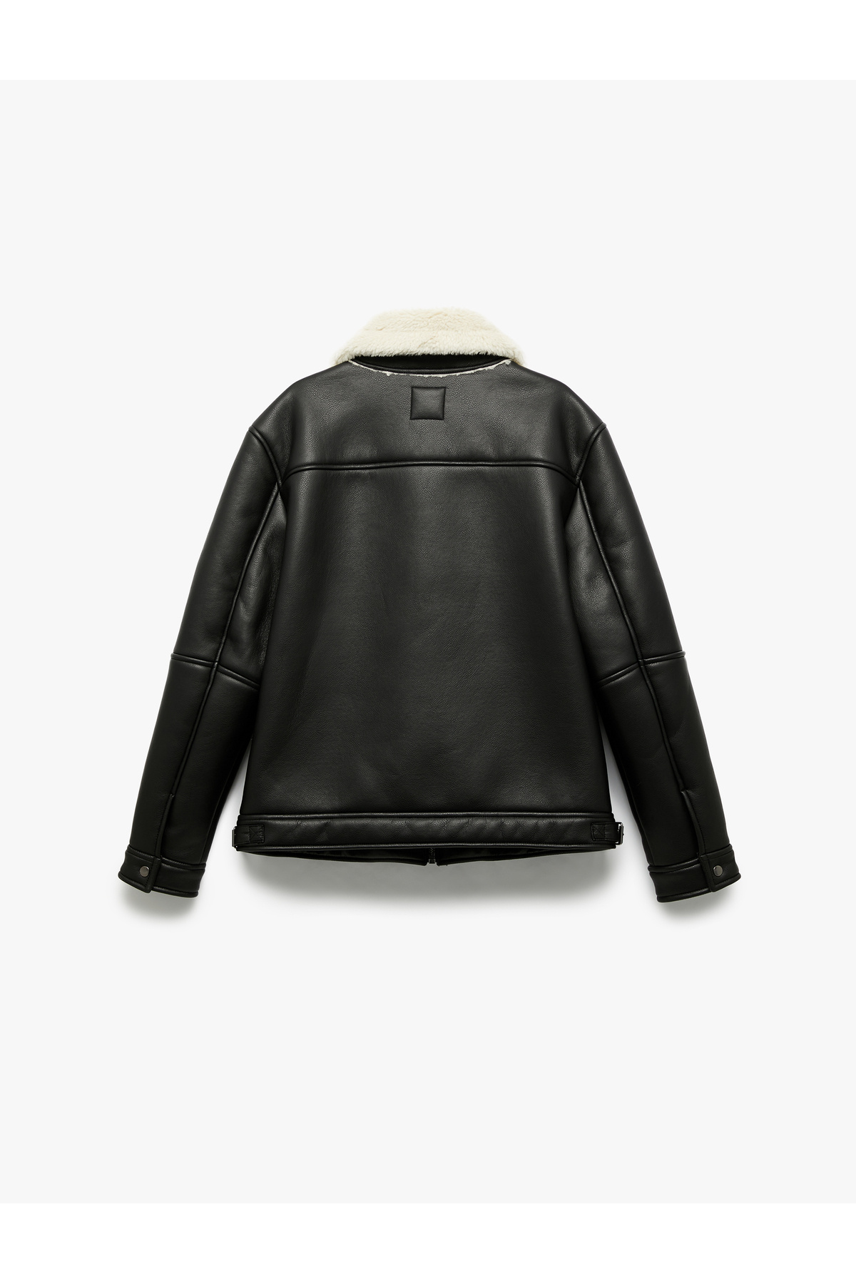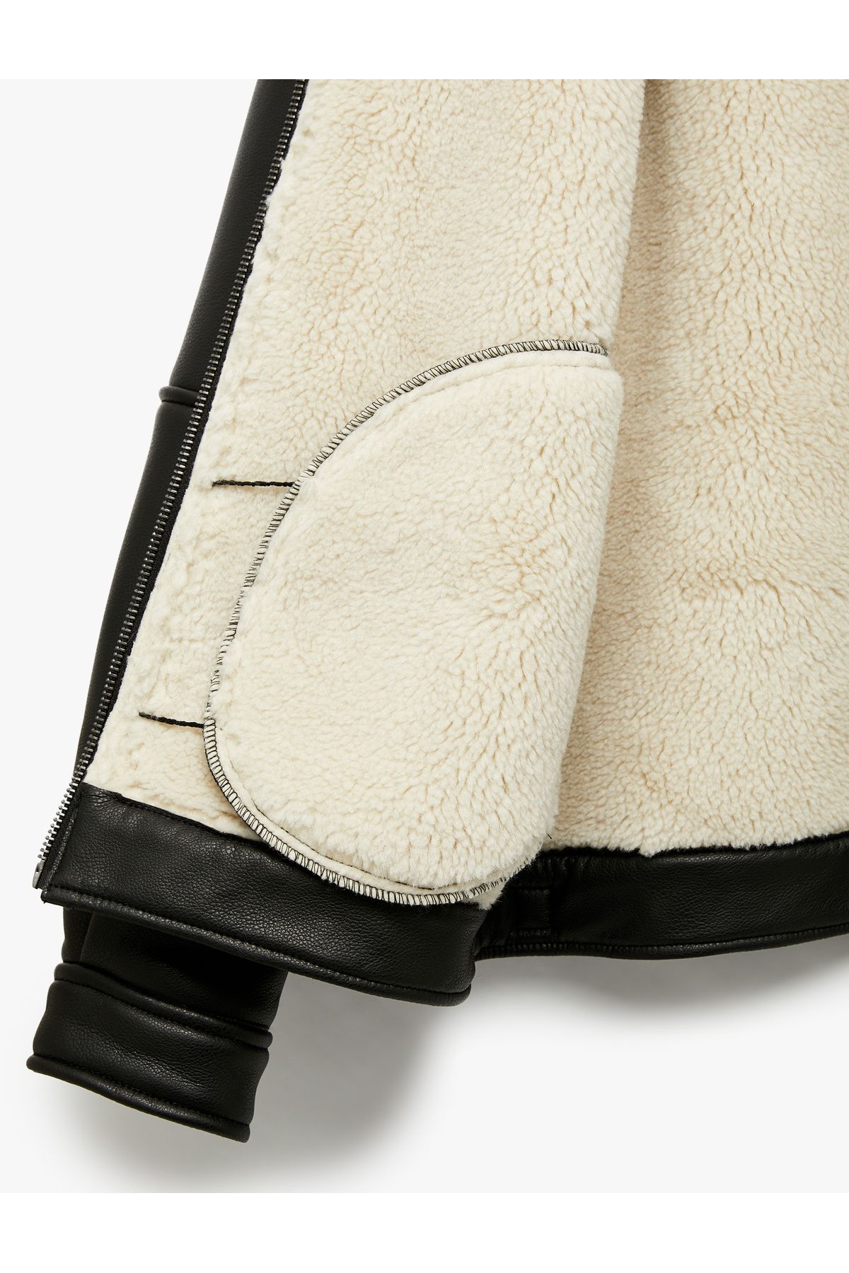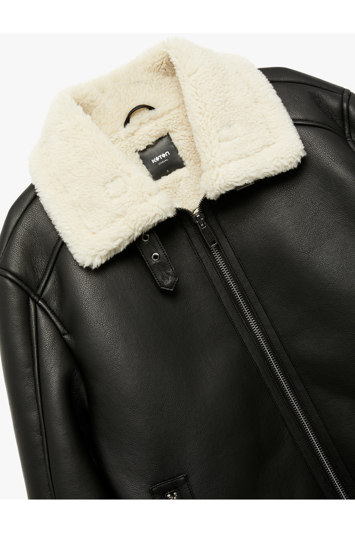 Uzun Kollu Cep Detaylı Fermuarlı Peluş Yaka Suni Deri Ceket