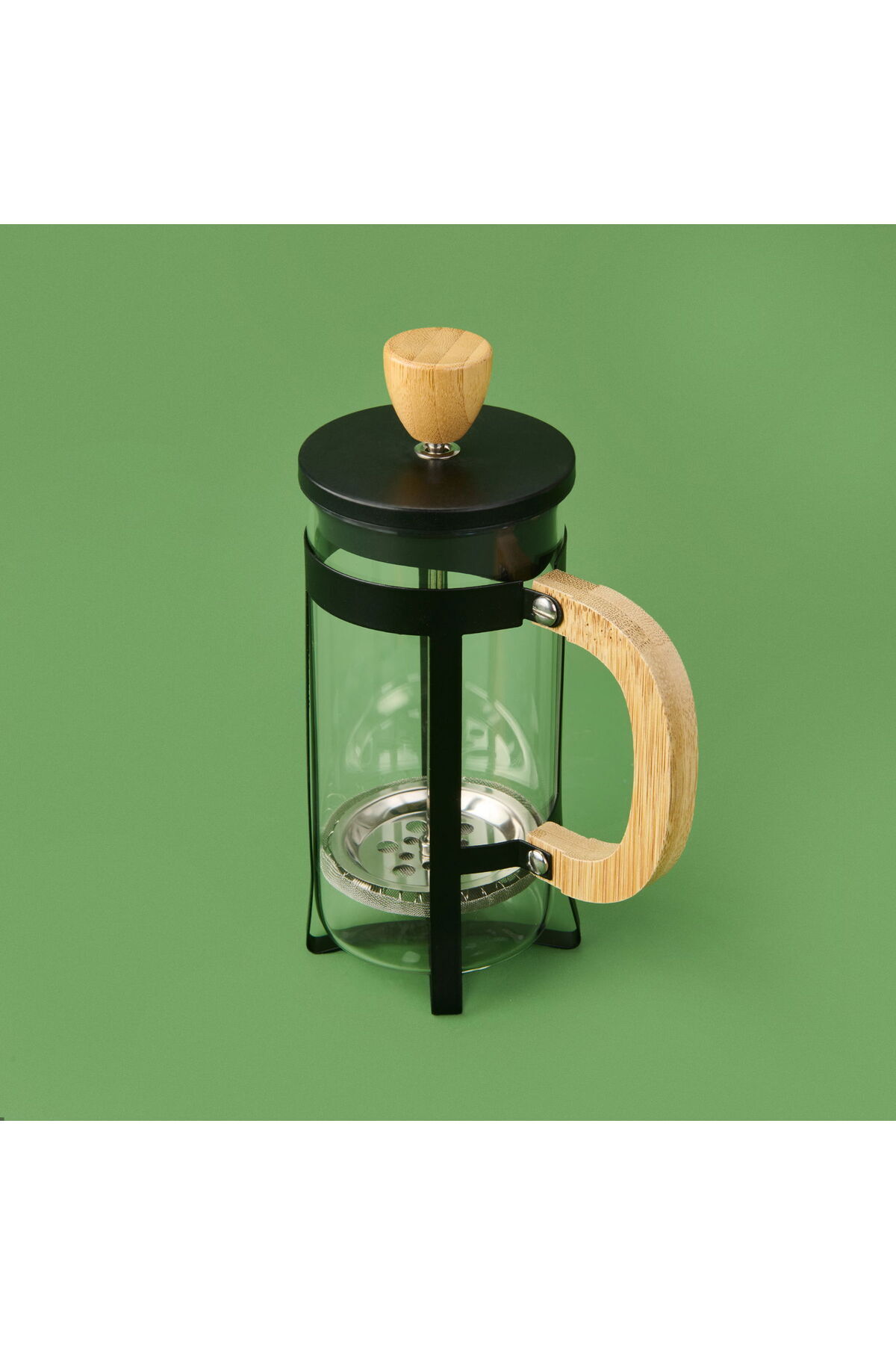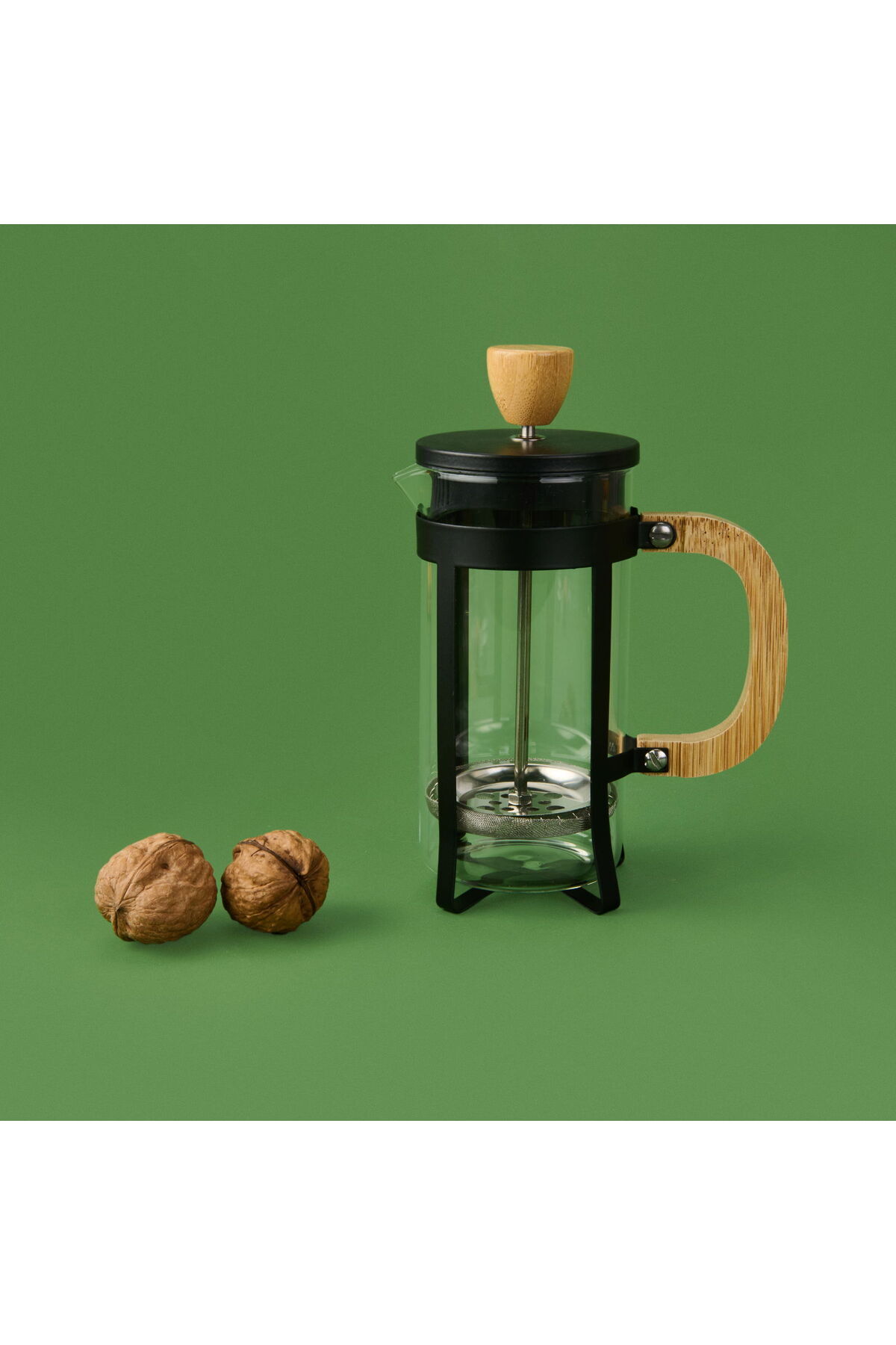 Modern cam tasarımı ve bambu kapağıyla hem işlevsel hem de estetik bir kahve demleme deneyimi sunar.