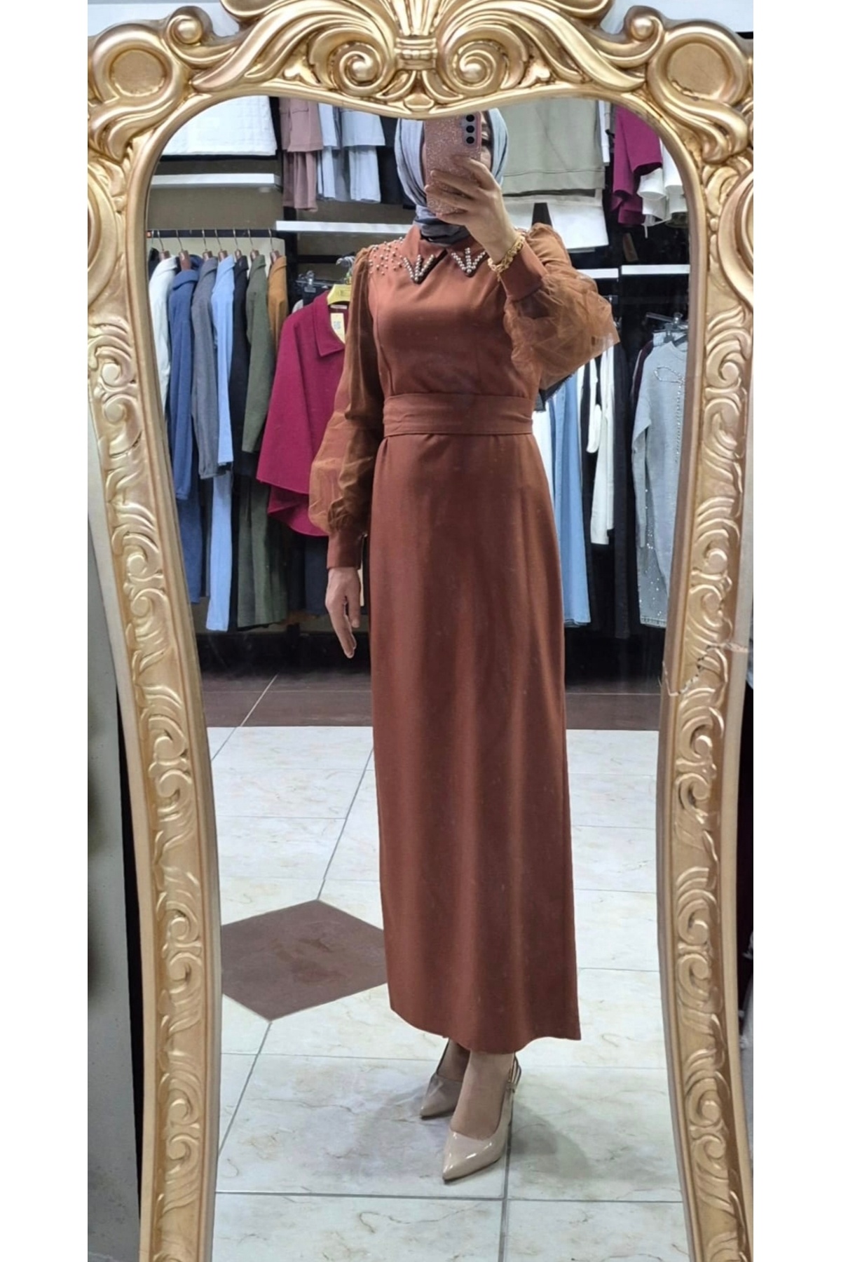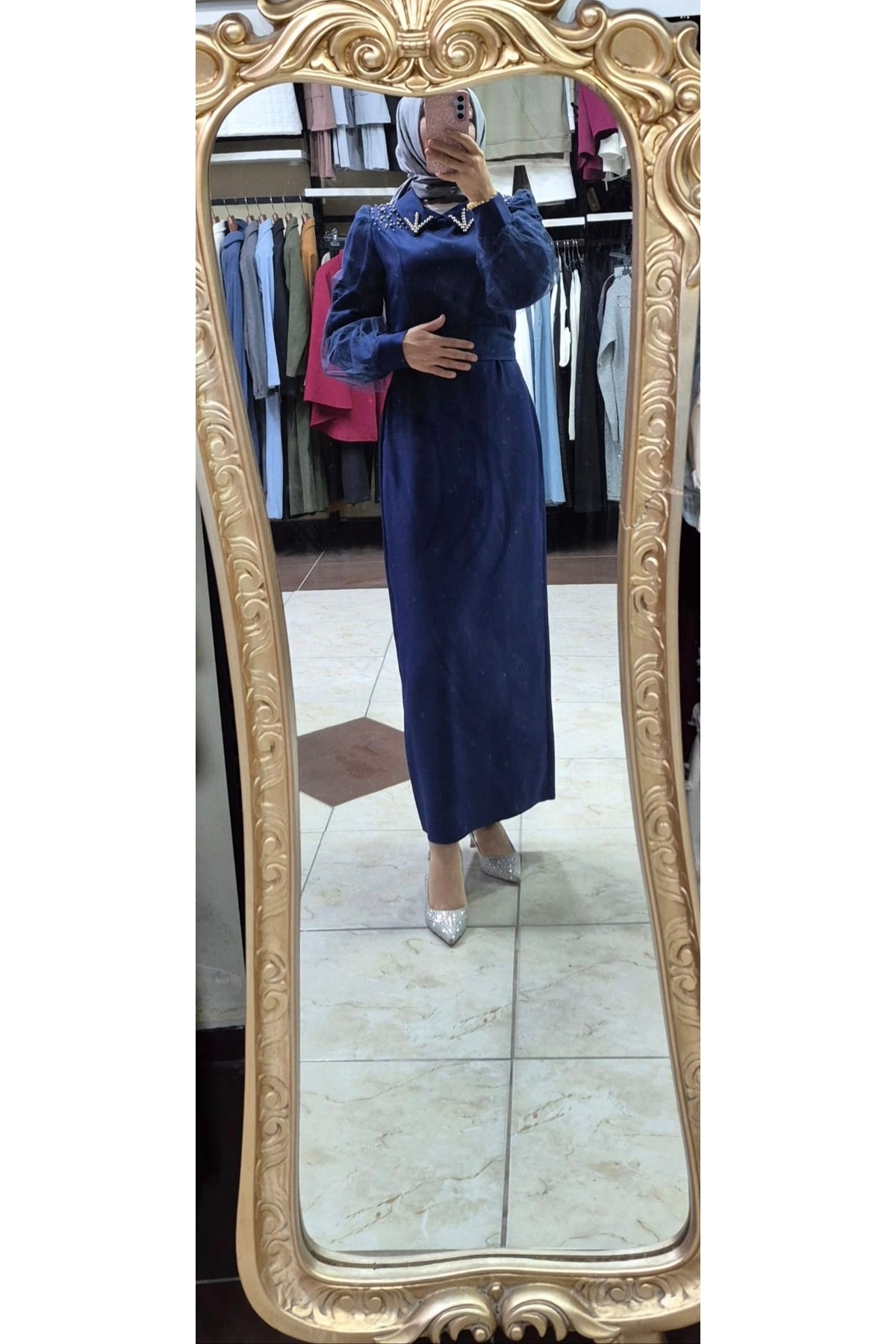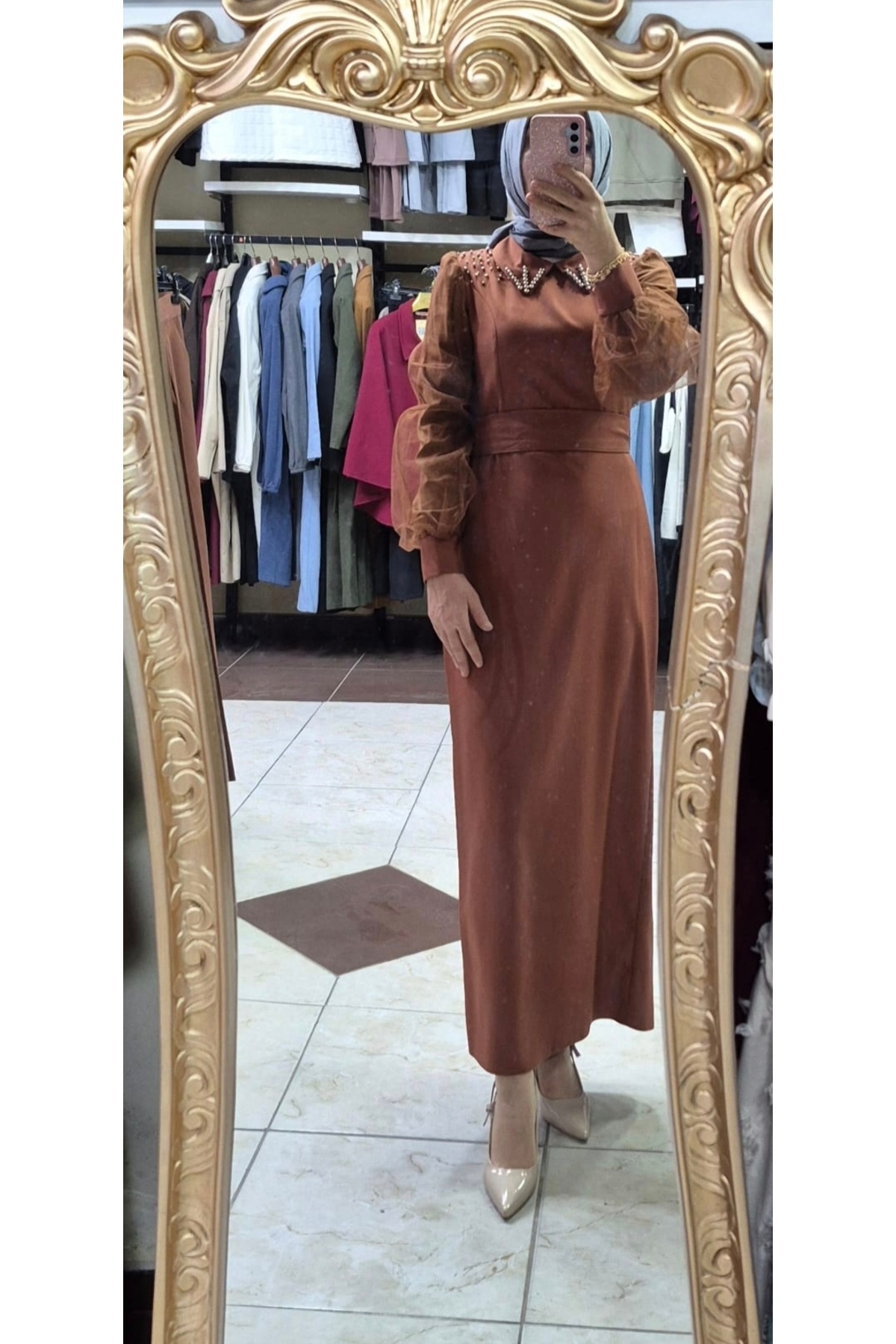 Ürünün kolu tül yakası İnci detaylı örme krep abiye elbise Boy 135 cm