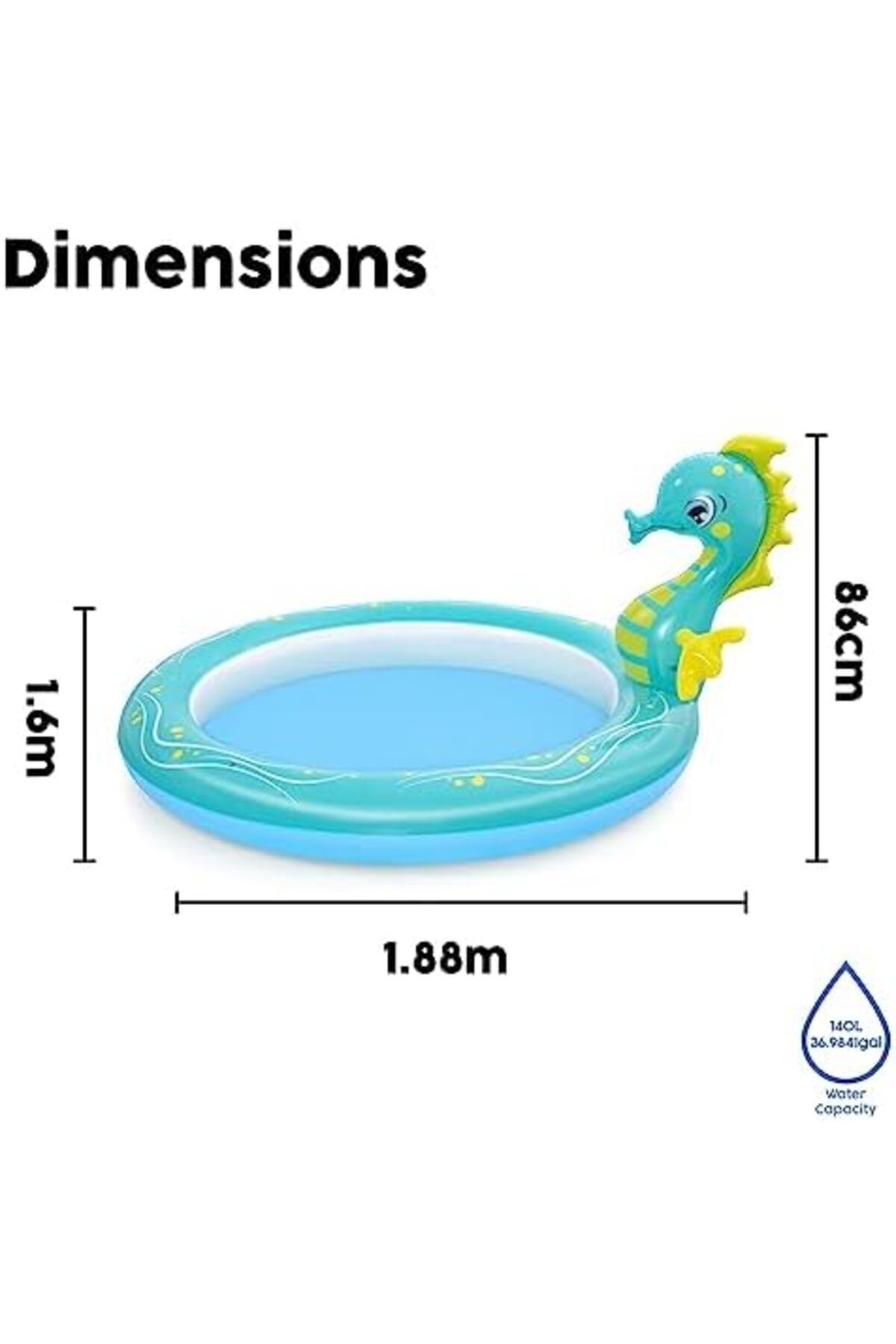 Boyutlar: 188 X 160 X 86 cm Denizatı Tasarımı Dayanıklı PVC Su kapasitesi: 140 litre, su fıskiyesi İçerik: 1 çocuk havuzu, 1 onarım yaması Denizatı Çocuk Havuzu, 1.88m x 1.60m x 86cm Denizatı Çocuk Havuzu, 1.88m x 1.60m x 86cm