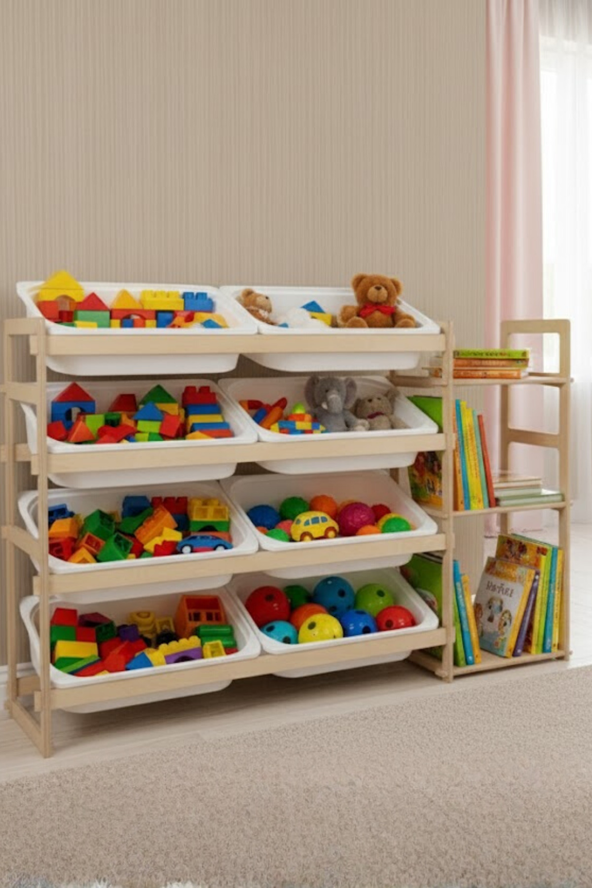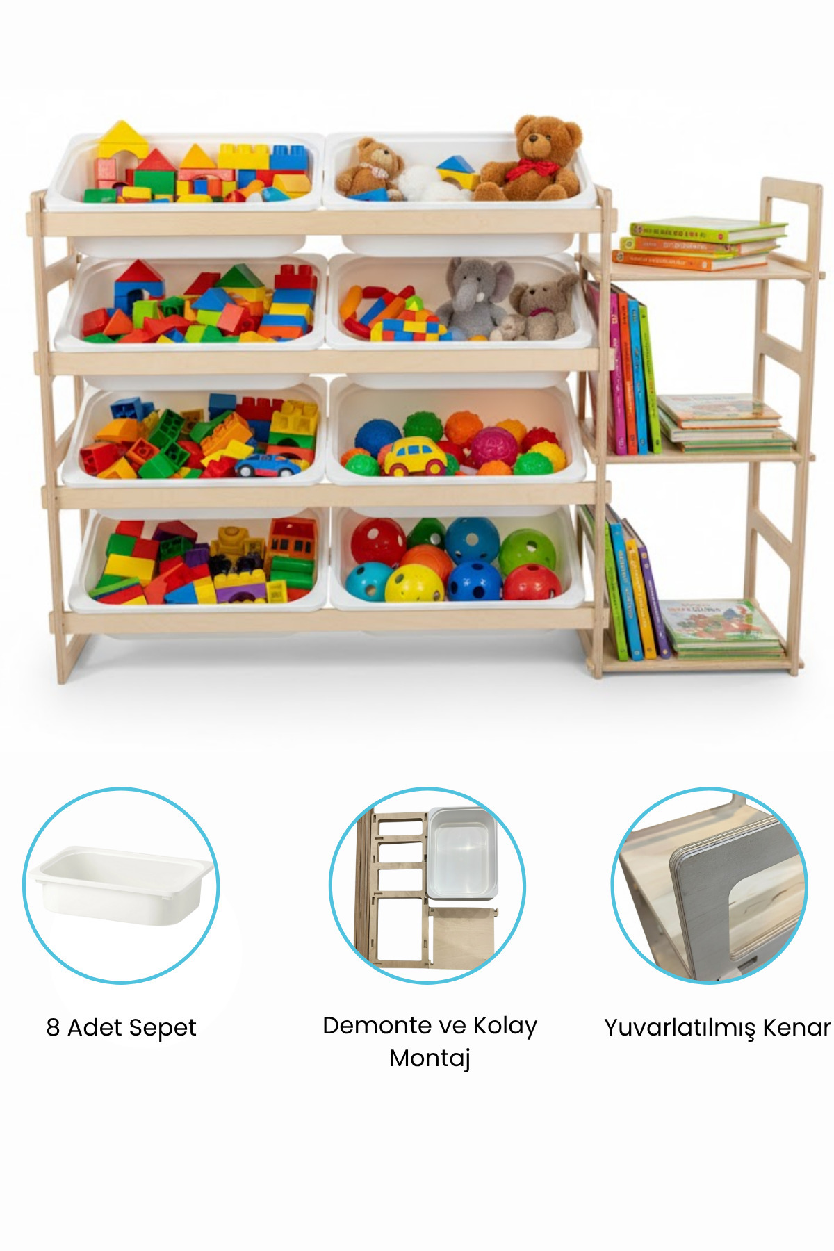 4 + 3 Raflı 8 Sepetli Kitaplıklı Oyuncak Dolabı 119x80x30 cm - Çocuk Odası, Oyun Odası, Kreş